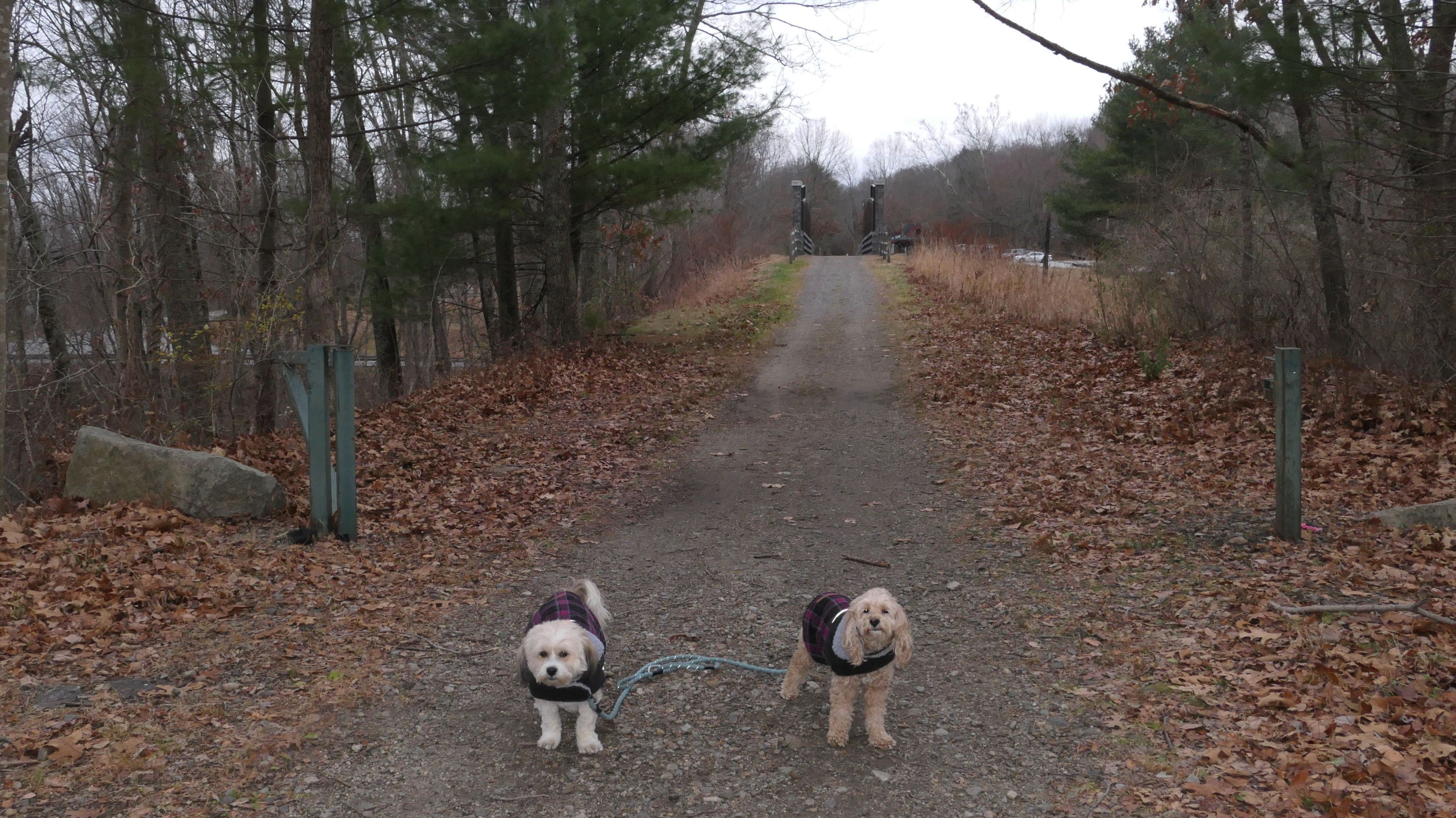 I decided to re-visit the Air Line Trail, the longest multi-town, multi-use trail in Connecticut. We've walked bits and pieces of it in the past, but still have a ways to go to complete the entire trail. This is a 2.5 mile section from the Pomfret Town Hall to the old Pomfret Station. We actually attempted this section once before, but it was too muddy that time, and we turned around after a half mile. It was pretty dry for this walk, but there was one muddy spot near Pomfret Station that I had to carry the dogs over. This trail is not that exciting, but the photo with the horses is pretty cool, and there was an interesting art installation at the Pomfret Station trail head. The weather was dreary and we completed our five mile out and back walk just before it started to rain.
