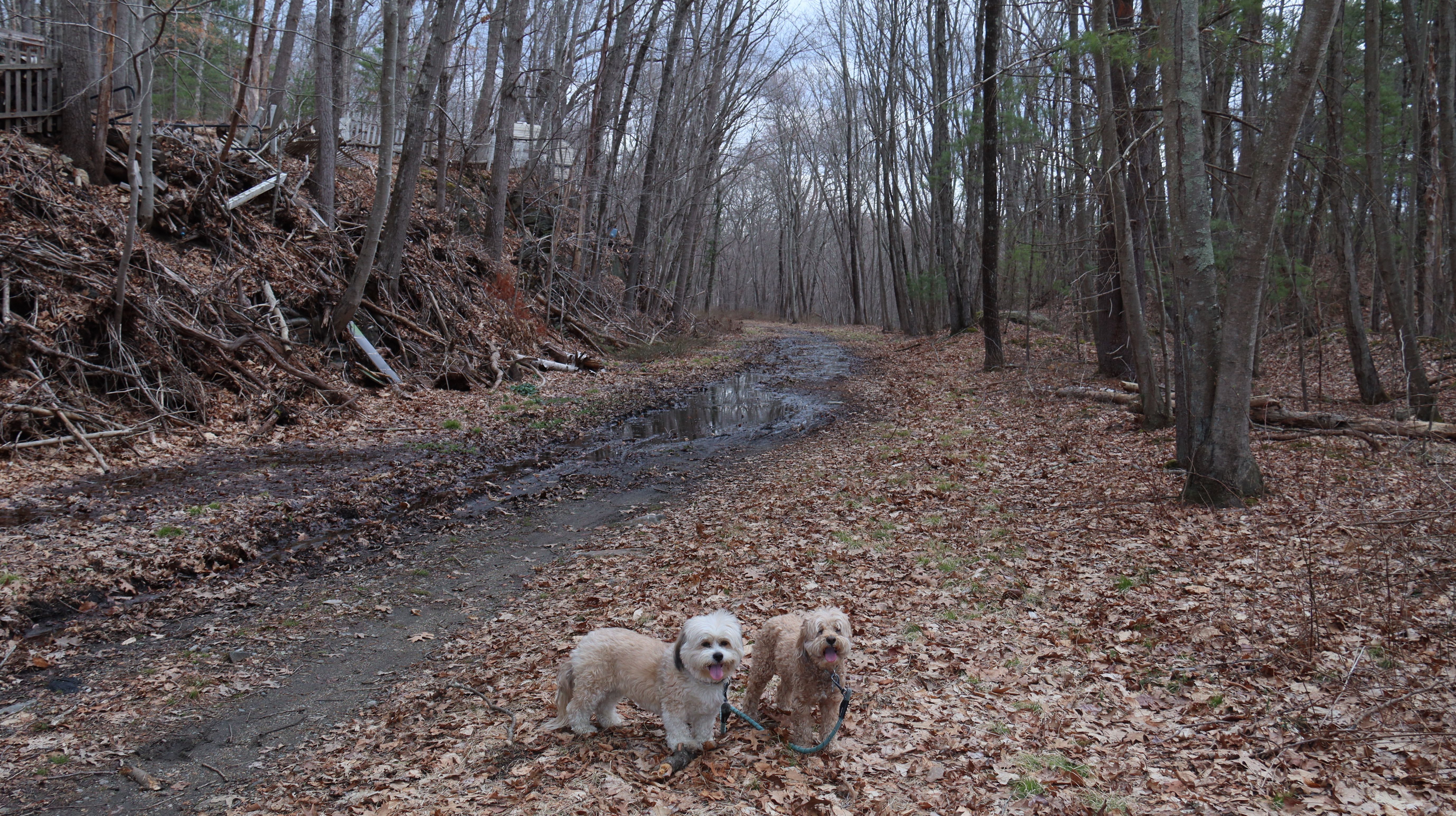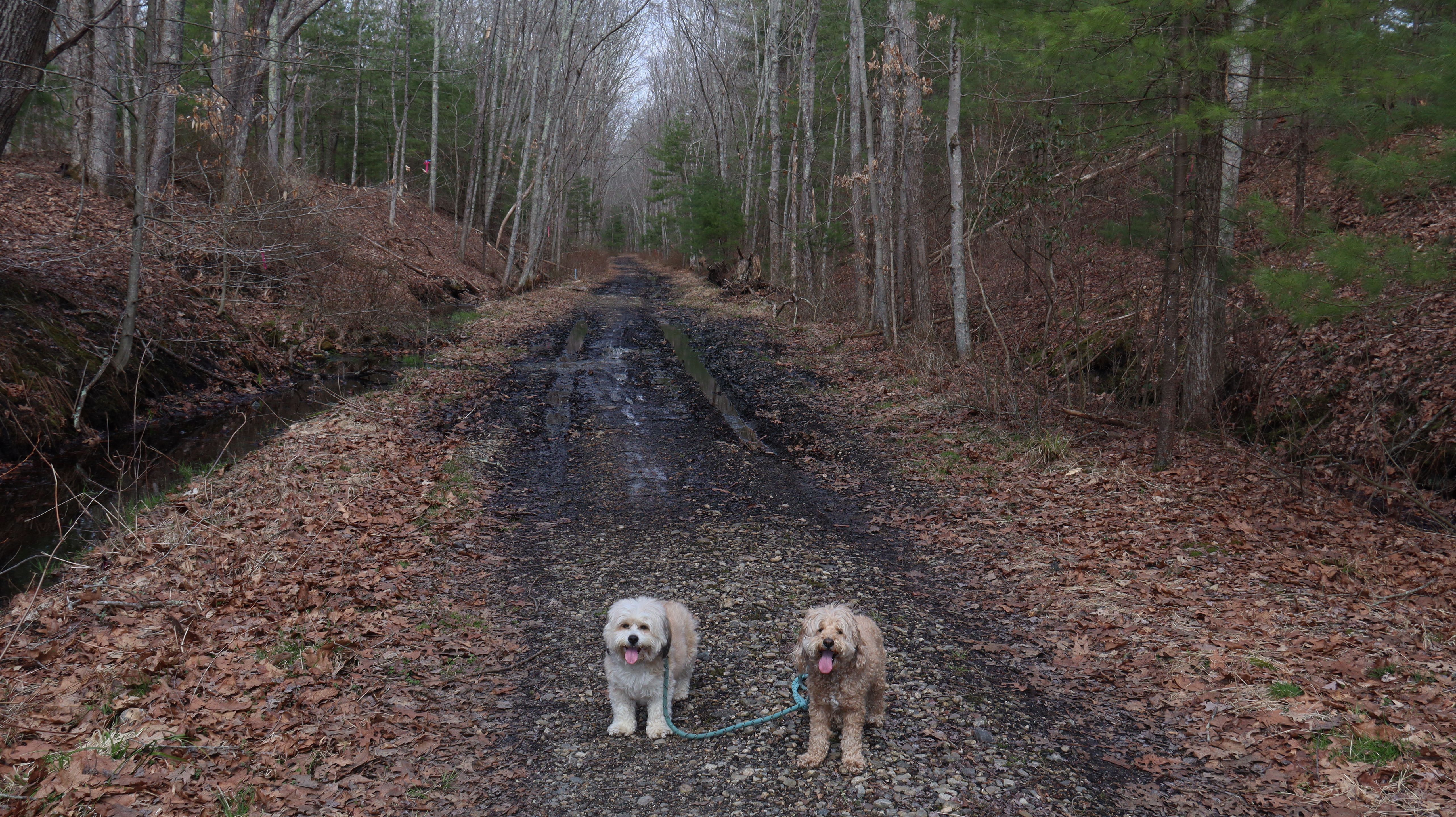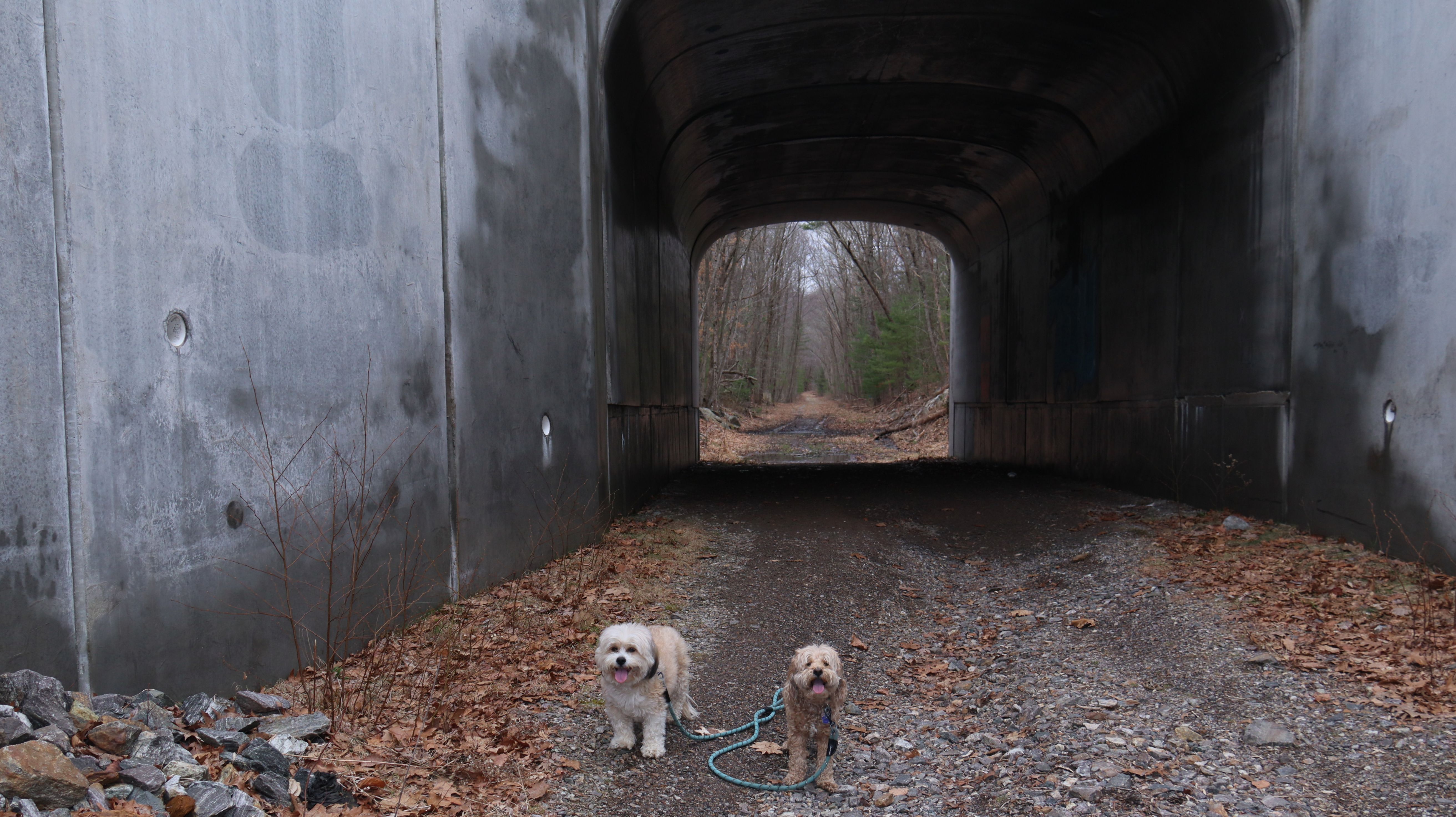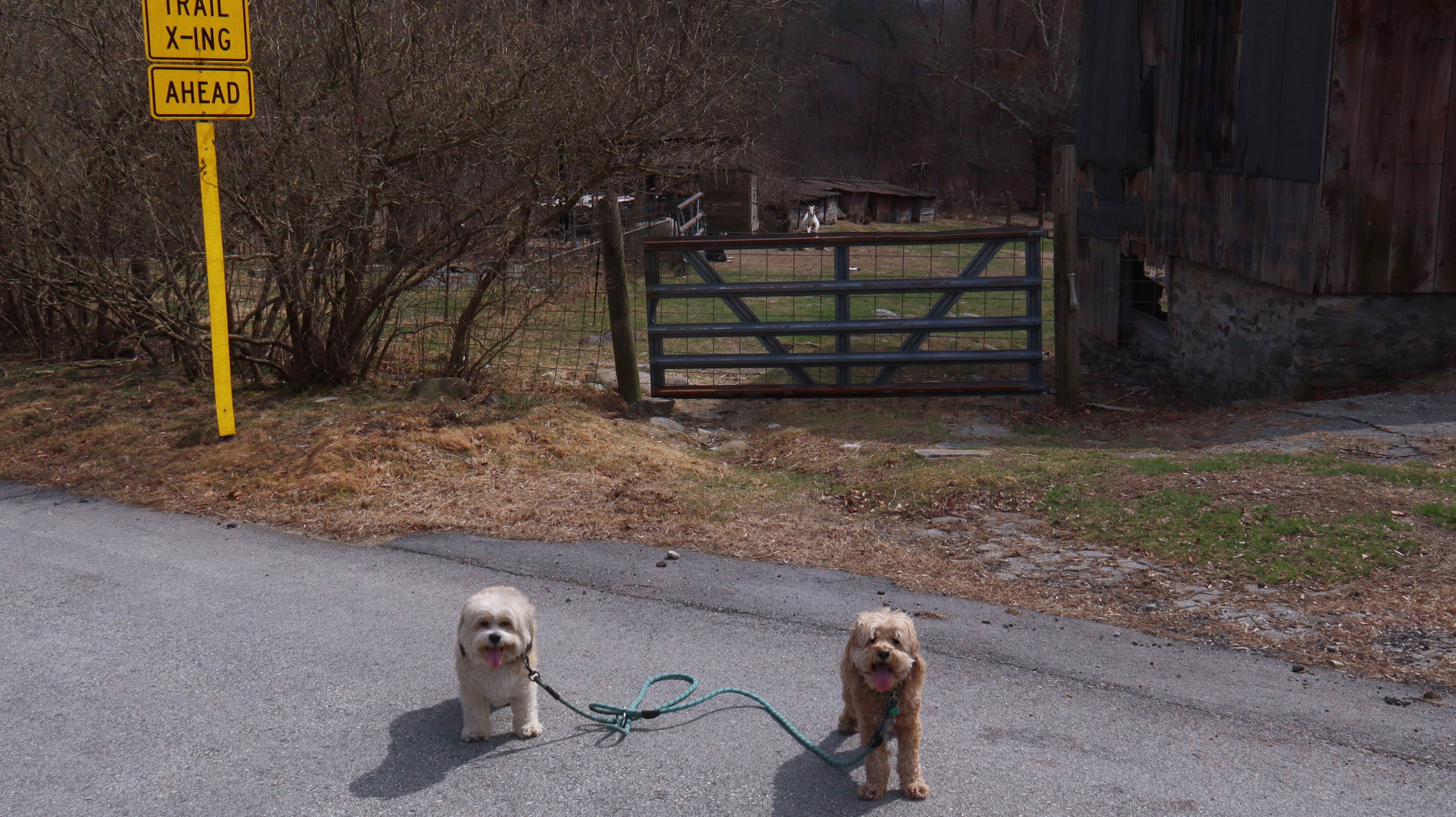 We started at the Town Farm Road trailhead and headed southwest to the Moduck Road Bridge where we had turned around on our previous visit. This section was quite muddy in spots, and I had to carry the dogs through some of the mud puddles. On the way back from the Moduck Road Bridge, we took a detour around the River Road tunnel and walked back to where we started via River Road and Town Farm Road. We tried to continue along the trail northwest of Town Farm Road, but it was completely flooded and impassable, so we didn't get very far. We wound up walking only a total of 2.5 miles. It was warm and humid, but a dreary day. It started to pour shortly after we left, so maybe it was a good thing we weren't able to continue on the trail. The highlight of this walk was the farm near where we parked with some very curious goats!