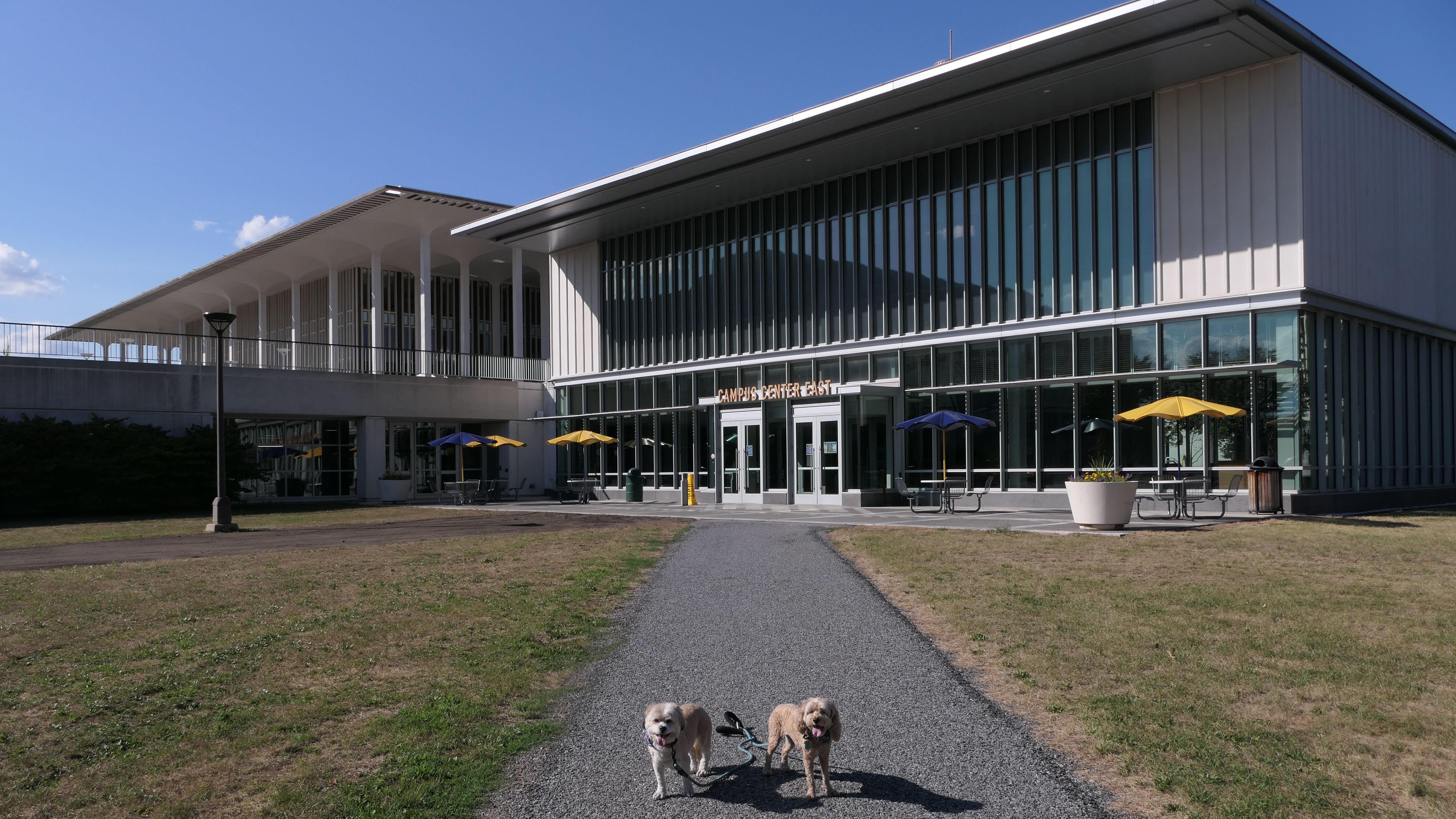 Mandy and Lexi's collegiate tour continues at the "University at Albany - State University of New York". We covered a good portion of the campus on our 3.5 mile walk, including the section with most of the athletic fields that is actually in the town of Guilderland. The architecture of the buildings reminded me of the nearby Empire State Plaza. It has that "this is what they thought was modern in the 1960's" look to it. The campus loves their fountains! The highlight of the walk was the three different fountains. Pets are not allowed in the large fountain area in the middle of the Campus Center, so we took the a photo from up above it. Our walk also included the short stone dust "Parker Pond Path", a loop trail around the pond. The campus made for a nice walk on a beautiful August evening.