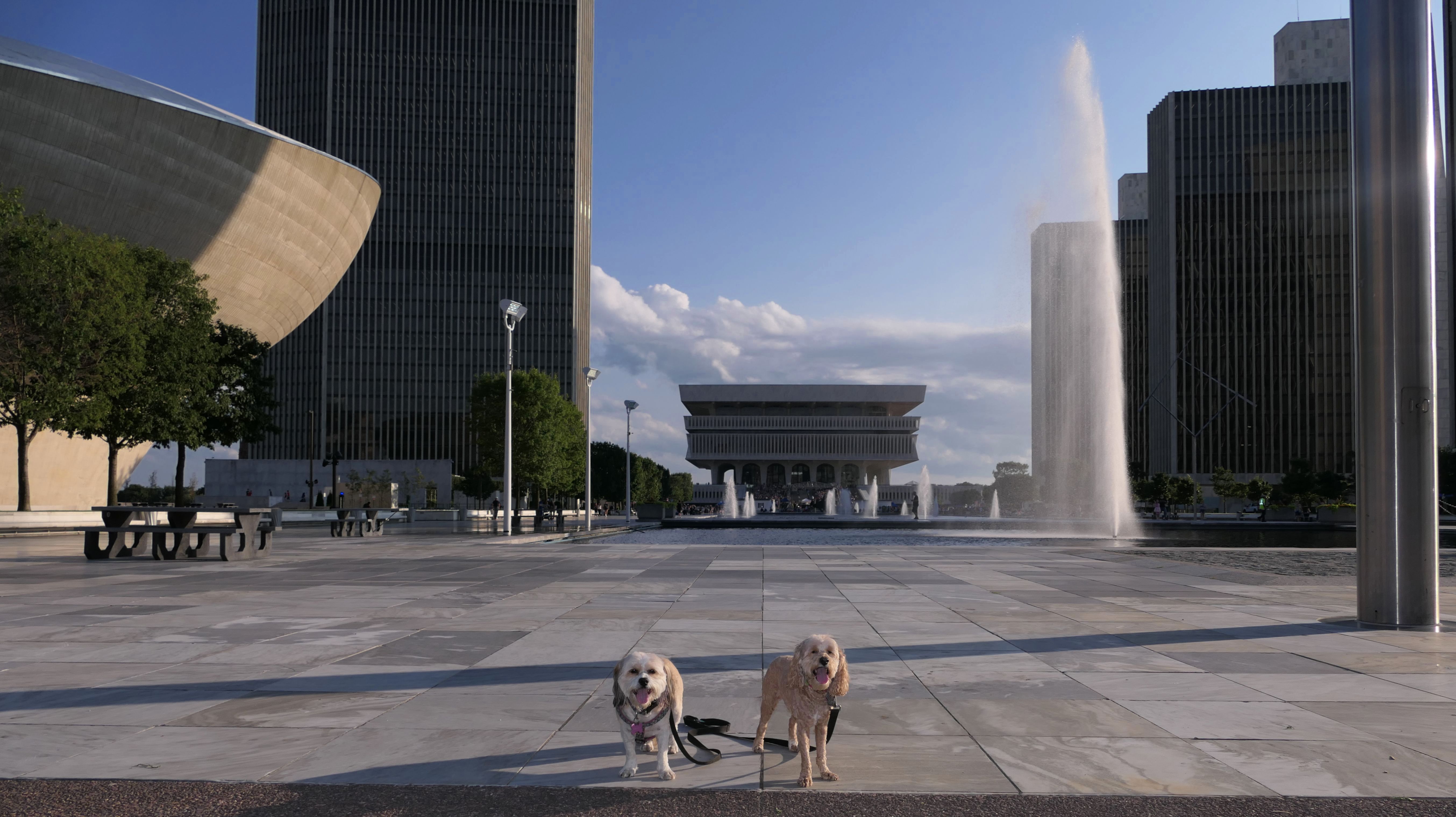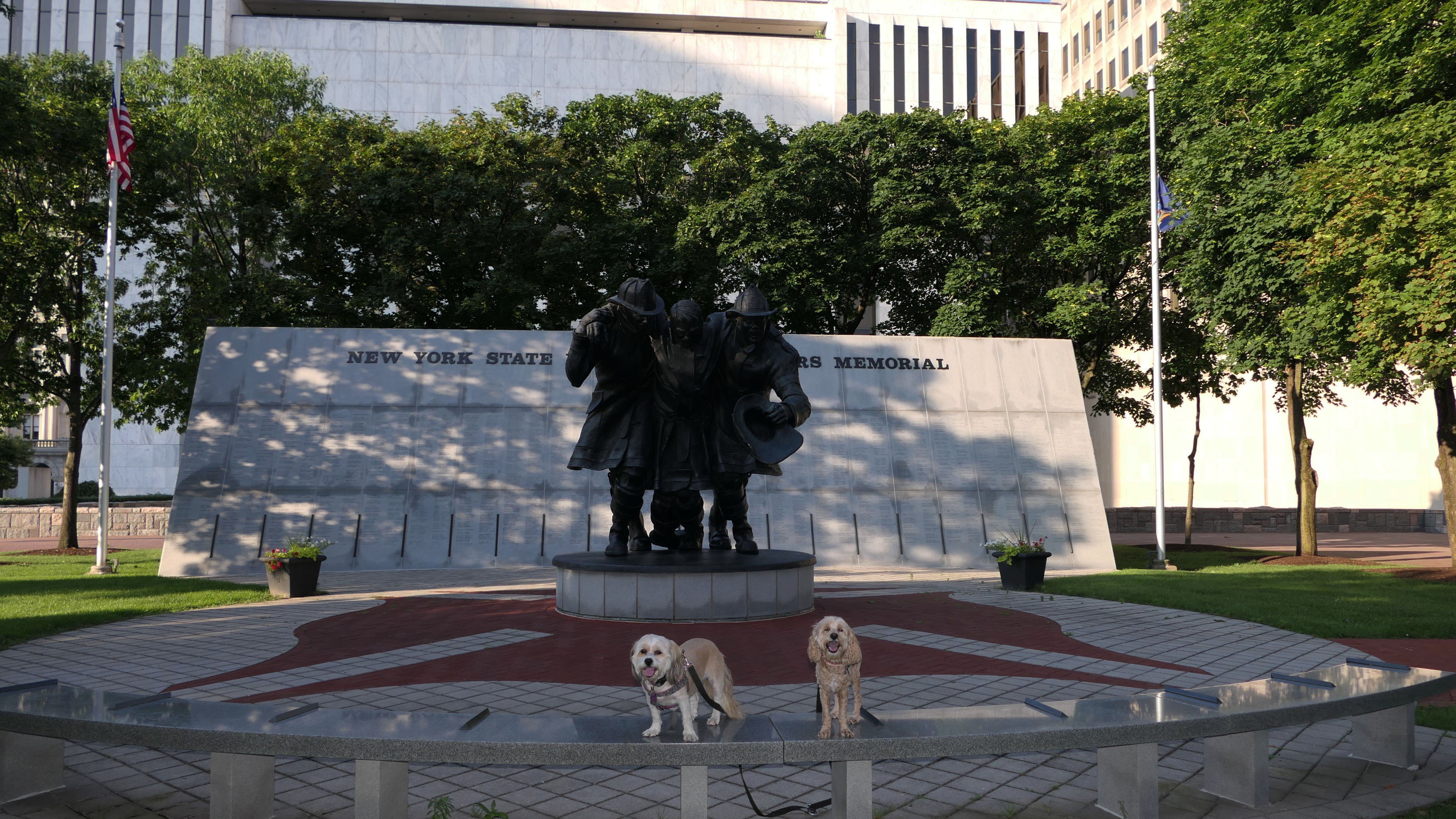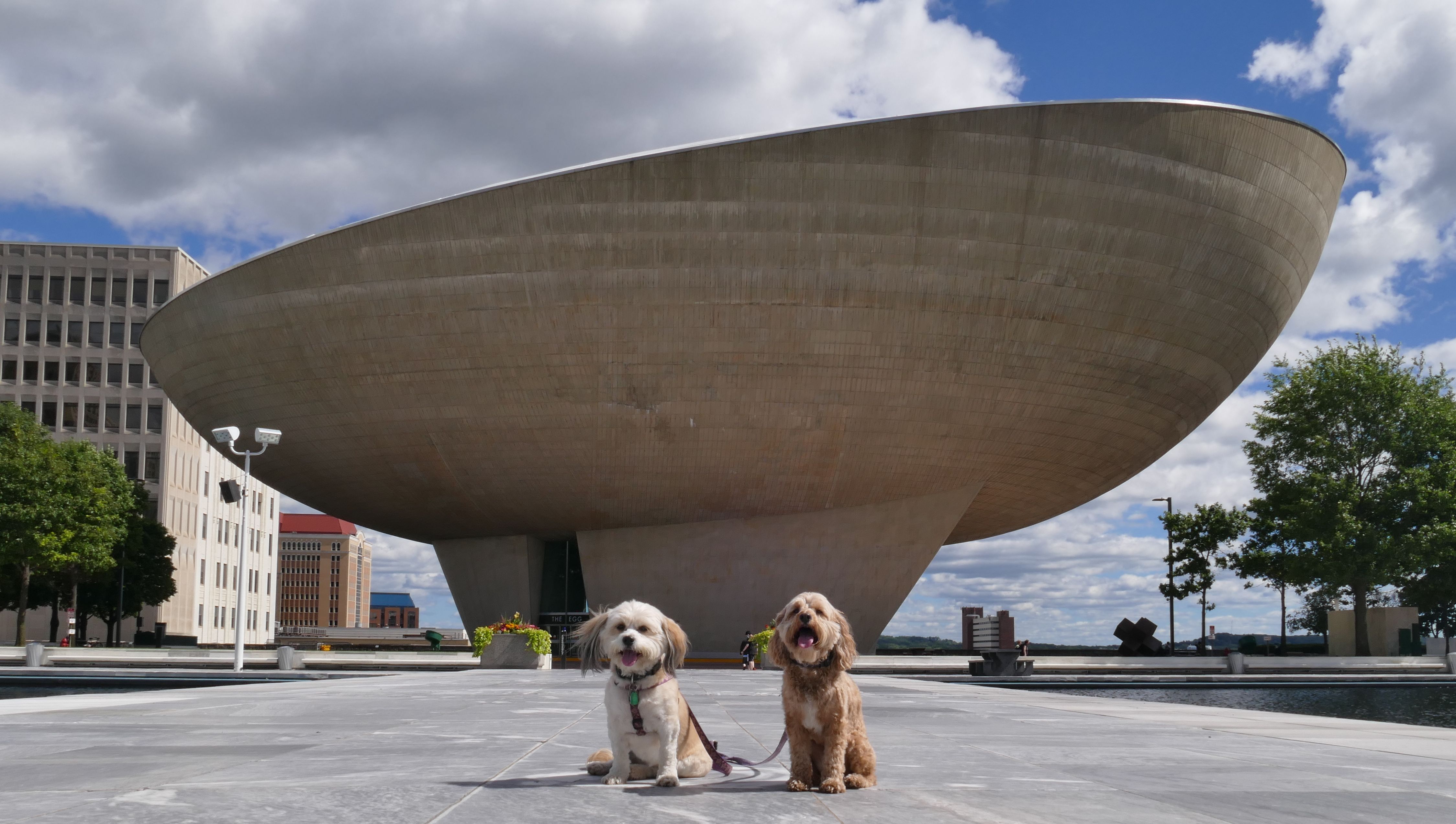This was one of my favorite trips! I love The Egg! It is my favorite concert venue. I think I miss concerts the most during COVID. Not only is The Egg a great concert venue, Empire State Plaza is a great place. The buildings, the plaza and the sculptures all look so sleek. The dogs were super cooperative with the photos that day too. They seemed generally happy to be there.