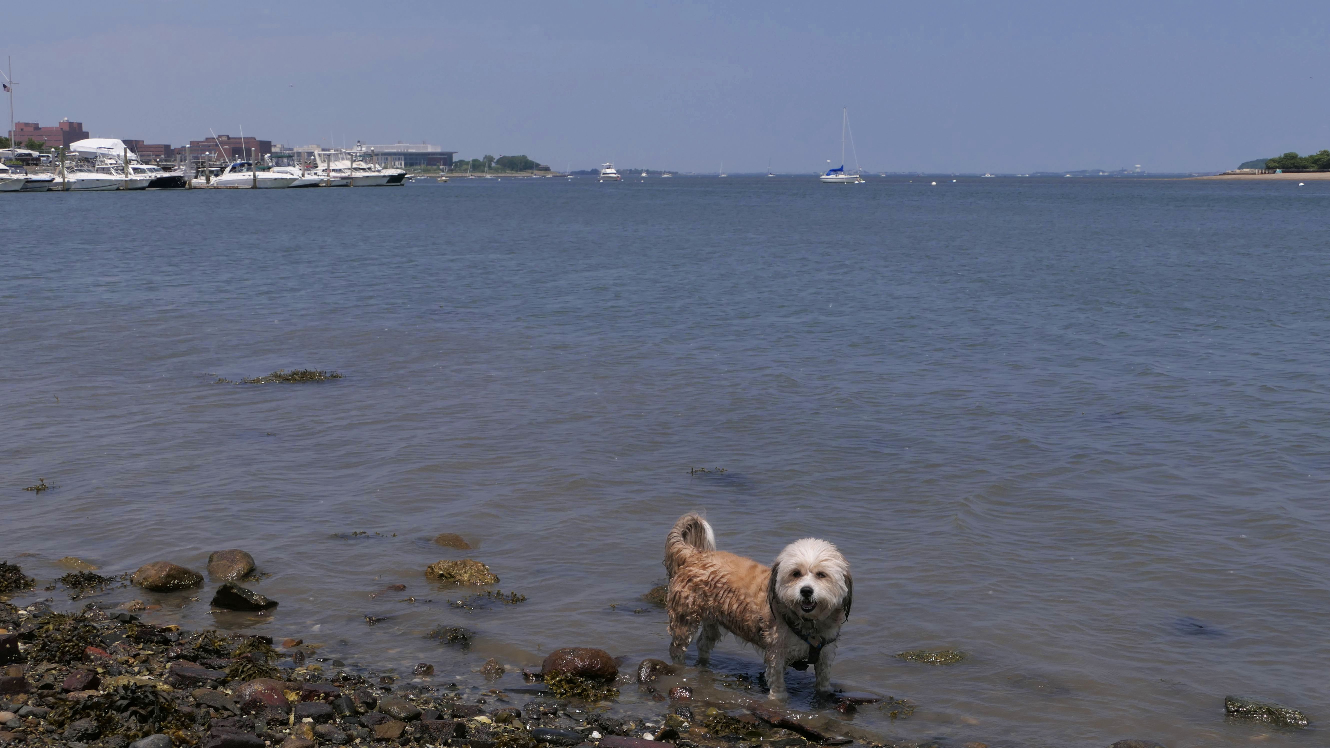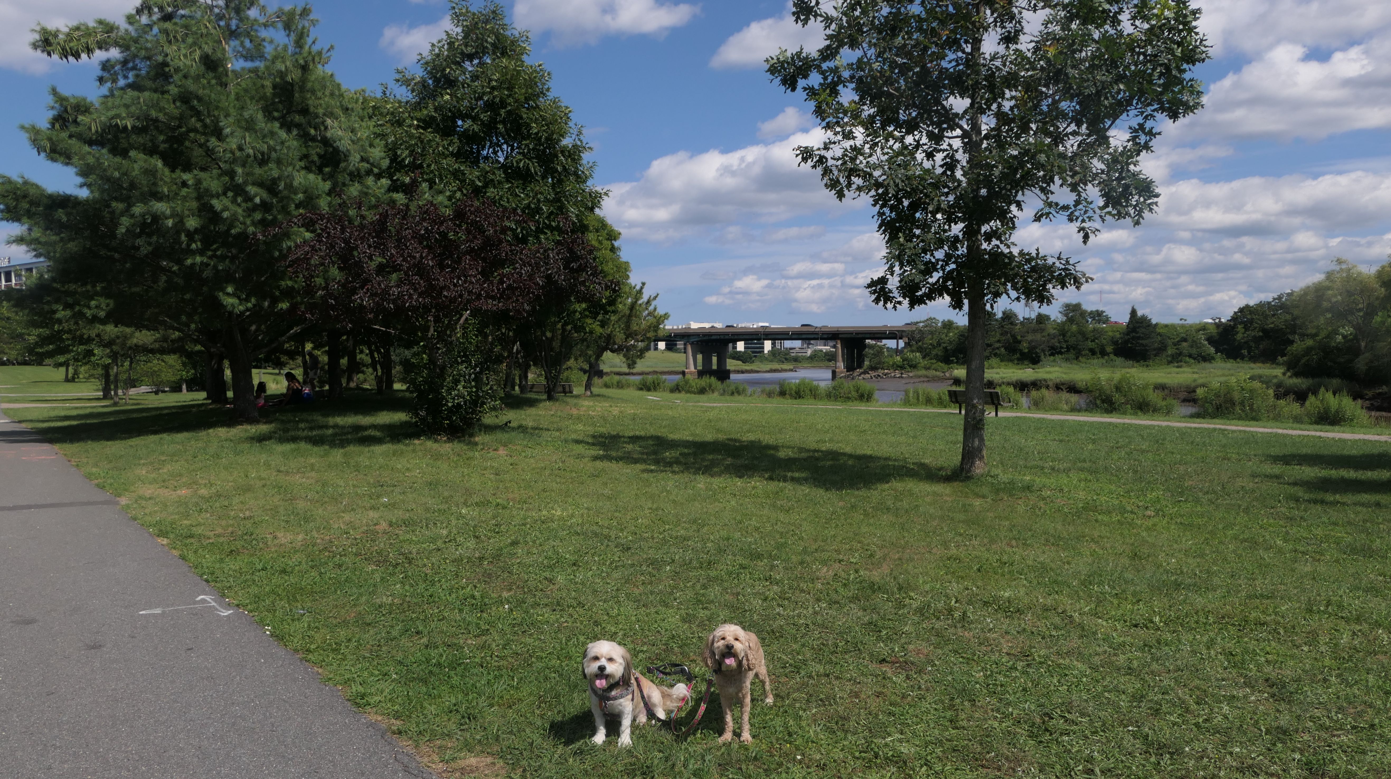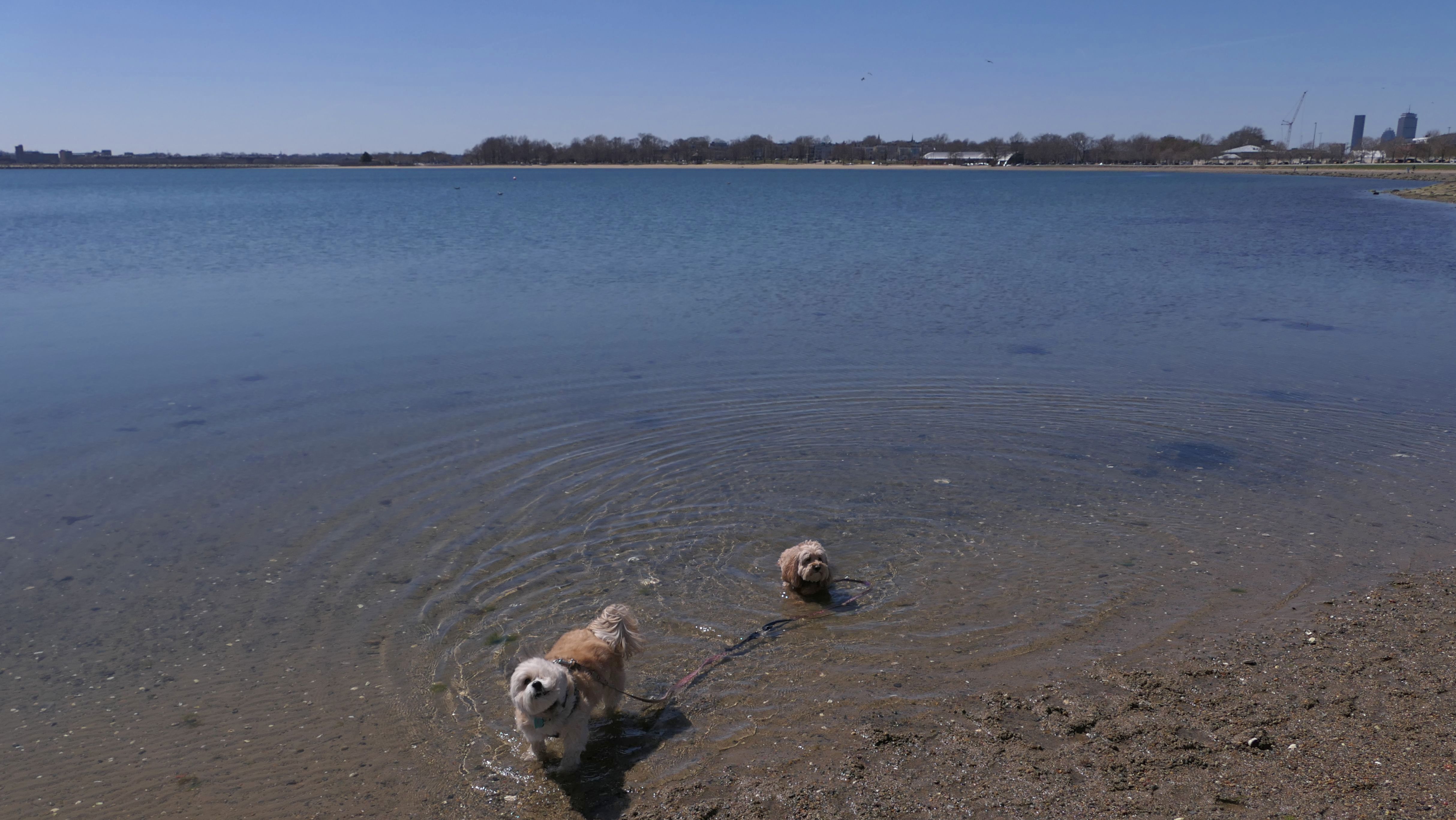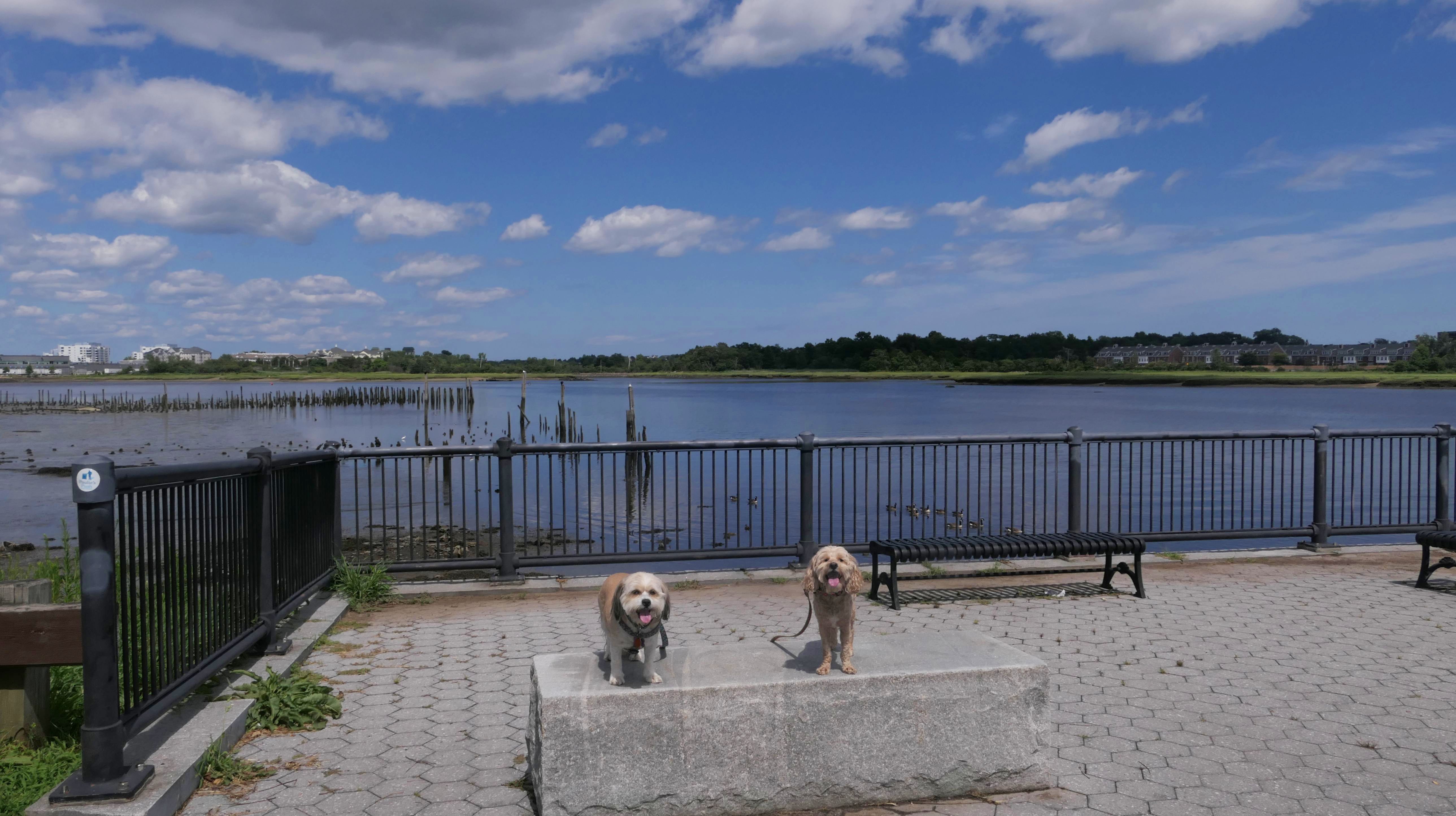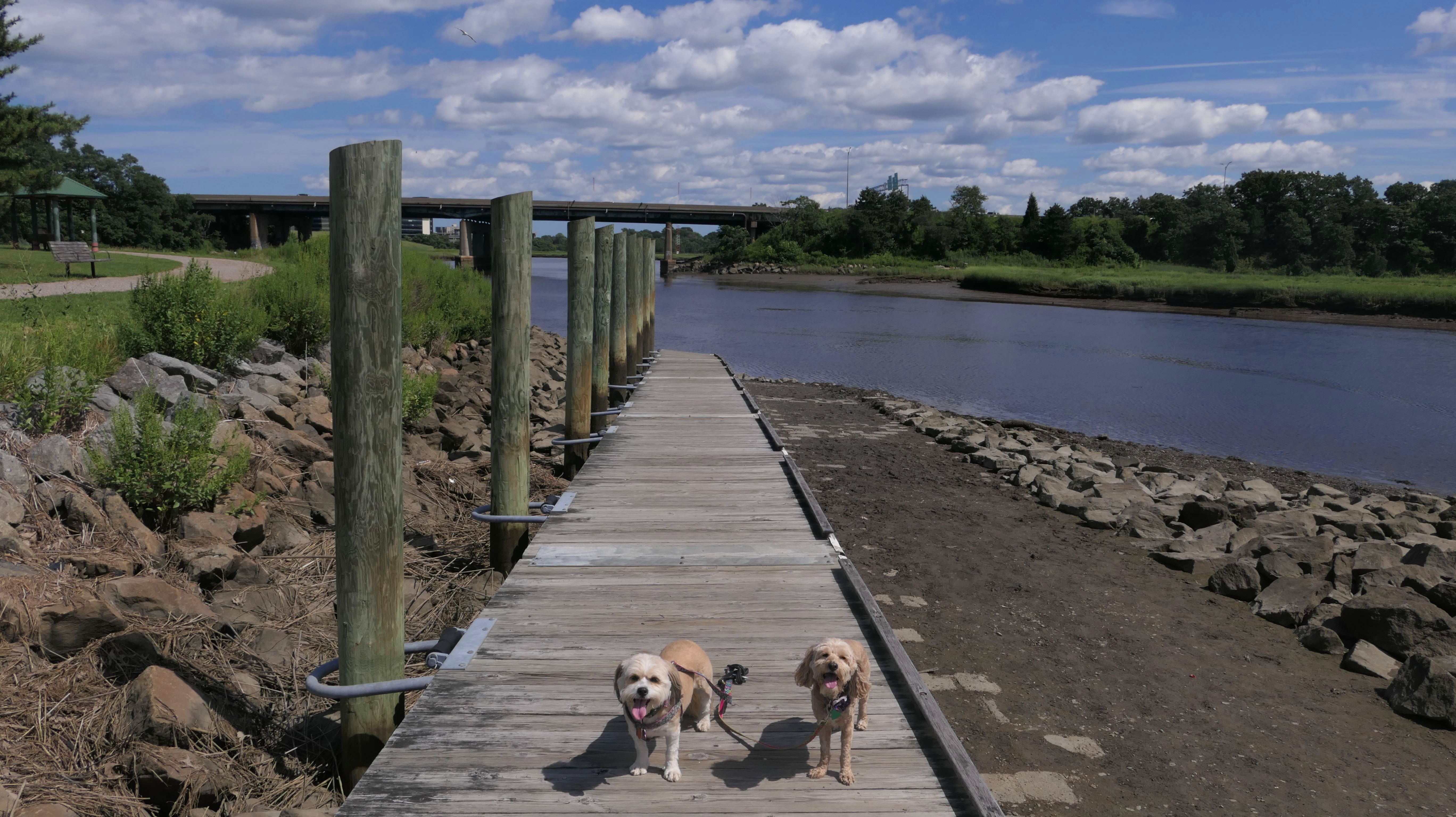 Also known as "Victory Park", this park sits on a small peninsula accessed via a short trail. It is used these days as an off-leash dog park, and a place where dogs can go swimming. There was record heat in Boston on this day, so Mandy and Lexi went straight for the water! The area that overlooks I-93 isn't that nice, but on the other side of the peninsula, views are better. You can see out to Squantum Point Park in Quincy, which is another dog-friendly area we've visited before, and a bit nicer than this one. We were joined here by a dog-walker who had five dogs with him, so Mandy and Lexi got to socialize a bit here too. This place isn't terrible, and the dogs enjoyed the water.