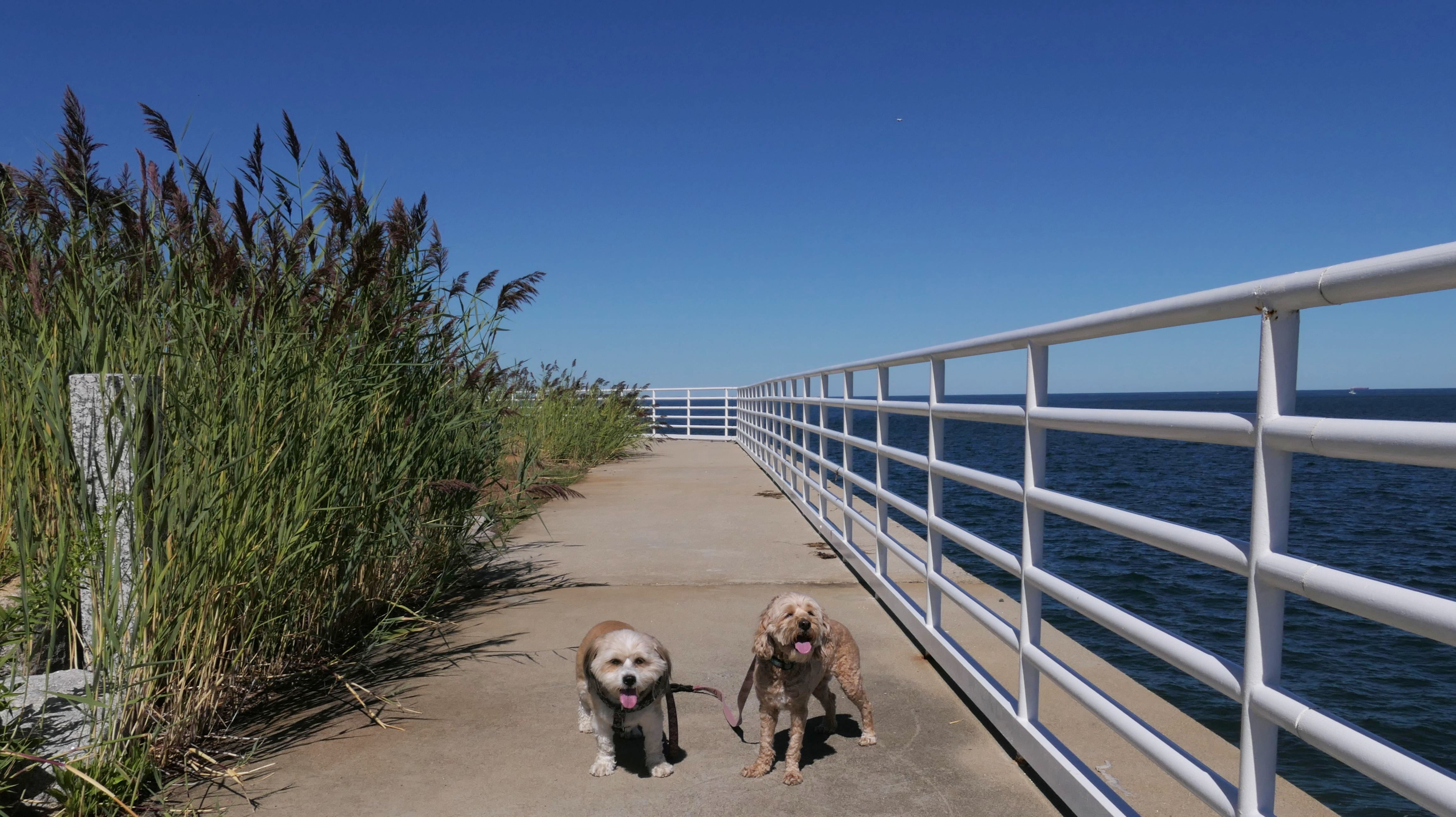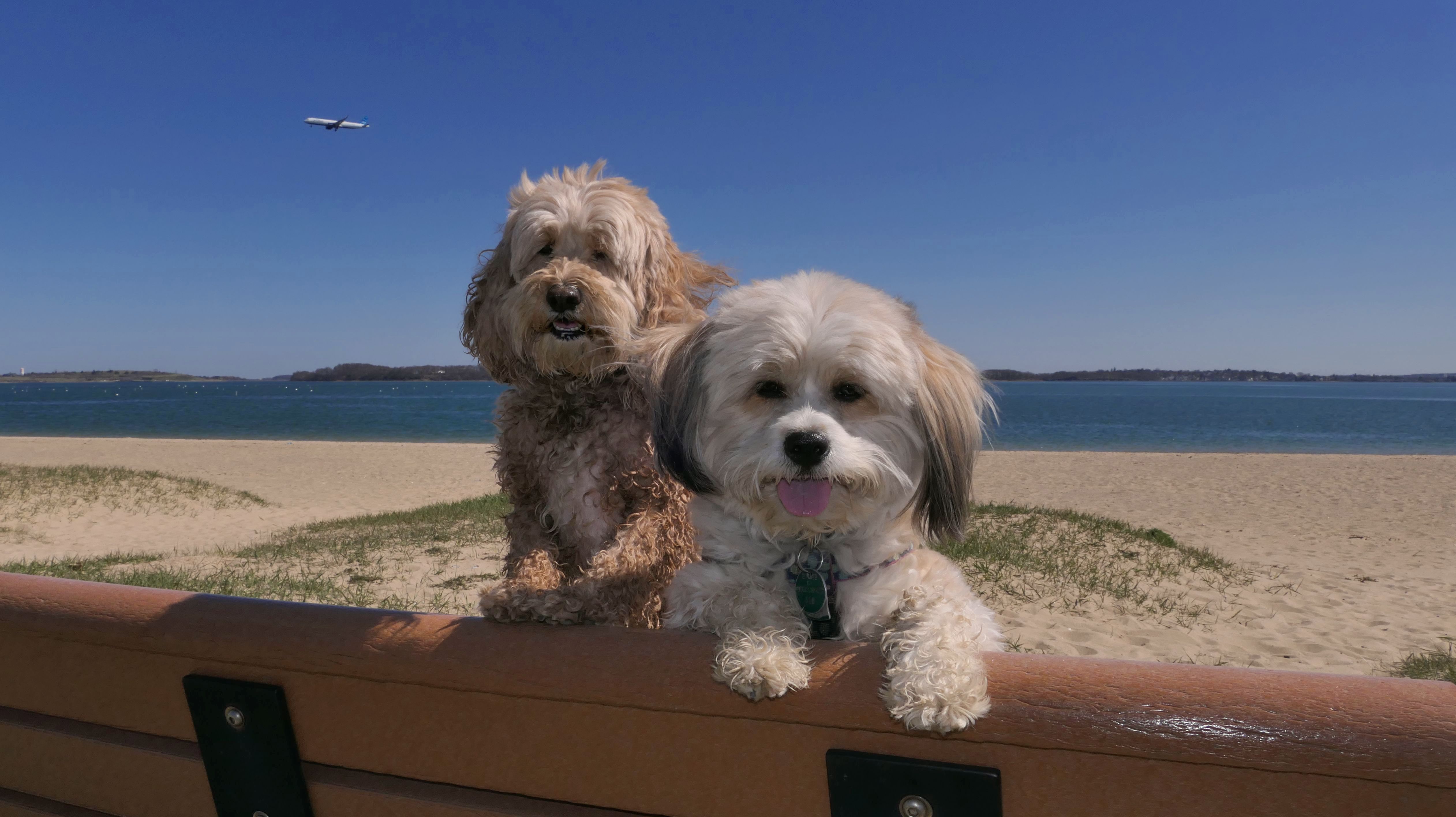 This was a wonderful trip! This place is pretty cool, and it was a spectacular day weather wise! First of all, despite it's name, it's not really an island. It was at one point, but the channel between Winthrop and Deer Island was filled in by the hurricane of 1938. Now it's a peninsula connected to Winthrop, but technically part of Boston. Two thirds of the island hosts the Deer Island Waste Water Treatment Plant, and the rest of the island is a public park. We walked the Harborwalk Trail that loops the perimeter of the island. The trail offers fantastic views of Boston Harbor. It's also a great spot to watch planes take off from Logan Airport. There are plenty poop bag dispensers and garbage cans on the trail, and even a water bowl for the dogs at one spot. The grounds are kept very nice and clean. At the end of the loop is a small trail that connects to Point Shirley Beach in Winthrop. A small section of the beach is actually part of Deer Island. You can see the rest of the beach pictures on the Winthrop Page. The only downside to this trip was the terrible traffic driving back to Connecticut. It took over three hours. I'm sure the start of Labor Day weekend had something to do with it. Despite the traffic, it was a very fun trip with the dogs.