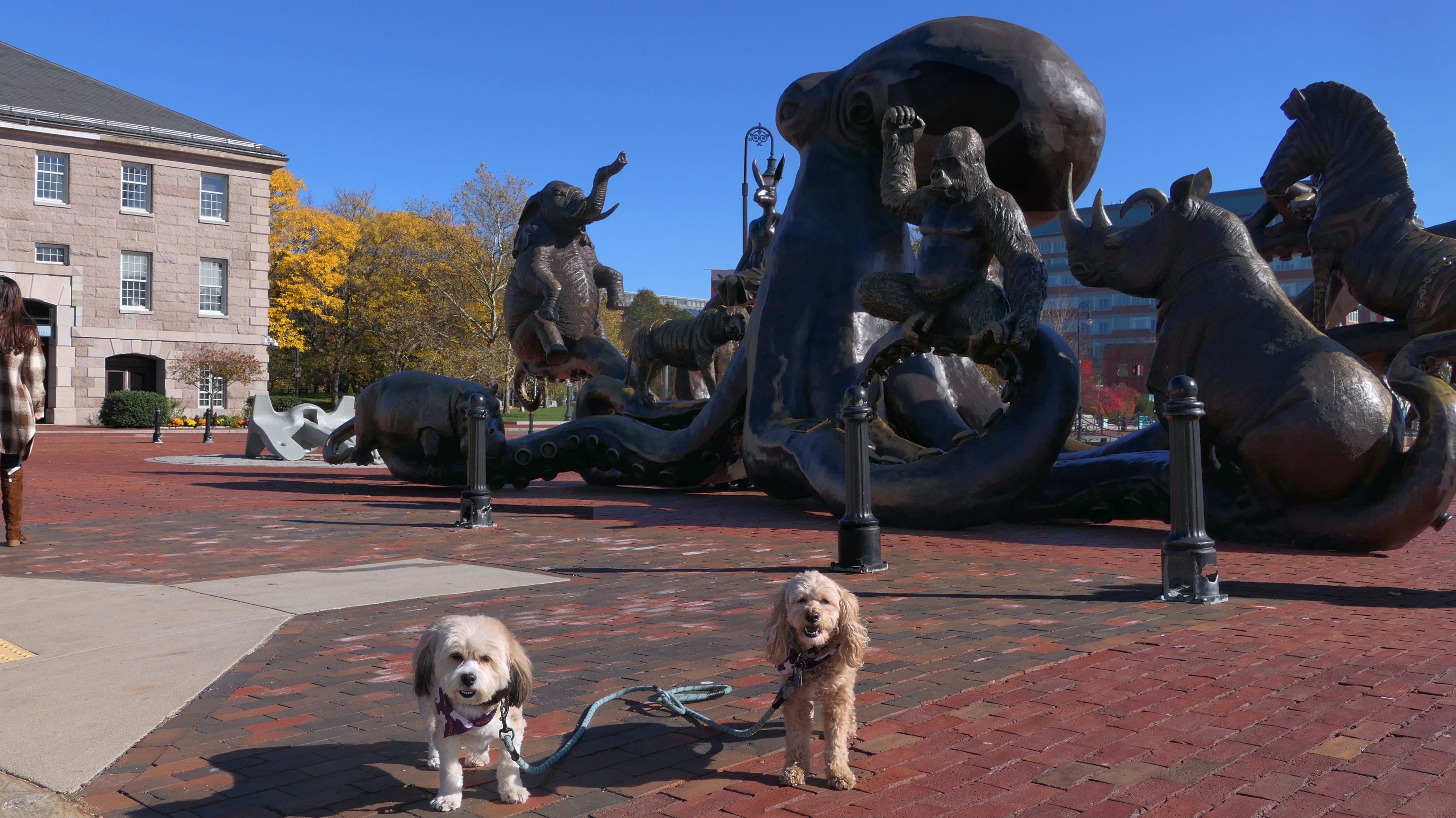 This was our first visit to the Charlestown neighborhood in Boston. The main attraction here is this park, a National Park on the site of an old Navy shipyard. Two ships are docked here, the USS Constitution built in 1797, and the USS Cassin Young, a 1943 World War II era destroyer. There is a museum here as well. Currently featured at the park are three statues from Gillie and Marc, similar to the ones we saw near the World Trade Center in 2024. We only saw two of the three statues, "The Arms of Friendship", which features a variety of animals sitting on a giant octopus, and "The Hippo was Hungry to Try New Things". We didn't catch the third statue which is somewhere under the Tobin Bridge. The park itself and the surrounding area is dog-friendly and there are some really nice spots to explore, including various piers, and a large fountain area with an outdoor bar. The majority of our adventure was spent in this park and the surrounding area, but we also walked through Constitution Plaza and Thomas Menino Park as well.