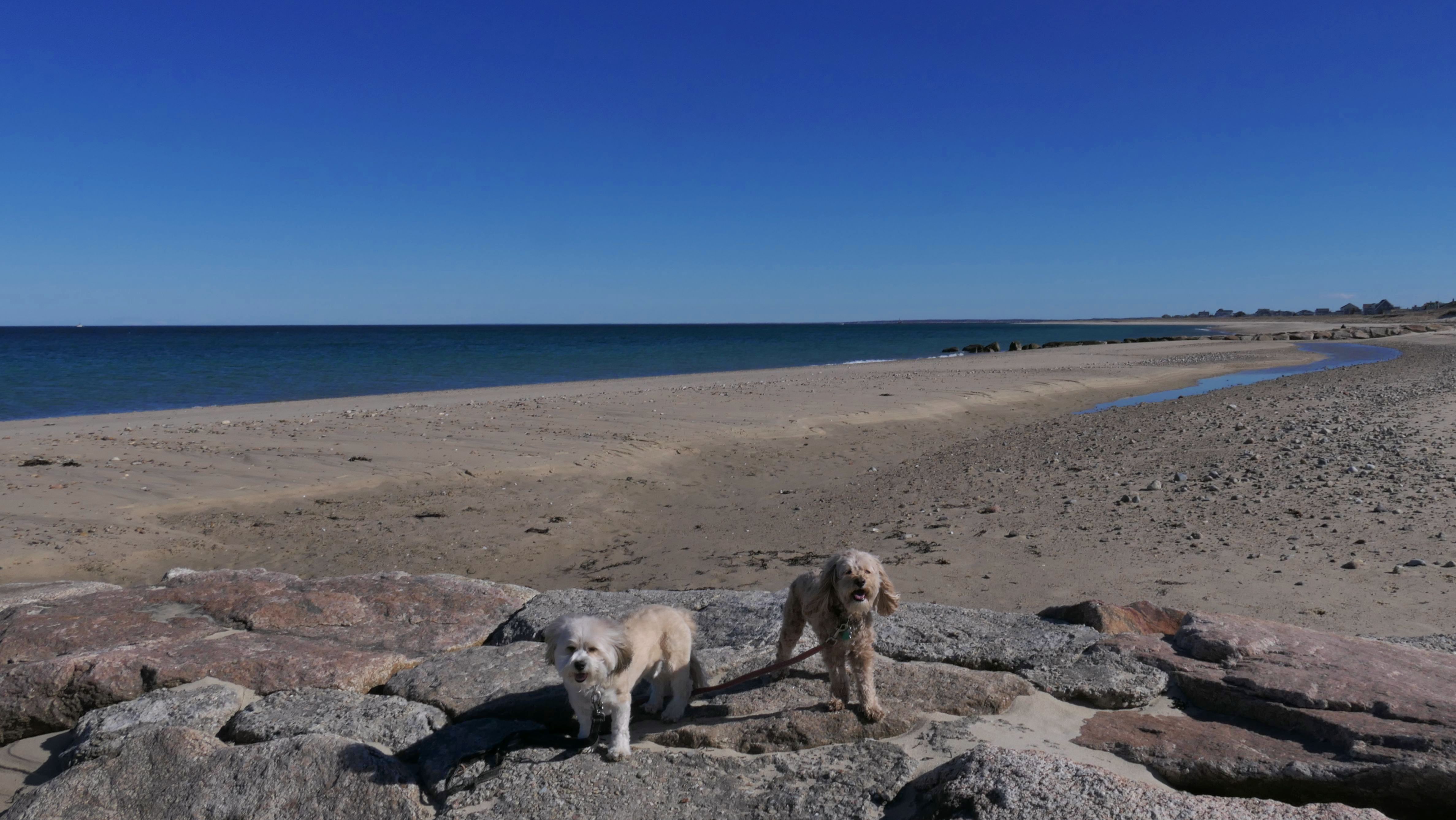 We were headed to this beach, but when we arrived at the small parking lot it looked like a sticker was required to park, even in the off-season. I don't know if this is rule is enforced in the winter, but we actually decided to go to Scusset Beach instead. That being said, we still made it to this beach by walking over to it from Scusset Beach. Dogs are allowed from October 16th through April 30th at Bourne town beaches. This beach has nice sand with mild waves and a few rock jetties. We only covered the area from the town line to the North Public Lot (this lot was closed and under construction), before heading back the way we came.