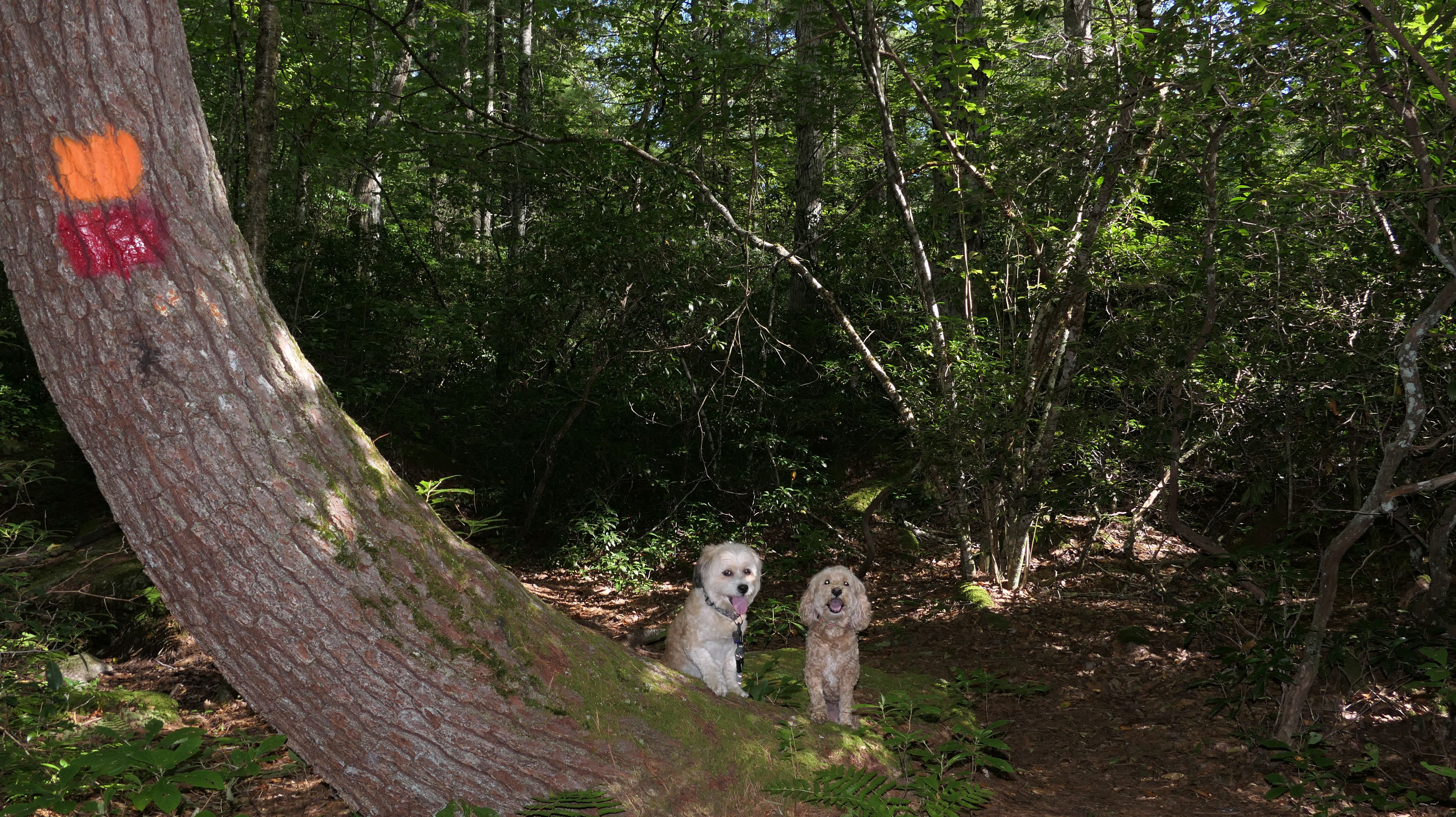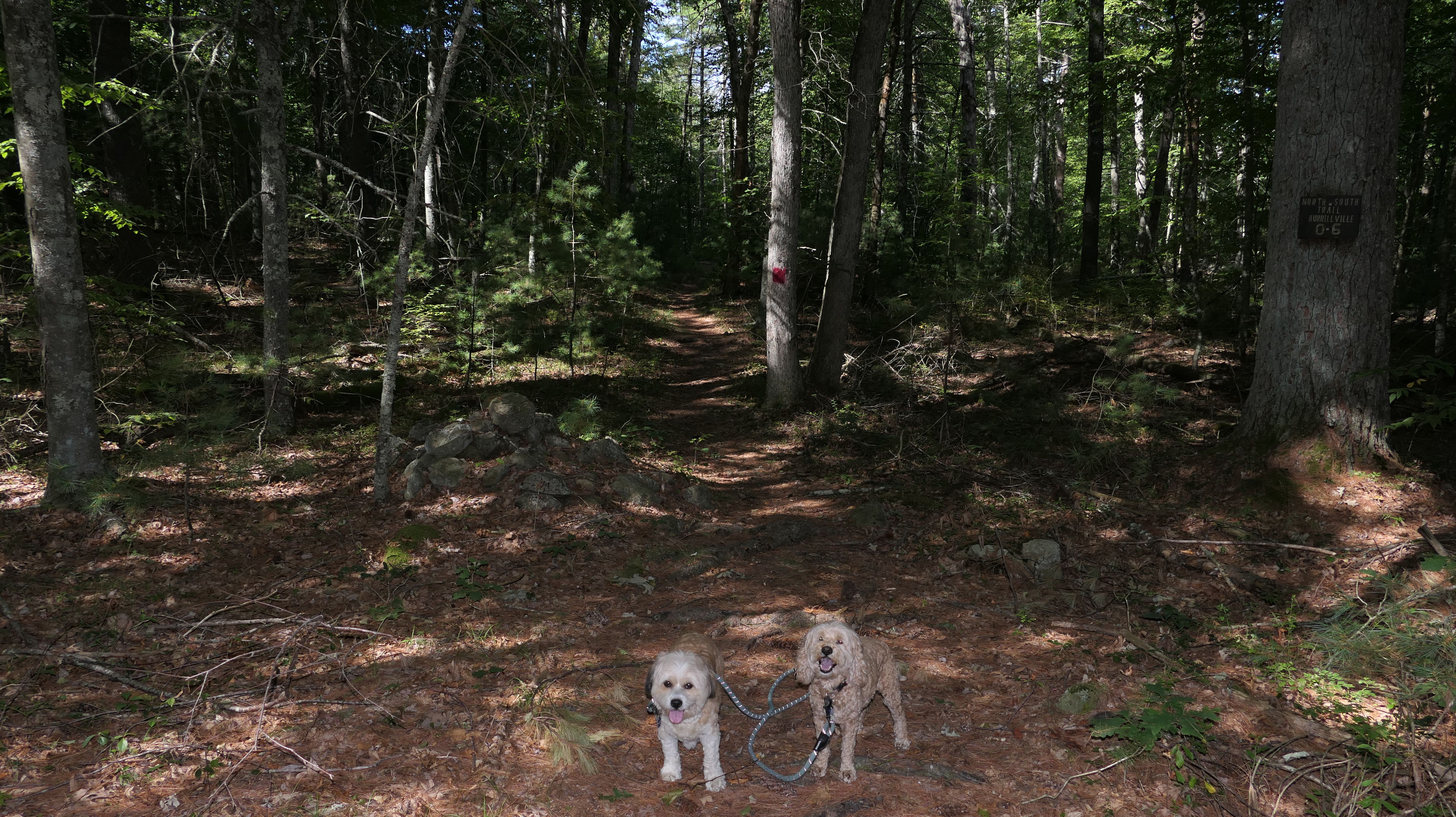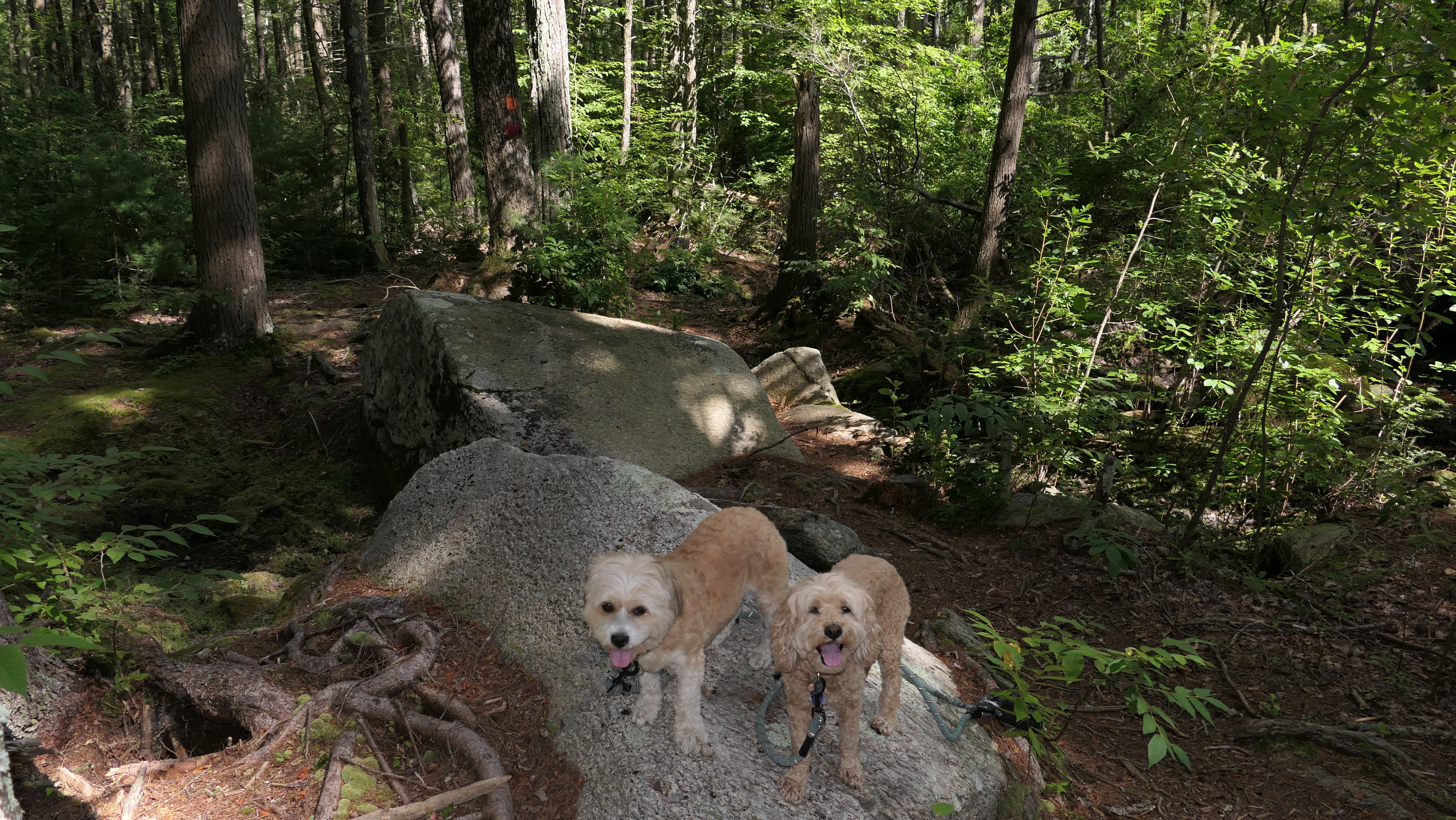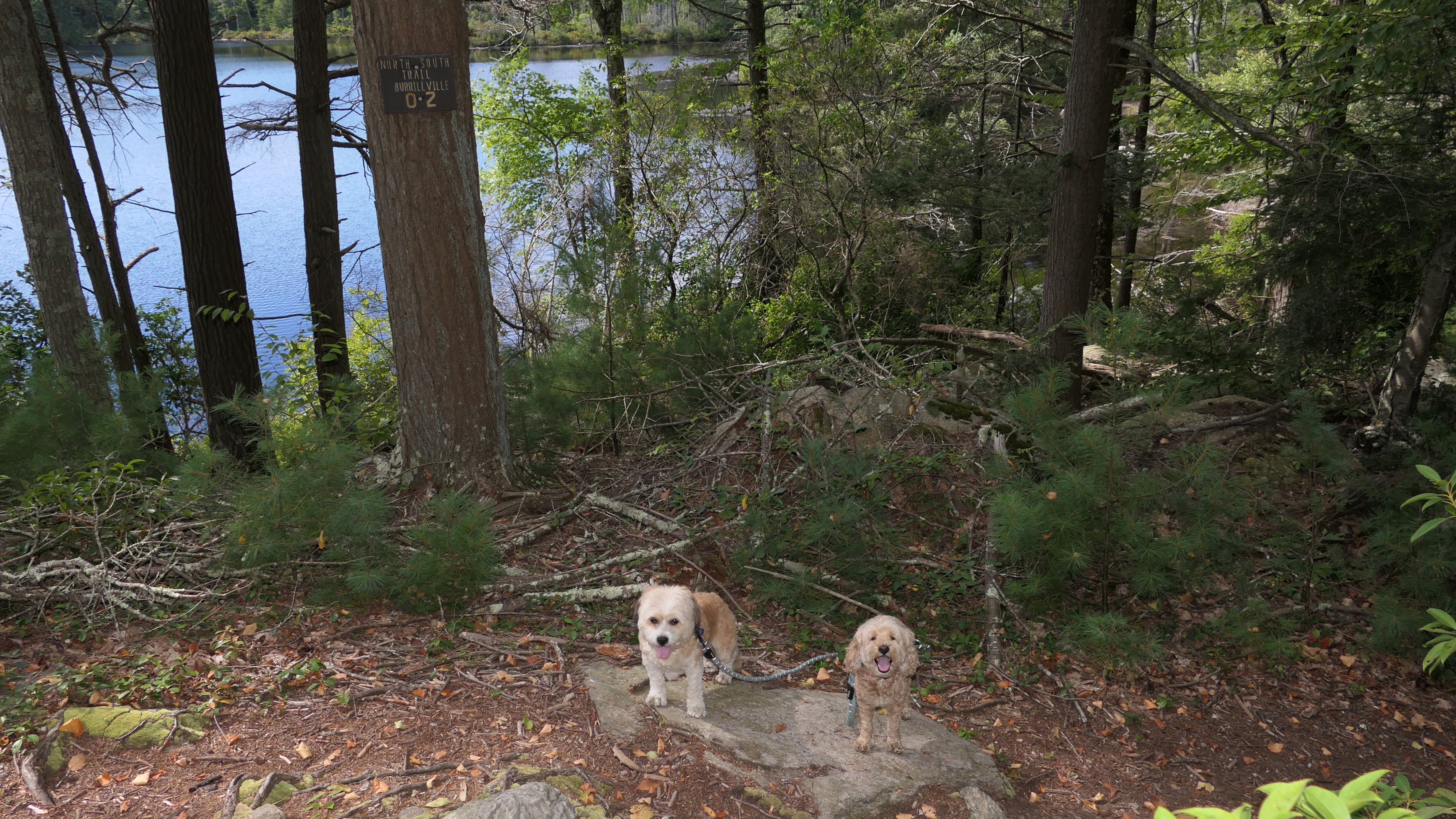 This is a cool hike to the corner of where three states intersect. We start from the Air-Line trail, and then hike up a pretty steep hill. We arrive at the peak and there is a marker to indicate the borders of Connecticut, Massachusetts and Rhode Island. I know it's really silly, but I kept posing the dogs so that one of them would be standing in one state, and the other one would be in another state, until I got every combination.