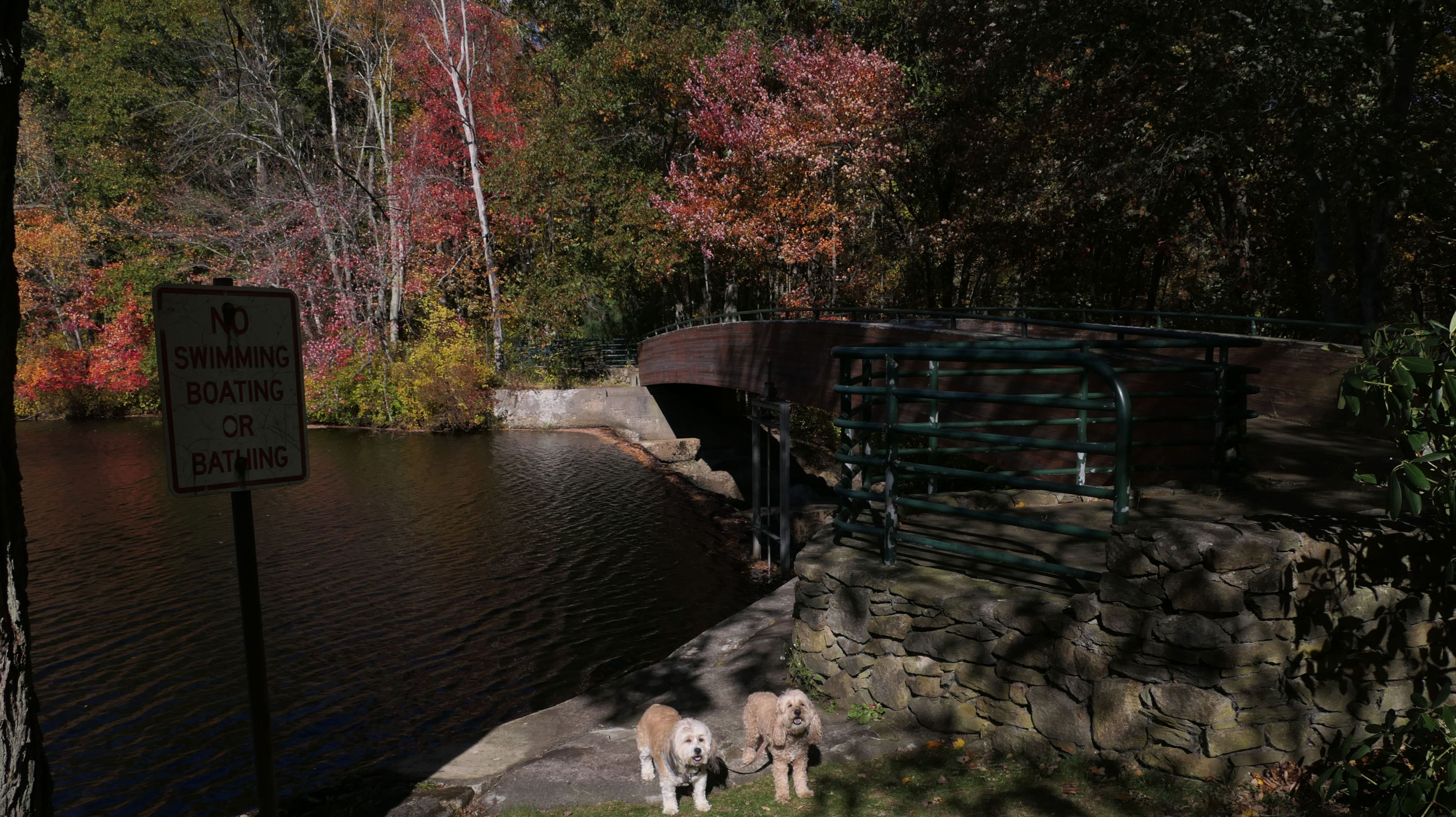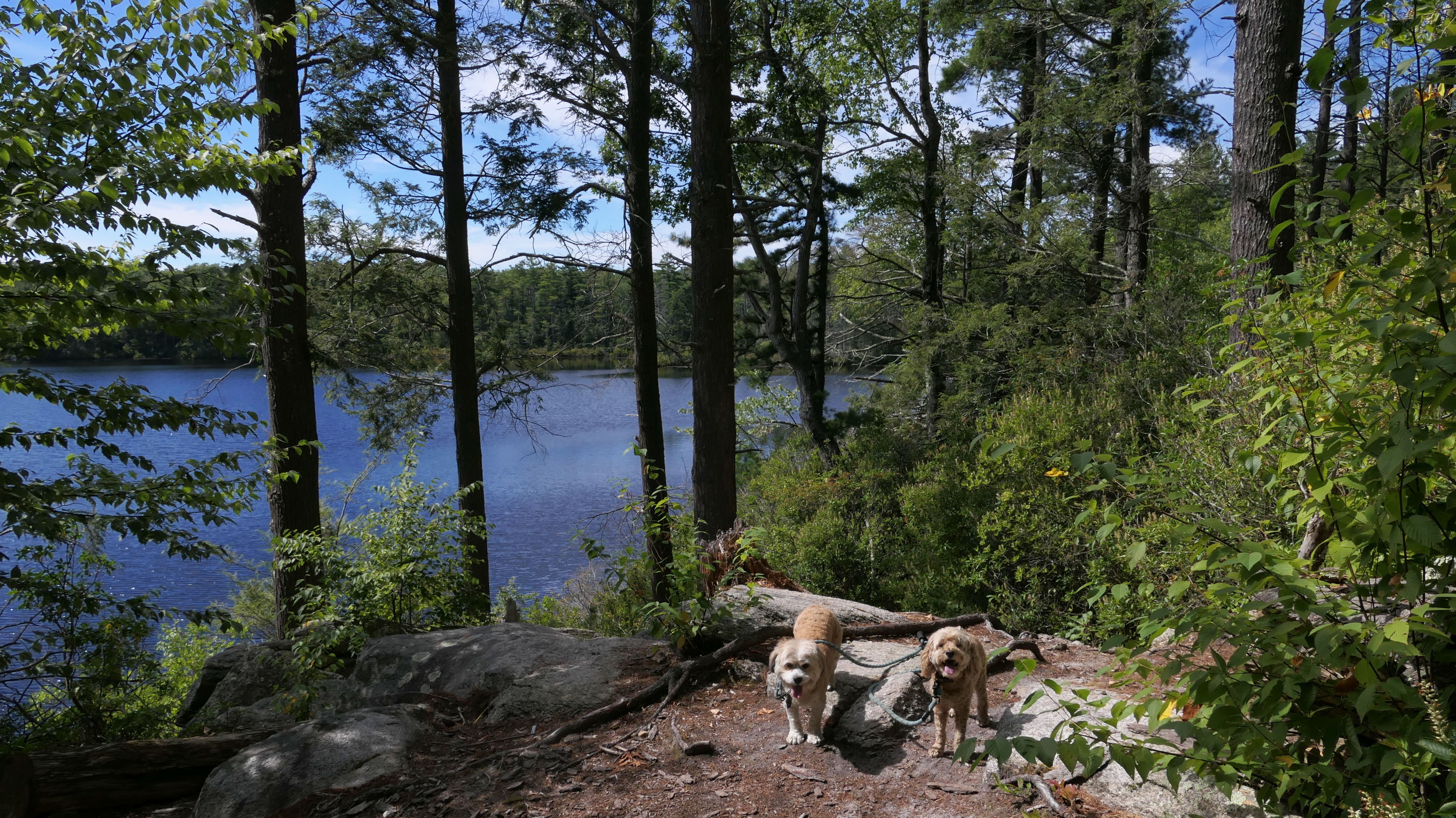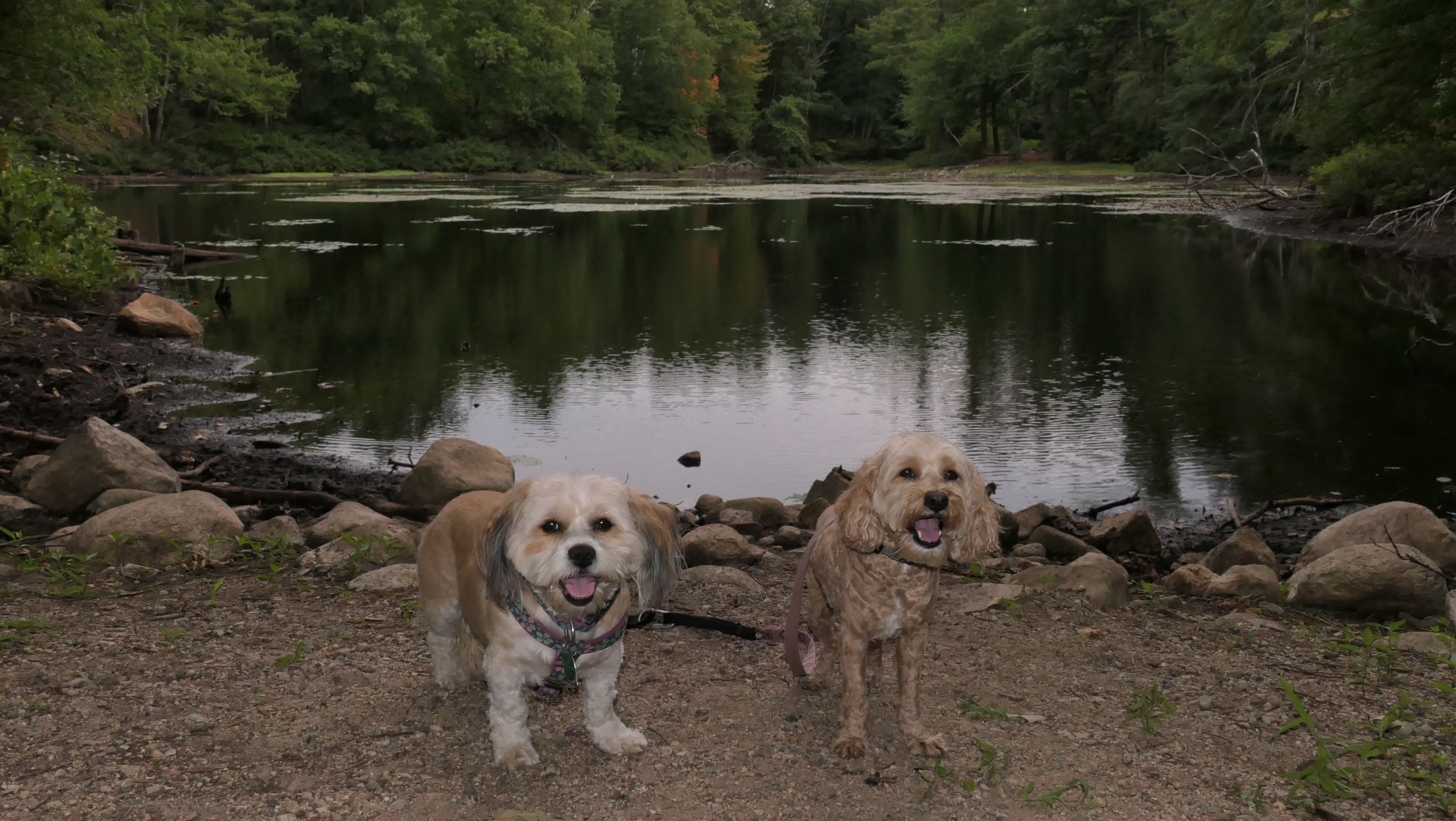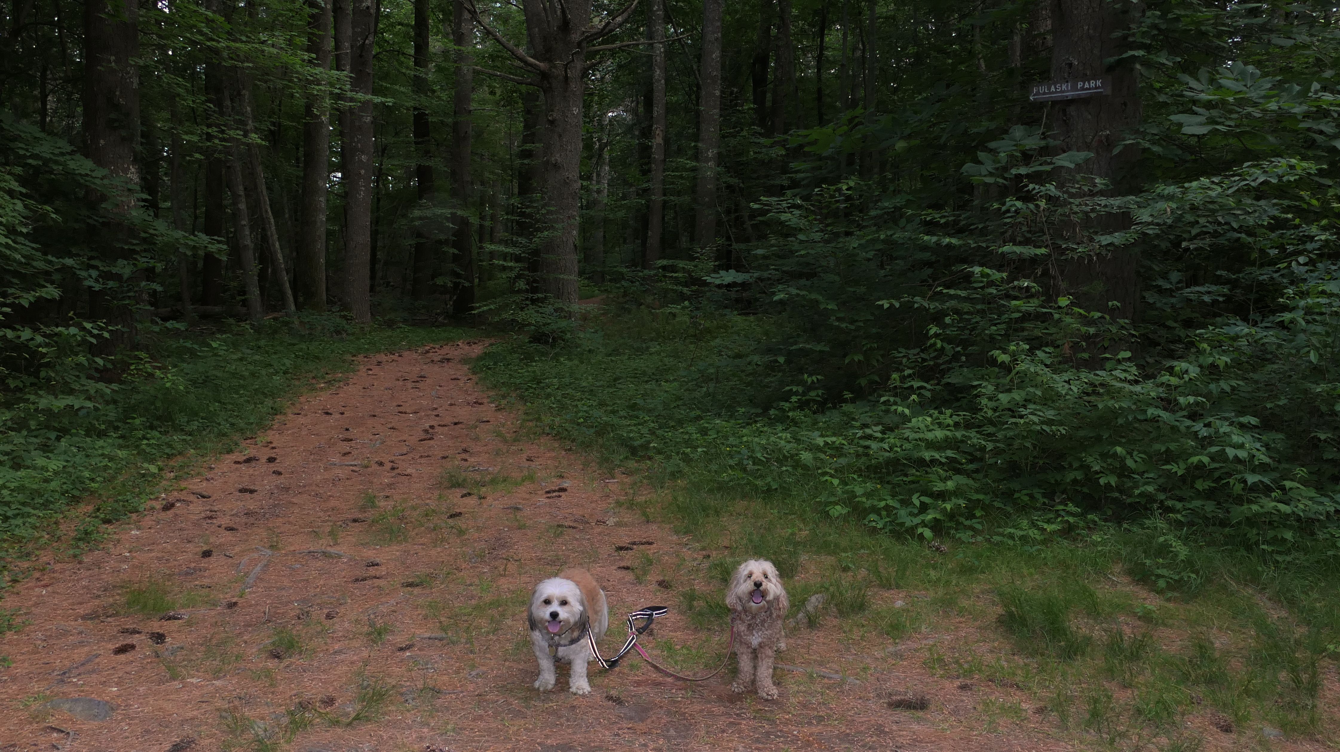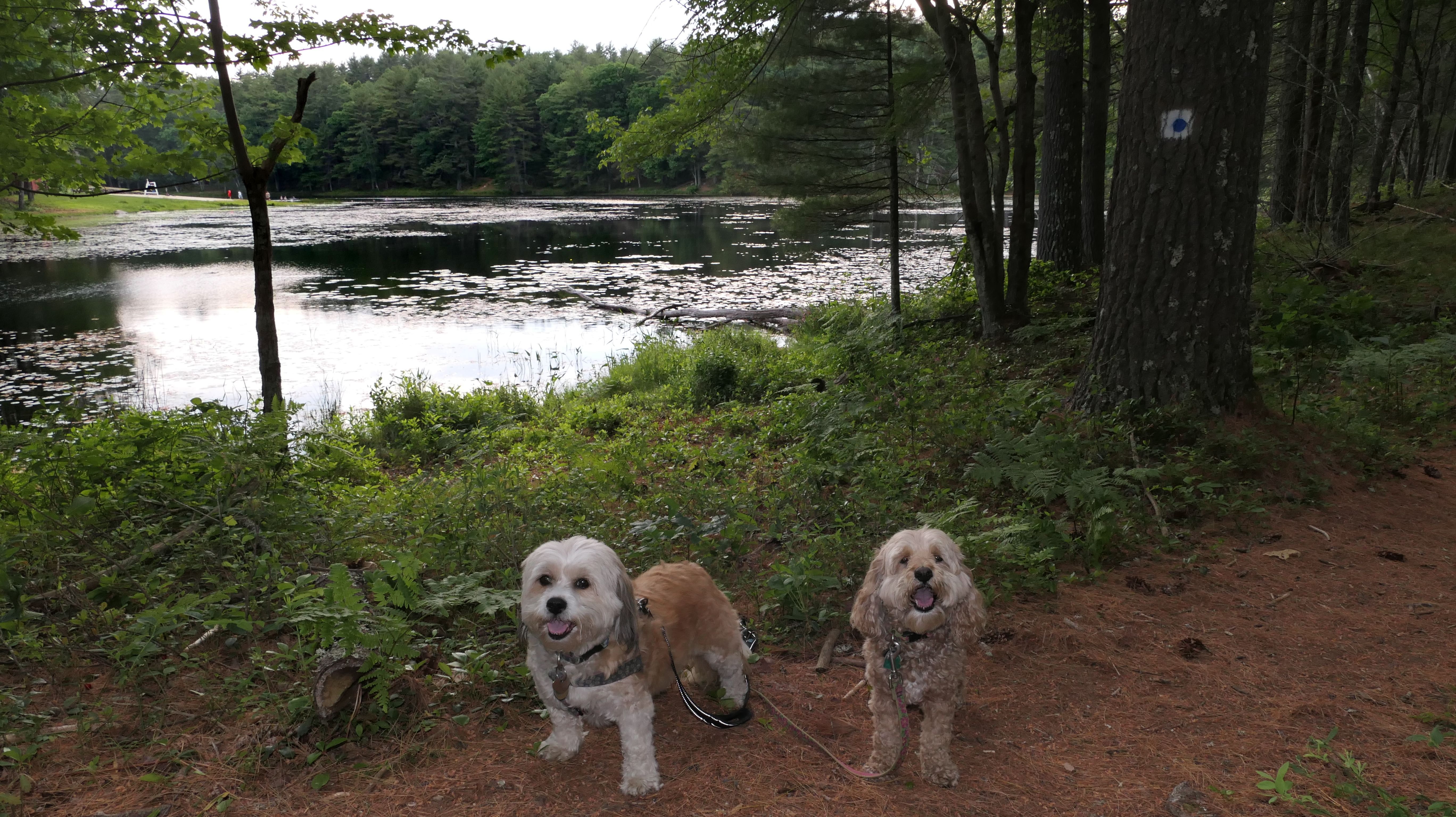 This is a cool hike to the corner of where three states intersect. We start from the Air-Line trail, and then hike up a pretty steep hill. We arrive at the peak and there is a marker to indicate the borders of Connecticut, Massachusetts and Rhode Island. I know it's really silly, but I kept posing the dogs so that one of them would be standing in one state, and the other one would be in another state, until I got every combination.