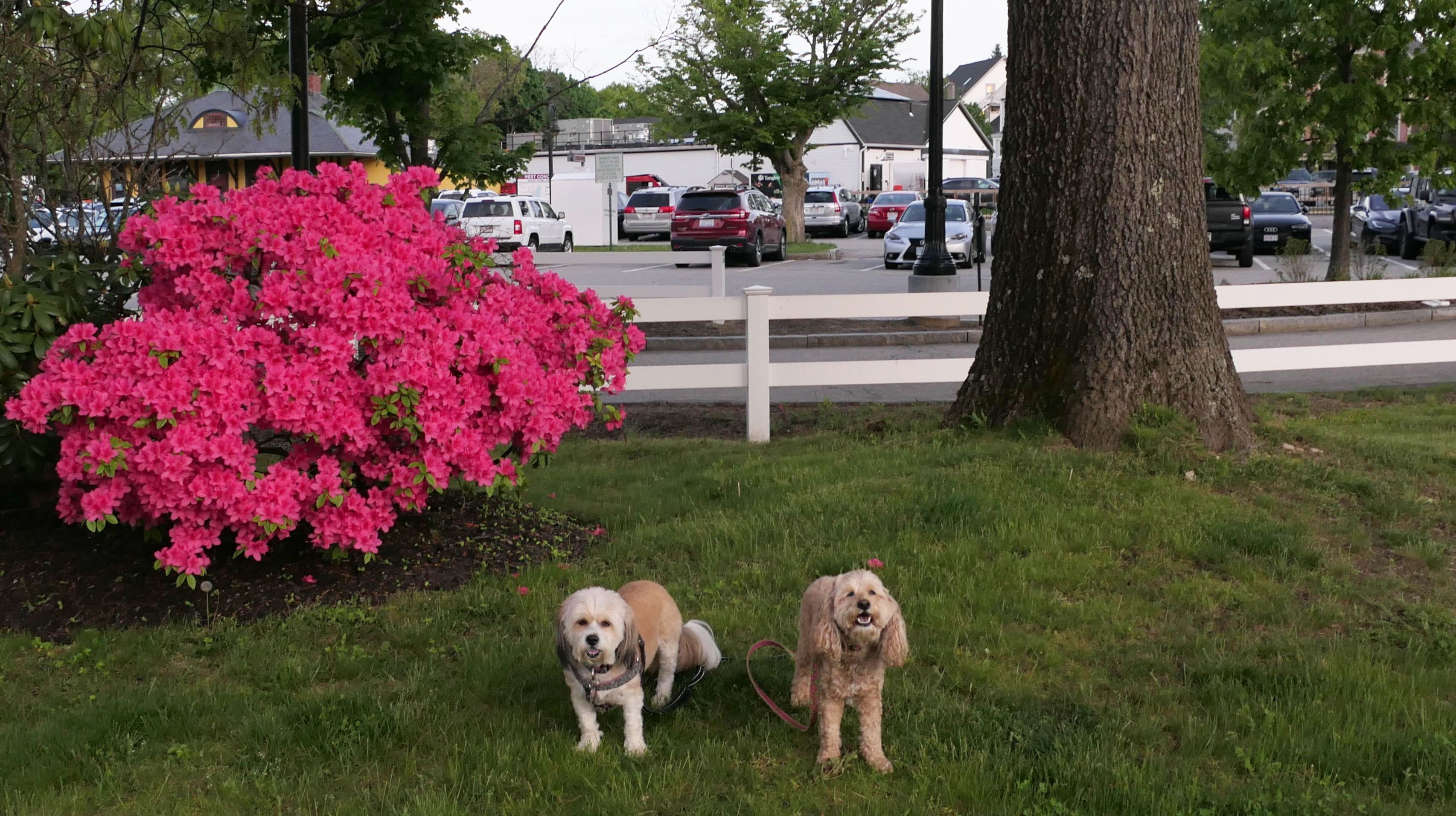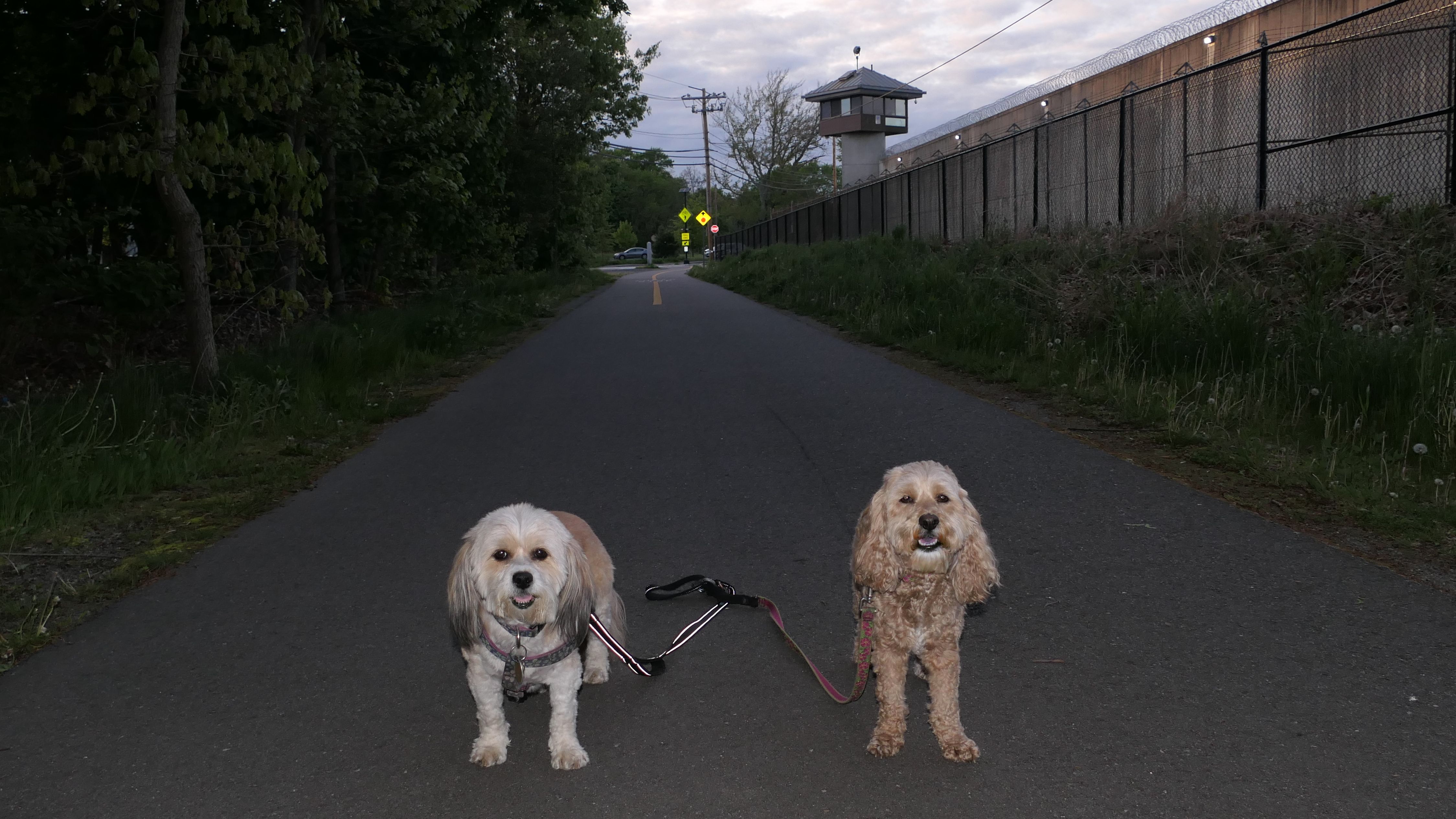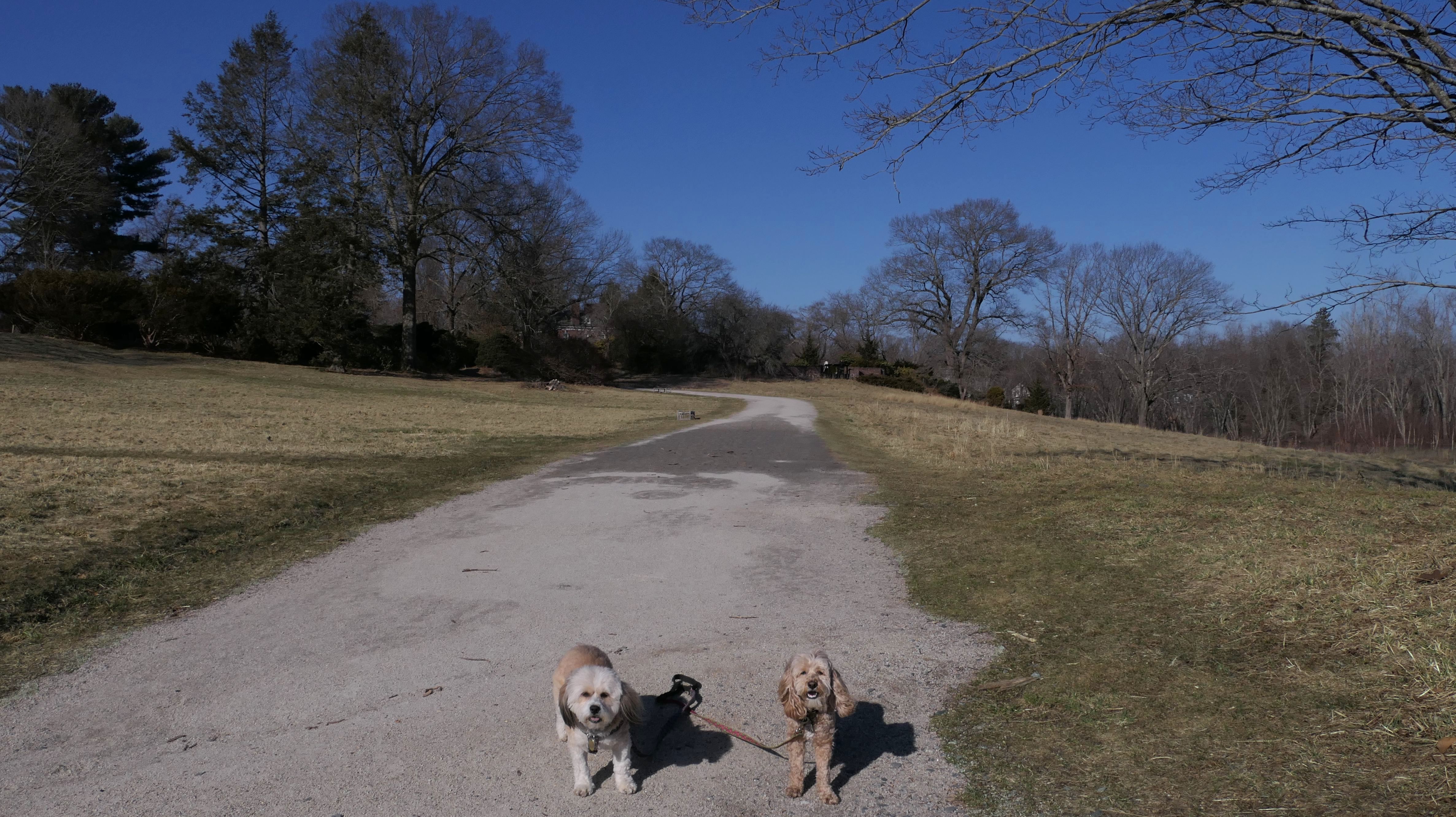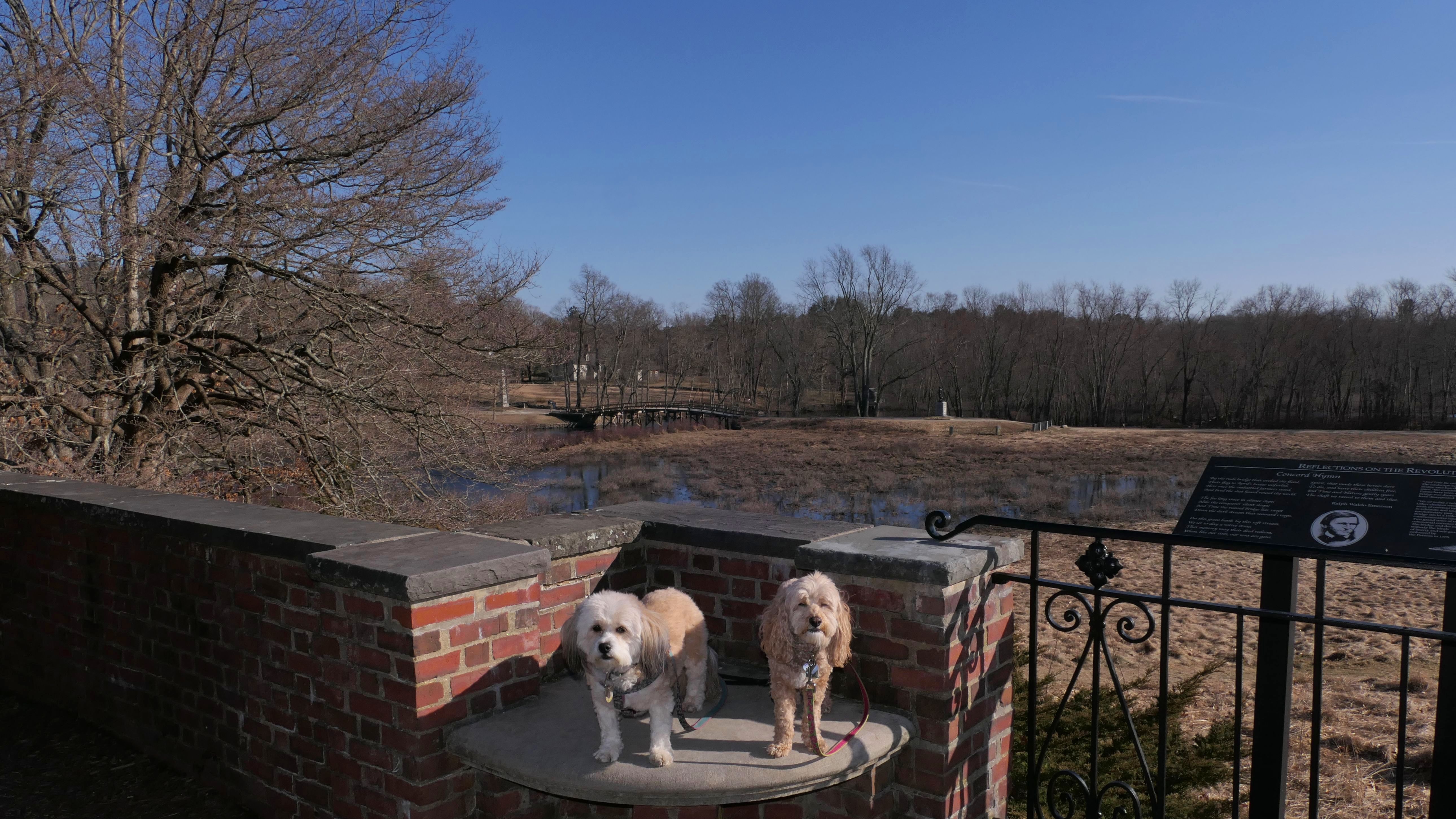 We walked here from Downtown Concord. The Minute Man National Historic Park is a large National Park with multiple sections. This is the section around the historic North Bridge. This is the site of one of the earliest battles of the Revolutionary War. The bridge is a replica of the original bridge, built in 1956. There's a stone dust trail that leads up a hill up to the visitor's center. The trail was quite muddy in places, and it was hard to get a picture of the dogs in front of the famous statue here. The sun was directly behind the statues, and it was too muddy to take it from a different angle.
