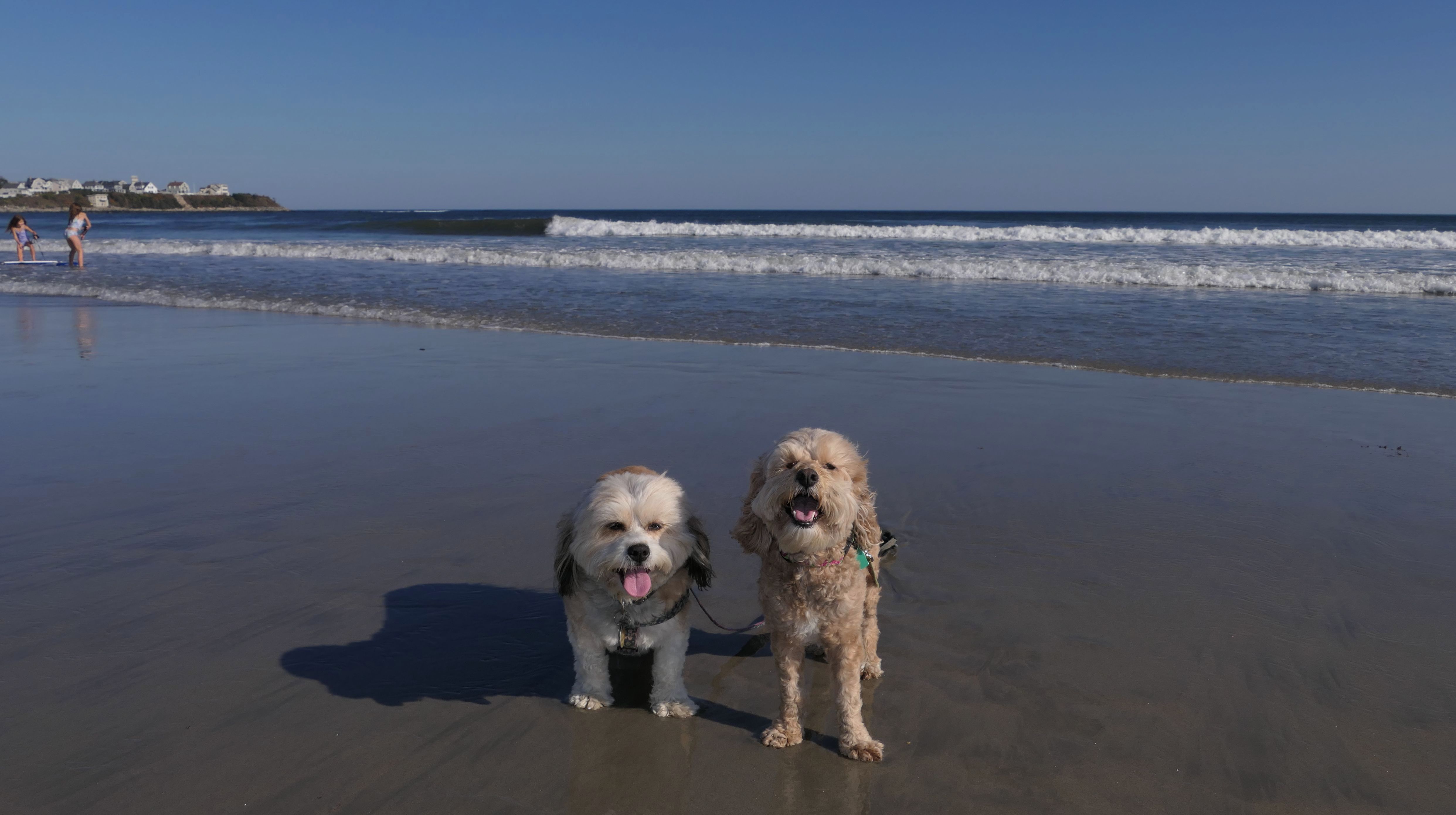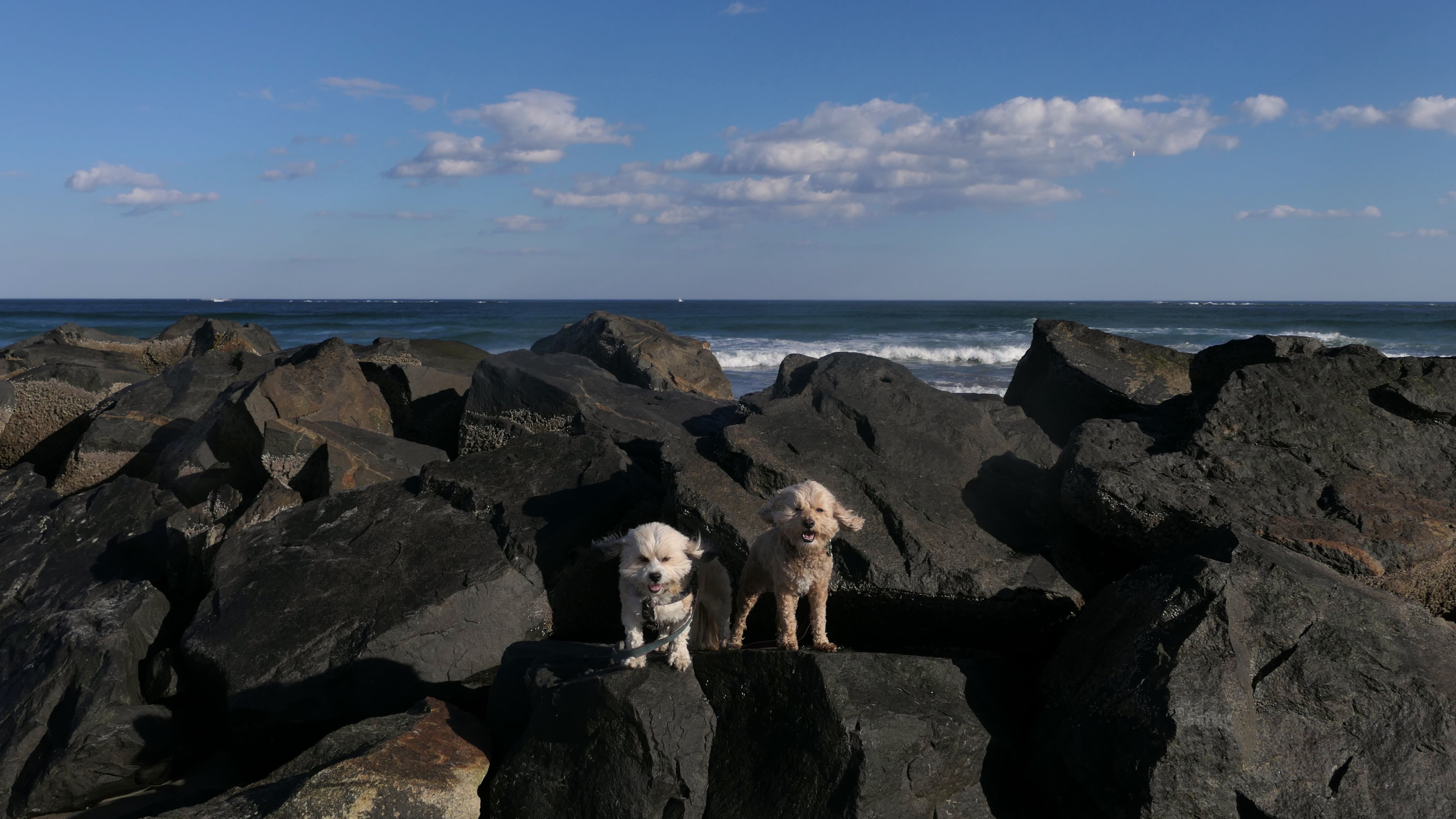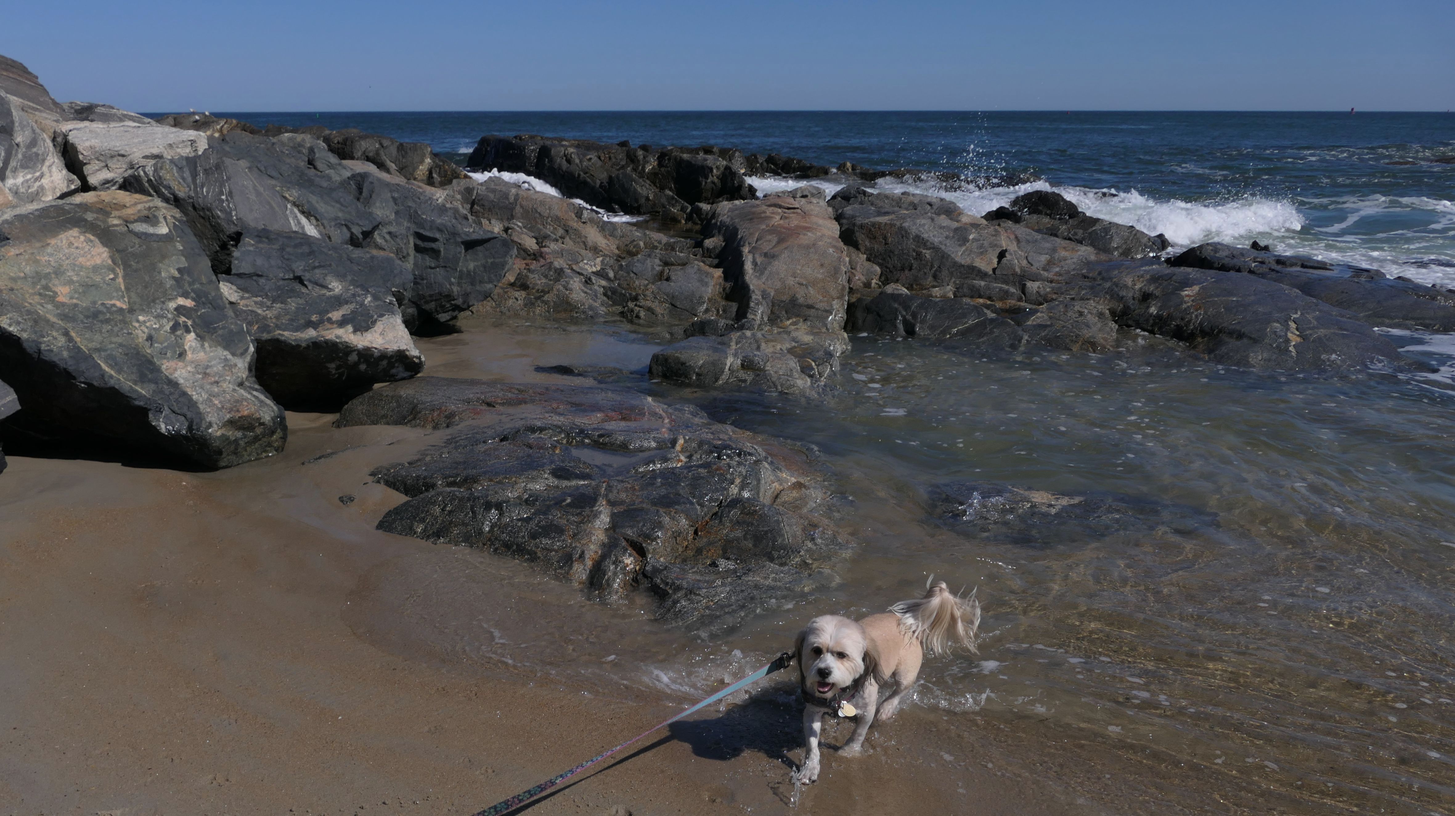 The northern most portion of Seabrook Beach in Seabrook, NH actually crosses town lines into Hampton. This portion of the beach, with the rocks, is actually the nicest, most scenic section of the beach. Beyond the rocks, is the Hampton Harbor Inlet, and on the other side of the inlet is Hampton Beach. This was the only area where Mandy felt really comfortable in the water. The rocks blocked most of the heavy waves, so she had a nice little spot to lay down in!