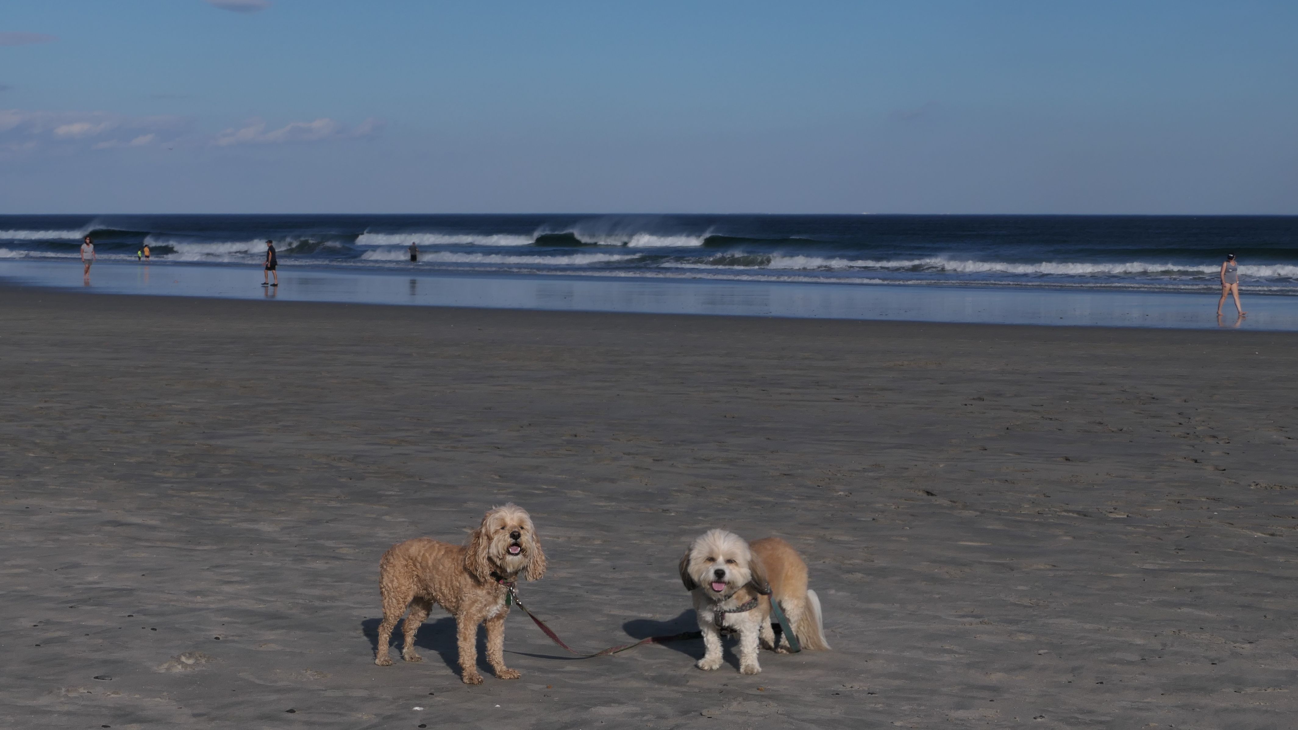 This was a great day! We got one more taste of summer! Temps made it to the 80's throughout the region, even here in Hampton Beach, New Hampshire. We celebrated the summer-like weather by going to the beach. Evidently, many other people had the same idea because this beach was packed. It was a full fledged beach day... on October 28th! Dogs are only allowed here in the off-season, October 1st through April 30th. We saw many other dogs here. I imagine there may have been more people here today than some summer days, since in addition to allowing dogs, they stop charging fees in the off-season. We parked at the lot on the south end. Had we parked on the street near the boardwalk, we still would have pay for the parking meter. The beach is about two miles long. We walked the length of the beach and some of the boardwalk...which really isn't a boardwalk, but it serves the same purpose. Waves rip here, but Mandy and Lexi found a calm area to sit in the water by the rocks on the north end of the beach. Some clouds started to roll in as we were completing our walk back, but it wasn't enough to put a damper on a surprise late October beach day.