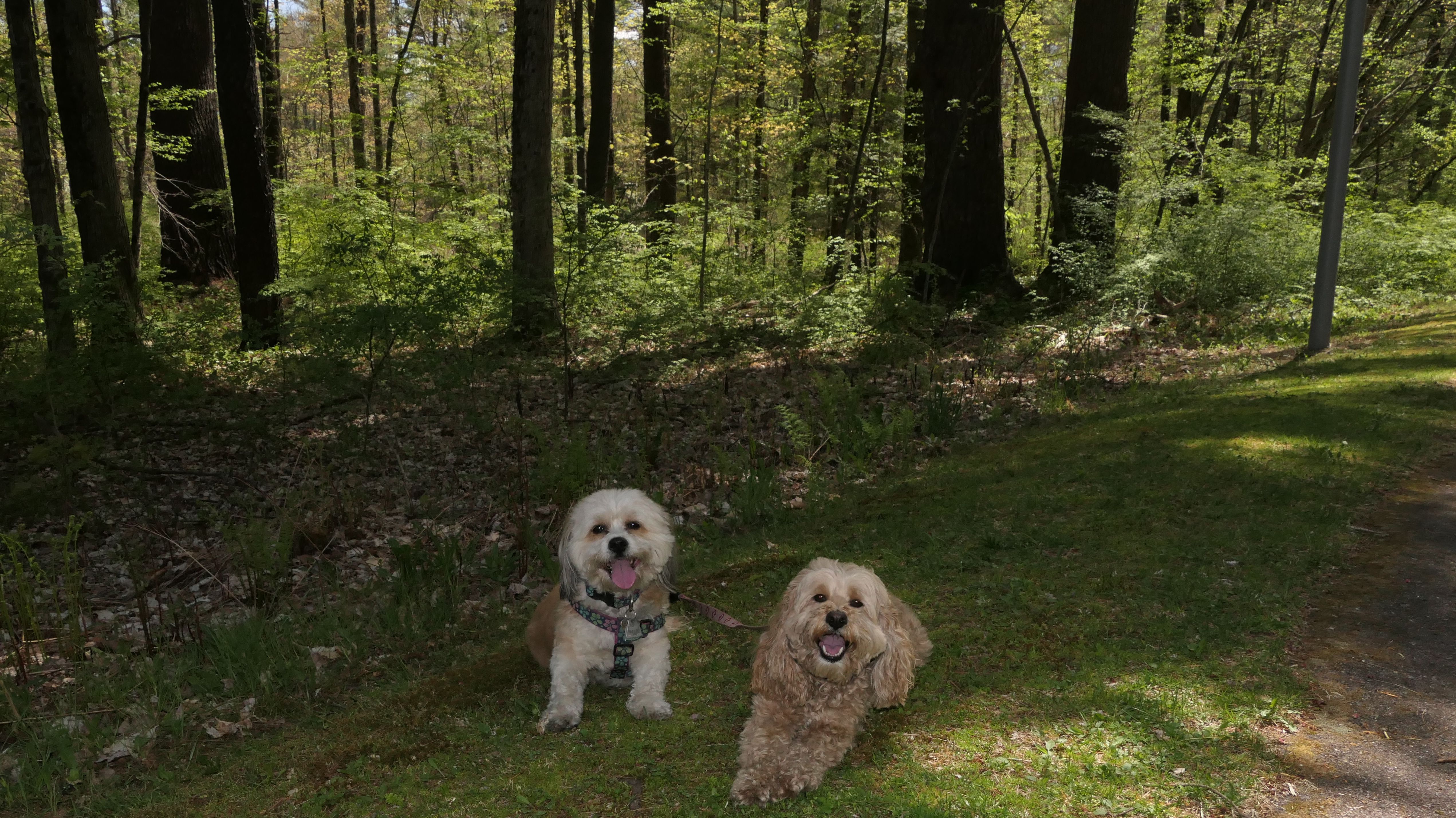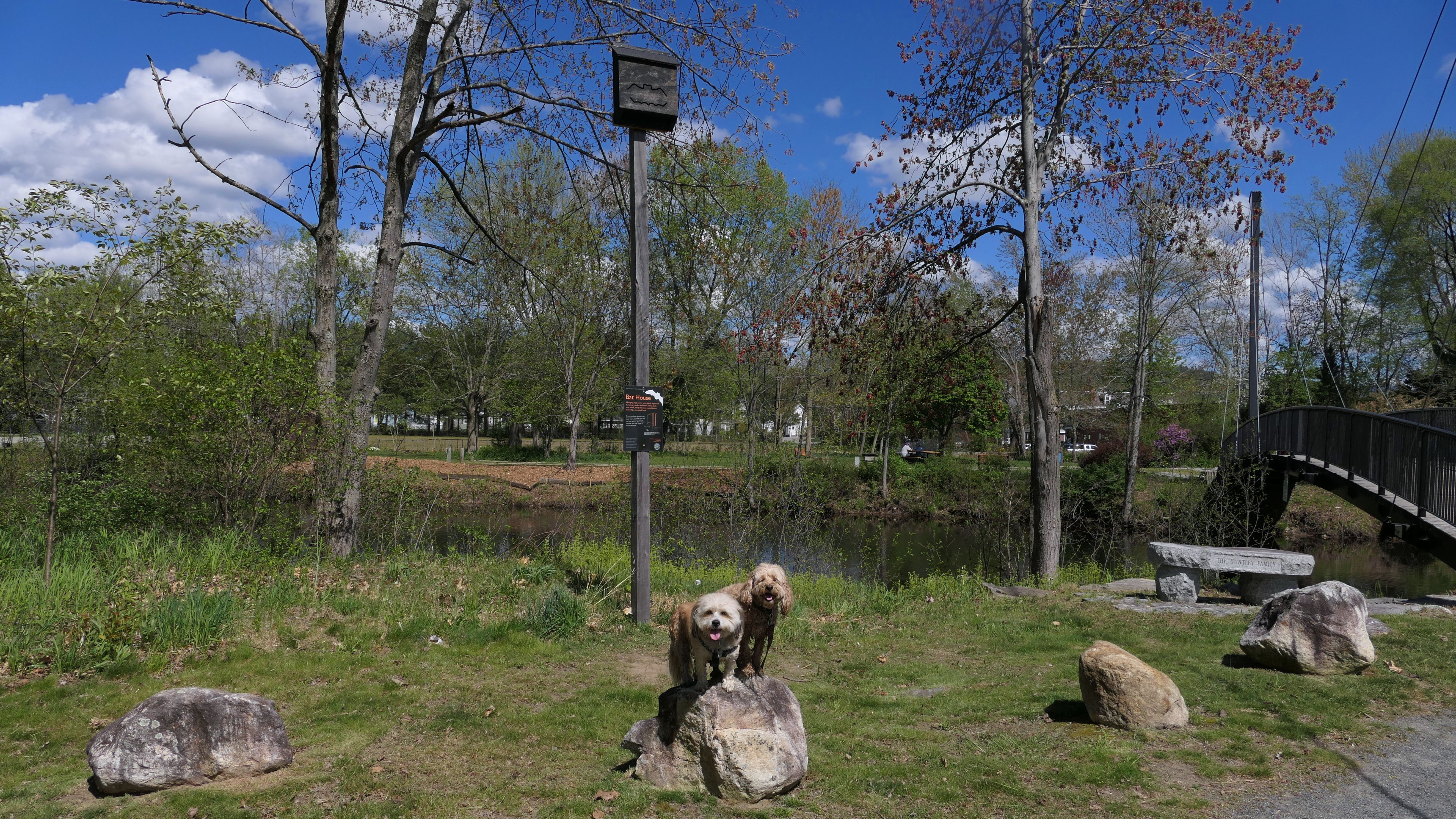 This is a beatiful park located in Keene, NH. The main trail is a wide, stone dust trail that starts in the park, and then follows the river through the woods until it reaches a paved bike trail at the end. It's a great trail to take the dogs for a walk. There are even a couple spots that the dogs can sneak in a quick dip in the river if they are hot...which as you can see in some of the pictures below, Mandy and Lexi decided to do just that! There are some side trails as well, but they are hit and miss. We walked on one of them thinking it would loop back around, but it was all flooded out and we had to backtrack. Overall it was a very enjoyable walk on a beautiful, and warm spring day.