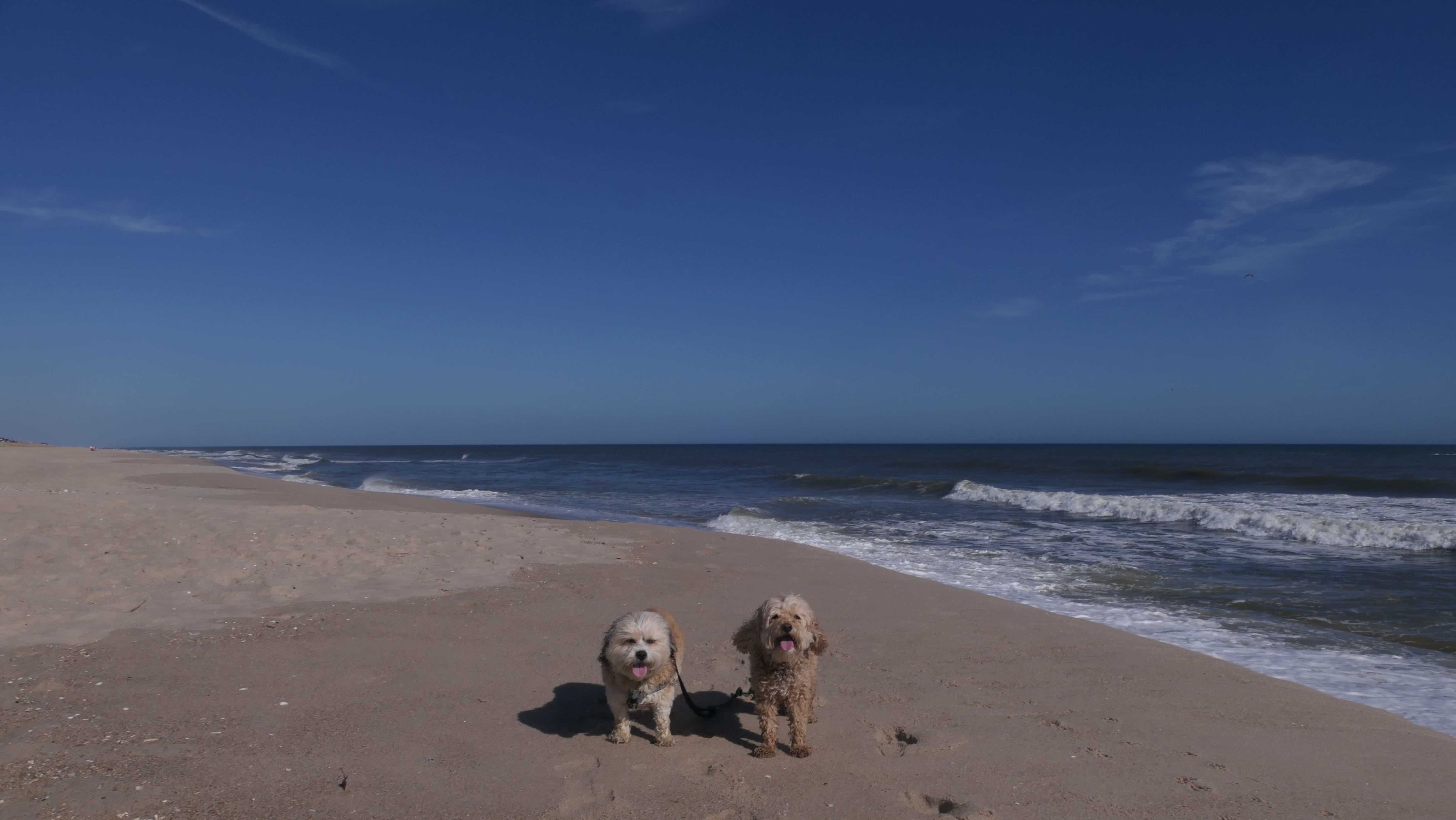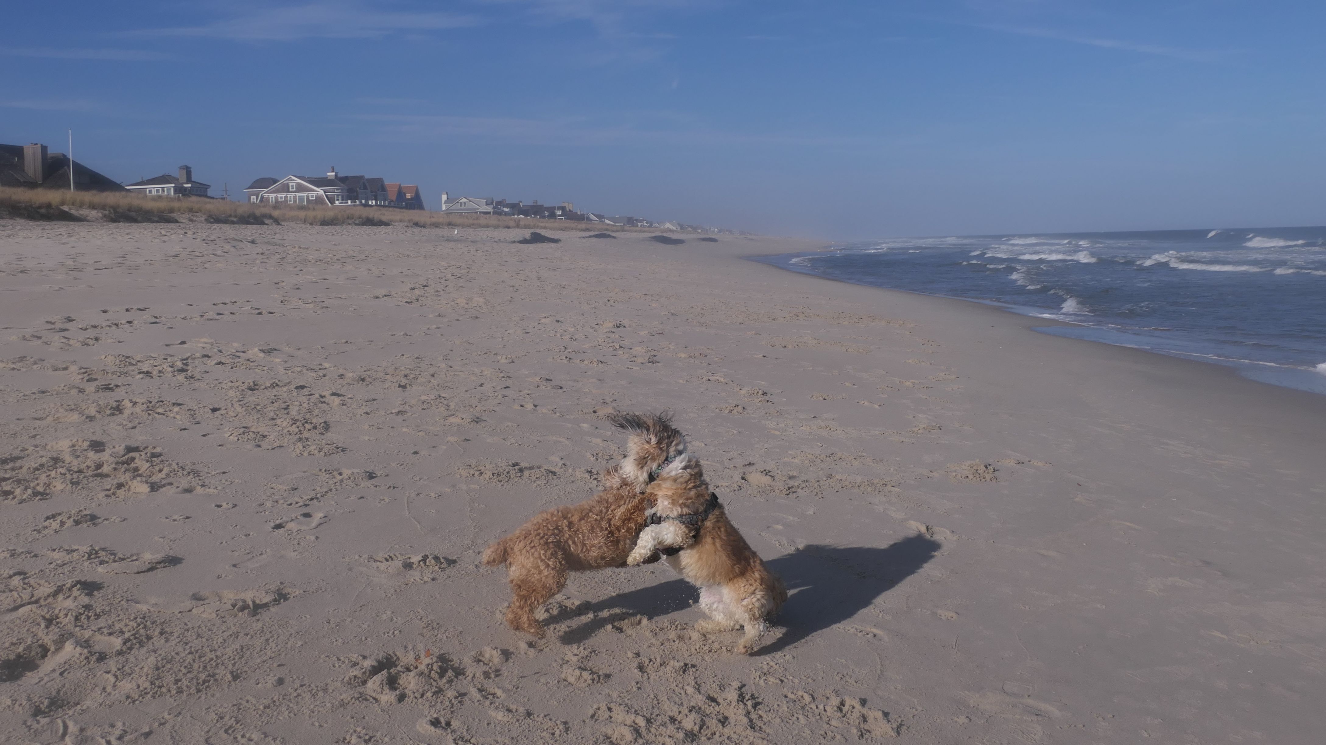 This was the final stop on our two day Jersey Shore adventure, which also included Mandy and Lexi's first night in a hotel, and beaches in Point Pleasant Beach and Bay Head. It was an unbelievably warm early November day. The beach got up to 78 degrees, while it was over 80 inland. There was a warm breeze, but it wasn't as windy as the day before. This beach was more dog-friendly than the others. There is a doggie waste station by the access point, with a poop bag dispenser. In the summer months (May 15th through October 1st) dogs are allowed between sunrise and 10AM, and from 6PM to sunset. In the off-season, they are allowed anytime, and are also allowed to be off-leash during the off-season as well! Since this was actually our second beach visit of the day, we kept the walk on the shorter side, but also took a brief detour to check out the town. Back at the beach, a dog with a dyed orange head arrived. Since the dogs could be off-leash, they had a new friend to play with. Even after that dog left, Mandy and Lexi ran around off-leash and did some of their patented doggie wrestling that they used to do frequently when they were younger! It was fun seeing them run around freely on a beautiful beach! This was a wonderful way to end our trip on a summer-like afternoon in November!