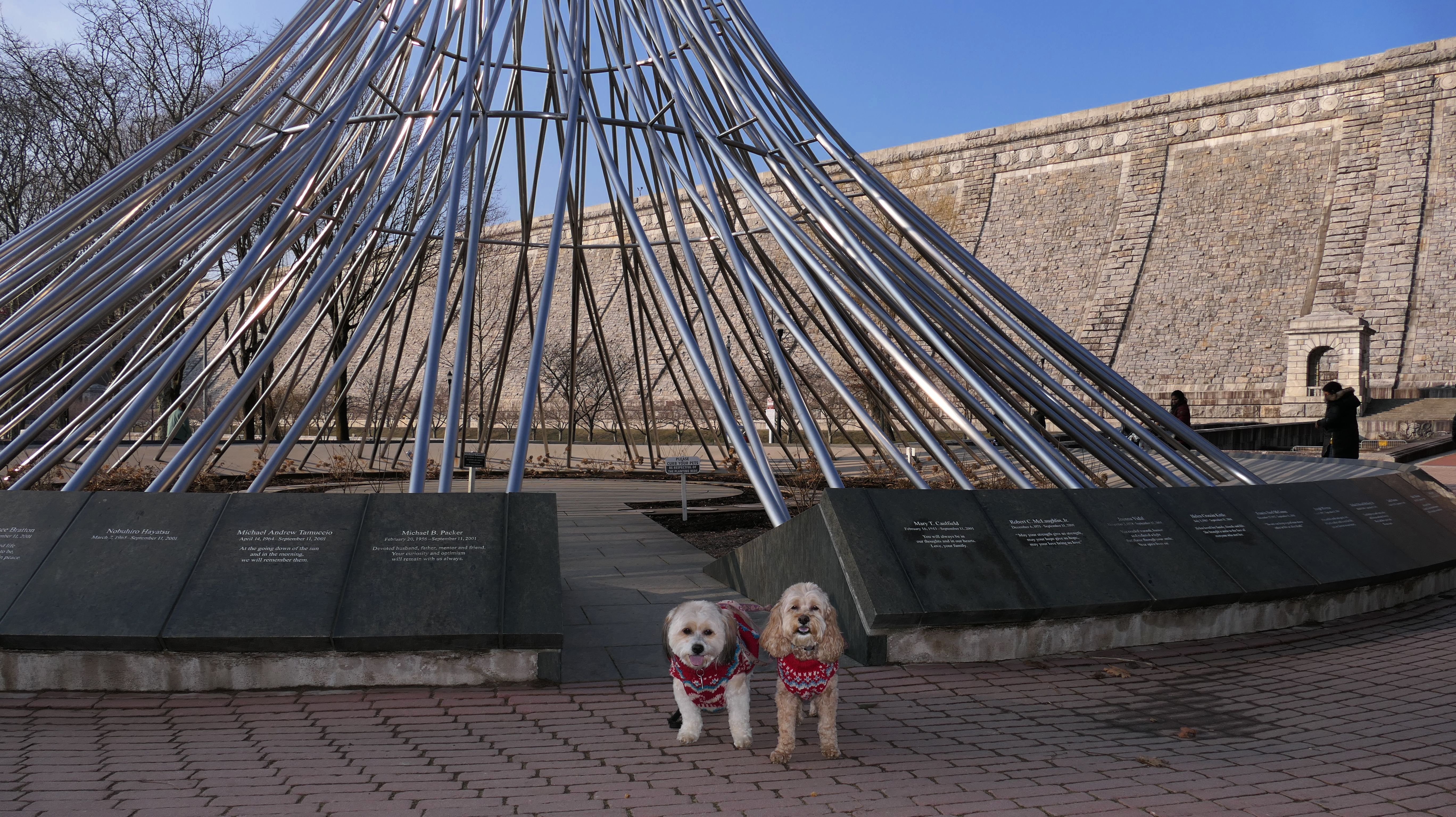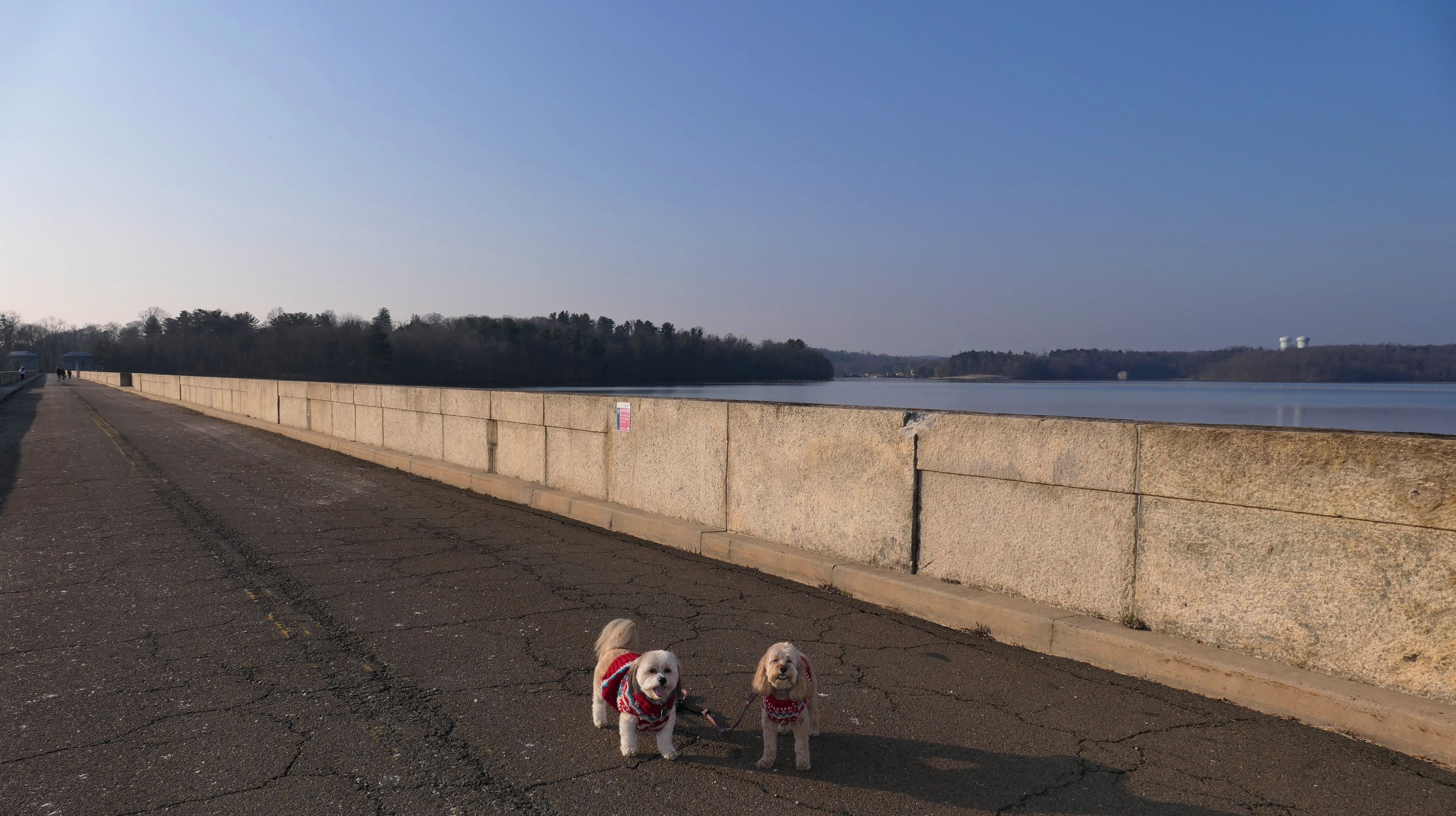 We hadn't been on an adventure in six days. Our wonderful February weather this year finally took a turn of the worse, and it was rainy and cold all week. It was warmer and sunnier in Westchester County New York, so we headed to this place. This is a really neat park that straddles the town line between the Valhalla section of Mount Pleasant and North Castle. There is an open grass area, and a promenade of sorts, in front of the very large dam. The west side of the park features a playground, while the east side of the park includes "The Rising", a 9/11 monument that honors the victims from Westchester County. Obviously, the main feature of the park is the dam. There are stairways on both sides of the dam, so we climbed to the top. There is an old road that runs right across the top of the dam that is closed to vehicular traffic. It is now just a pedestrian walk way. There are nice views from the top of the dam. I have to admit, climbing the stairs was a good workout. The climb is over 20 flights of the stairs. The dogs didn't really seem to have much issue with the climb. We did this after walking four miles on the Bronx River Pathway, that starts at this park. Needless to say, we made up for not being able to get out of the house in six days. Below are the pictures from the North Castle section of the park. Visit the Mount Pleasant page for pictures from that section.