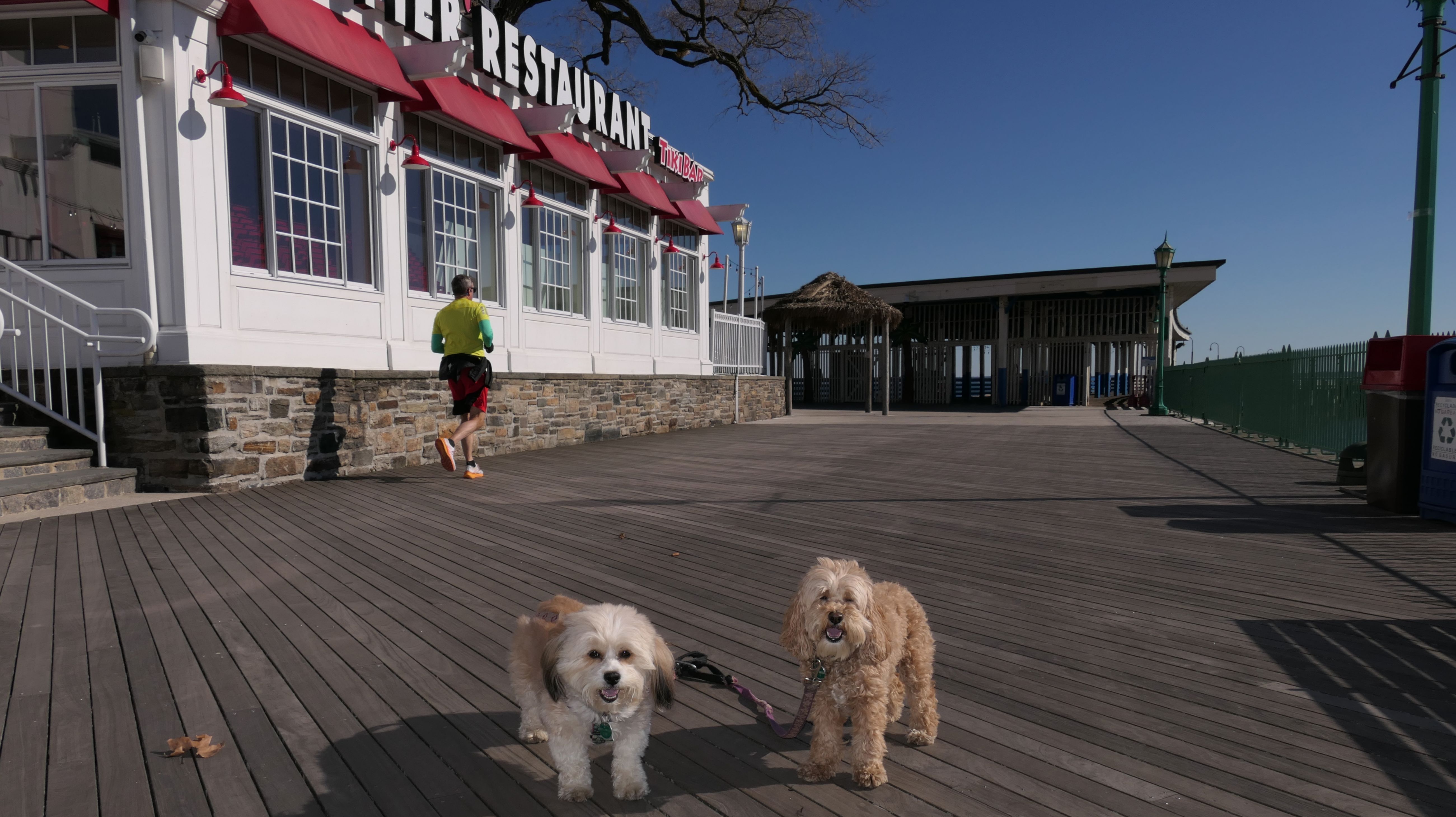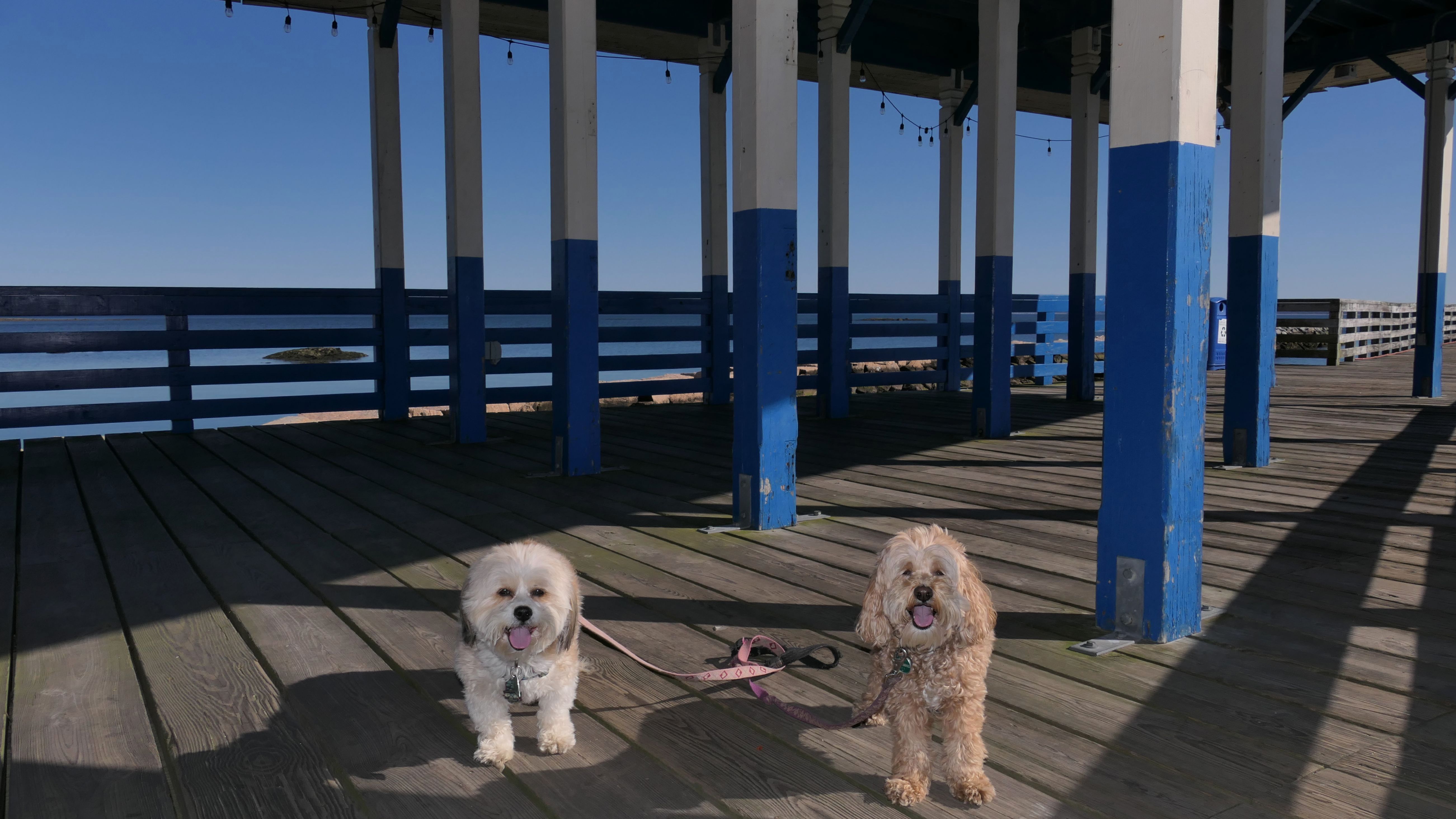 The highlight of the Playland Park in the winter is the beach. The company that runs the park allows the beach the become an off-leash dog park during the off-season. This year, the dates for the dog park are between October 8, 2022 and April 23, 2023. After we walked the boardwalk, and explored the adjacent Rye Town Park, the dogs got to run off-leash on the beach! Mandy and Lexi were sporting some long fur, so despite it being the middle of February, they got hot on the walk. They had no problem cooling off in the water, and had a lot of fun running around the beach as well!