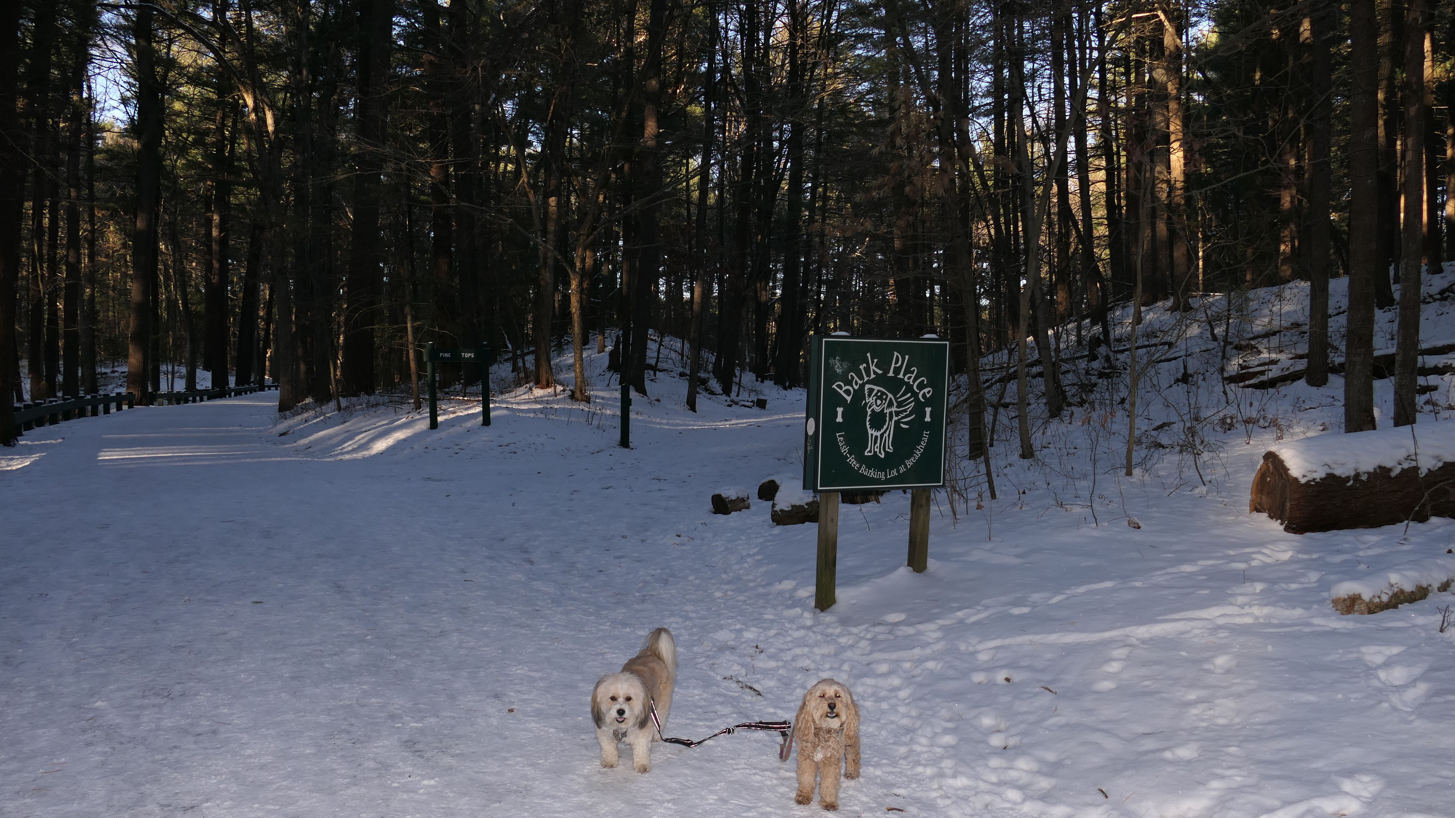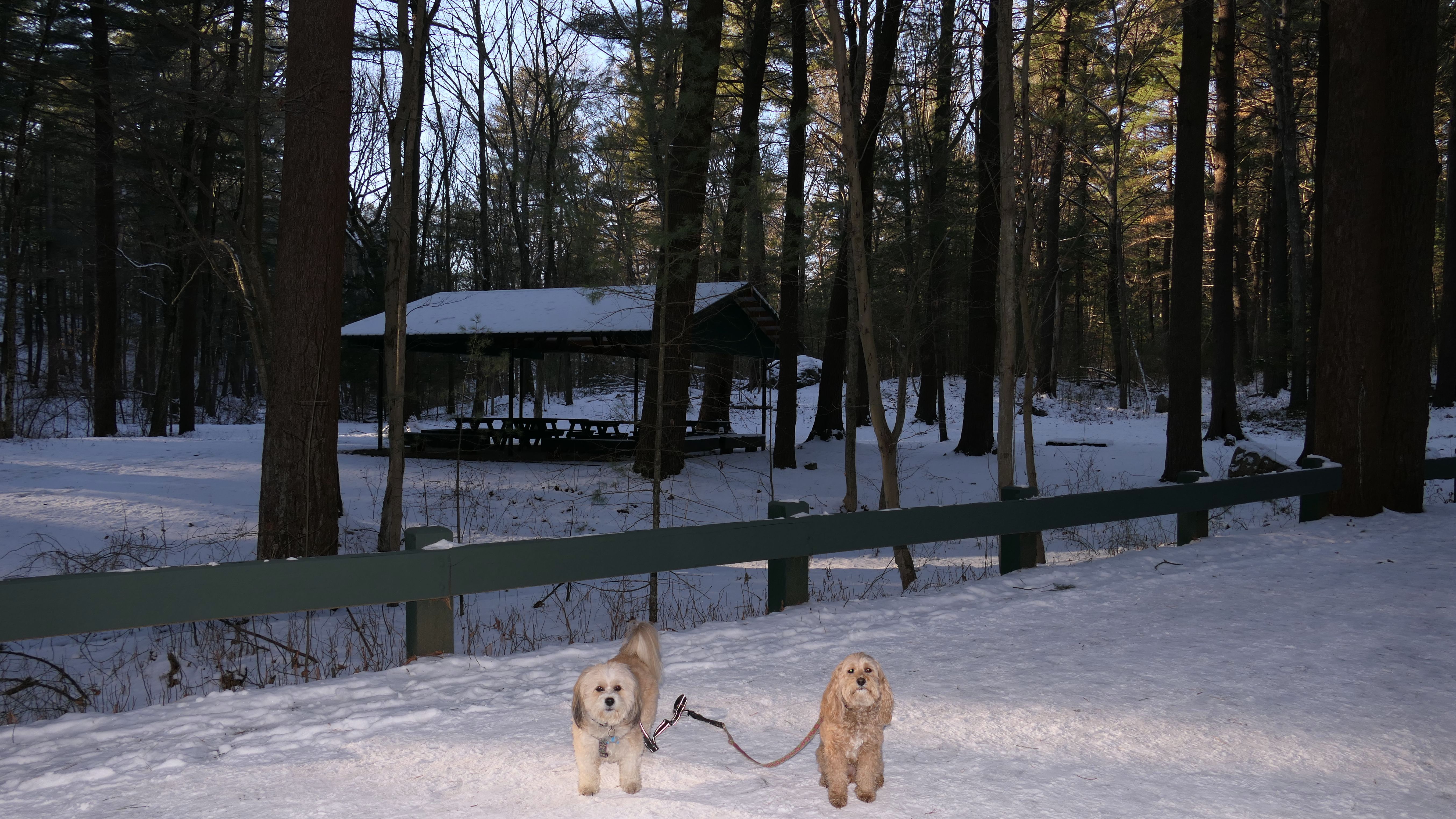 I decided to embrace winter on this trip (as opposed to what I usually do, ignoring it and going to a a beach or someplace where you can't tell that it's winter from the photos). This trip was actually very fun, and a change of pace from the places we've been visiting lately. We walked a paved, three and a half mile loop trail around the property. Of course, the pavement was covered with packed snow and a sheet of ice, so it was slippery in places. The trail is very scenic. I enjoyed the east side of the loop more. That part of the trail featured pine trees and Pearce Lake. There is a beach area for the lake, which was frozen on this visit. In the summer dogs are not allowed on the beach. There are many side trails, some of which lead to different parts of the lake, and I'm sure there are places for the dogs to cool off in the hot weather. The reservation is mostly in the town of Saugus, but a small section crosses into Wakefield, so be sure to visit that page for photos from that section. Mandy loves the snowy hikes, Lexi prefers the warm weather, but everyone had a good time regardless.