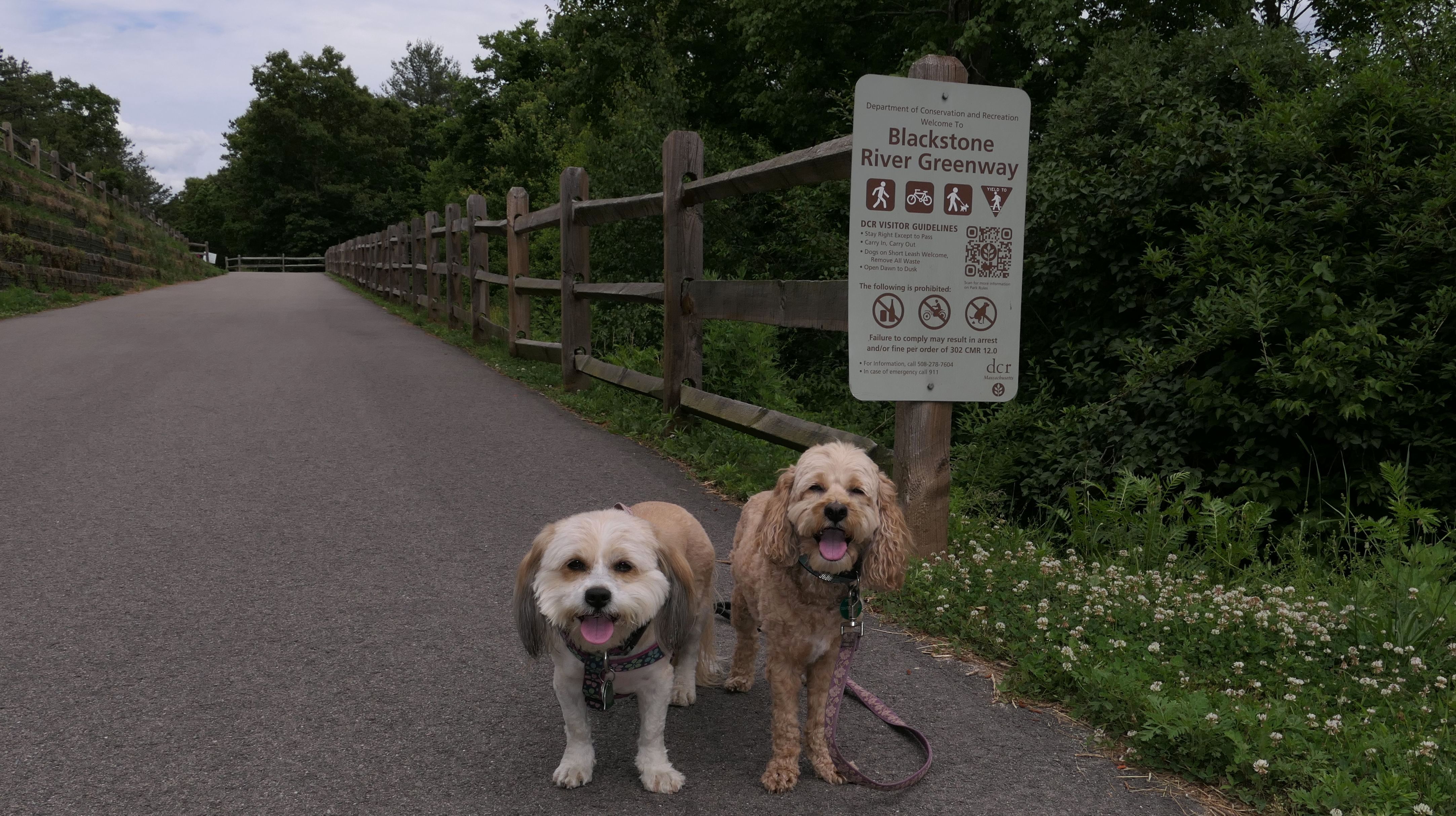 This is a pretty standard paved rail trail. We walked a section between Millville and Uxbridge. We also explored a side trail in Uxbridge that went into the woods. I like the sign behind the dogs in second picture below. Dogs are welcome, but dogs who poop might be arrested!
