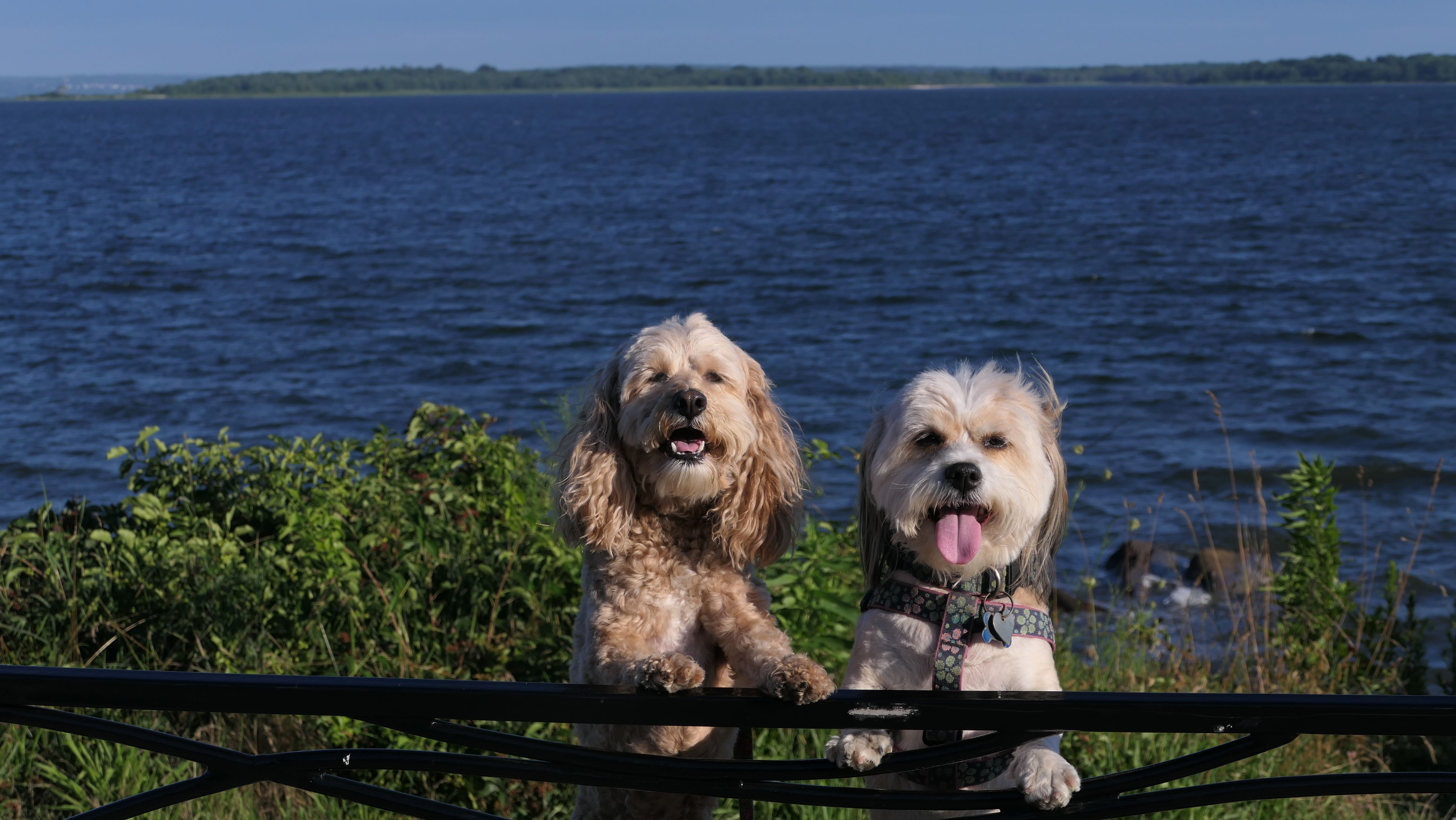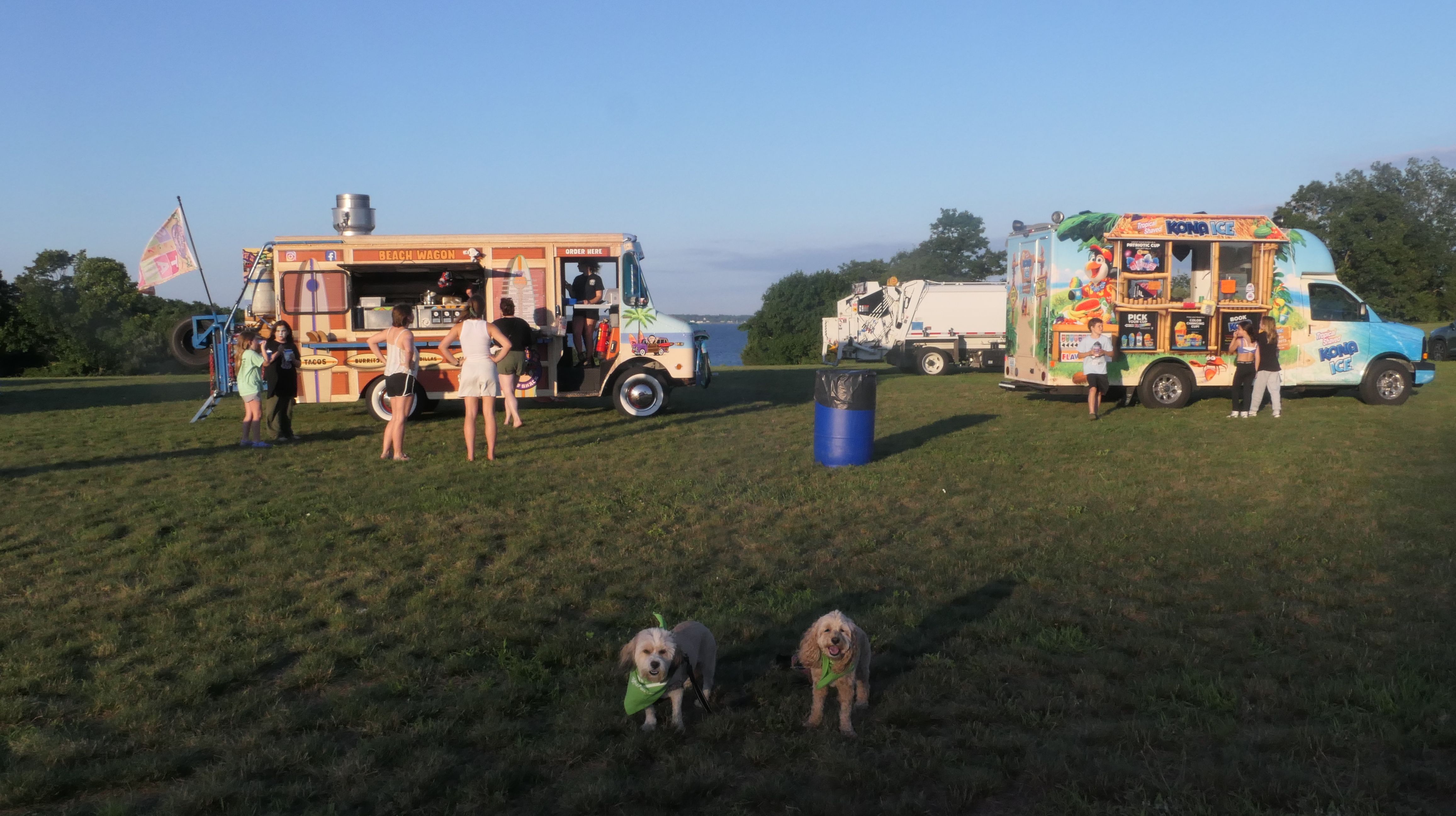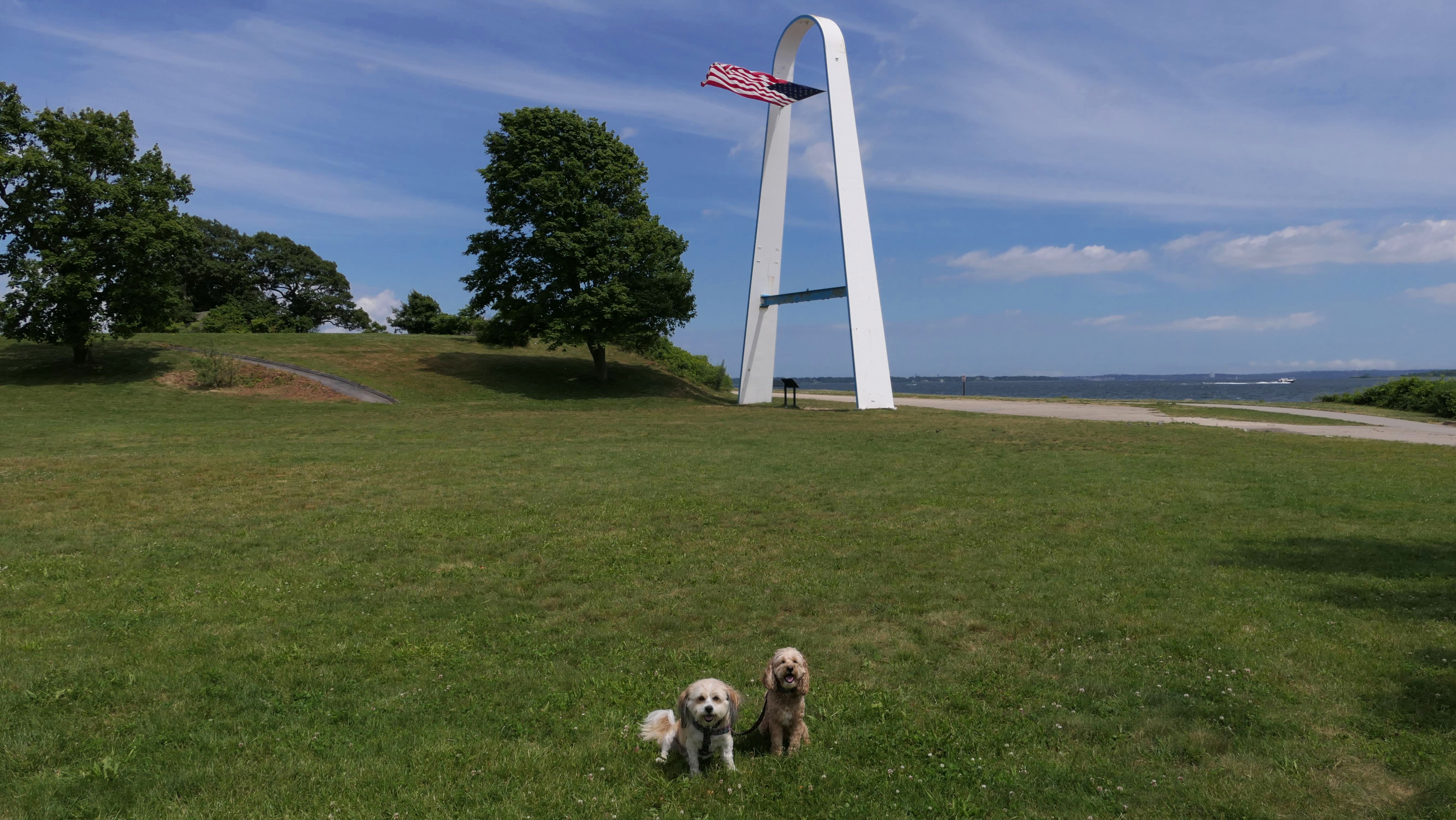 We visit Rhode Island often time a year, since it tends to be cooler than Connecticut, especially around the shore and the bay. But Rhode Island is a small state, so we've had to repeat places quite a bit this year. We originally visited this great, dog-friendly park a bit over two years ago. This park is worth repeating! This time, it was later in the day, and a bit sunnier, but we did much of the same walk as the first time. We generally followed the paved loop trail around the park, but took some of the side trails that lead out to the rocks. There are a couple beach areas, and you can even see both the Jamestown and Newport bridges in the distance. The biggest difference from our last visit, is that an event was going on this time. They have movies in the park on Thursday nights in the summer. There are food trucks and a few vendor tents for people to enjoy before the movies start at dusk. The movie this night was "DC's League of Super Pets", but we didn't stay for the film. The whole thing is presented by Wave Federal Credit Union. The very nice women at the Wave tent provided Mandy & Lexi with scarves, and gave them lots of attention, which they love!