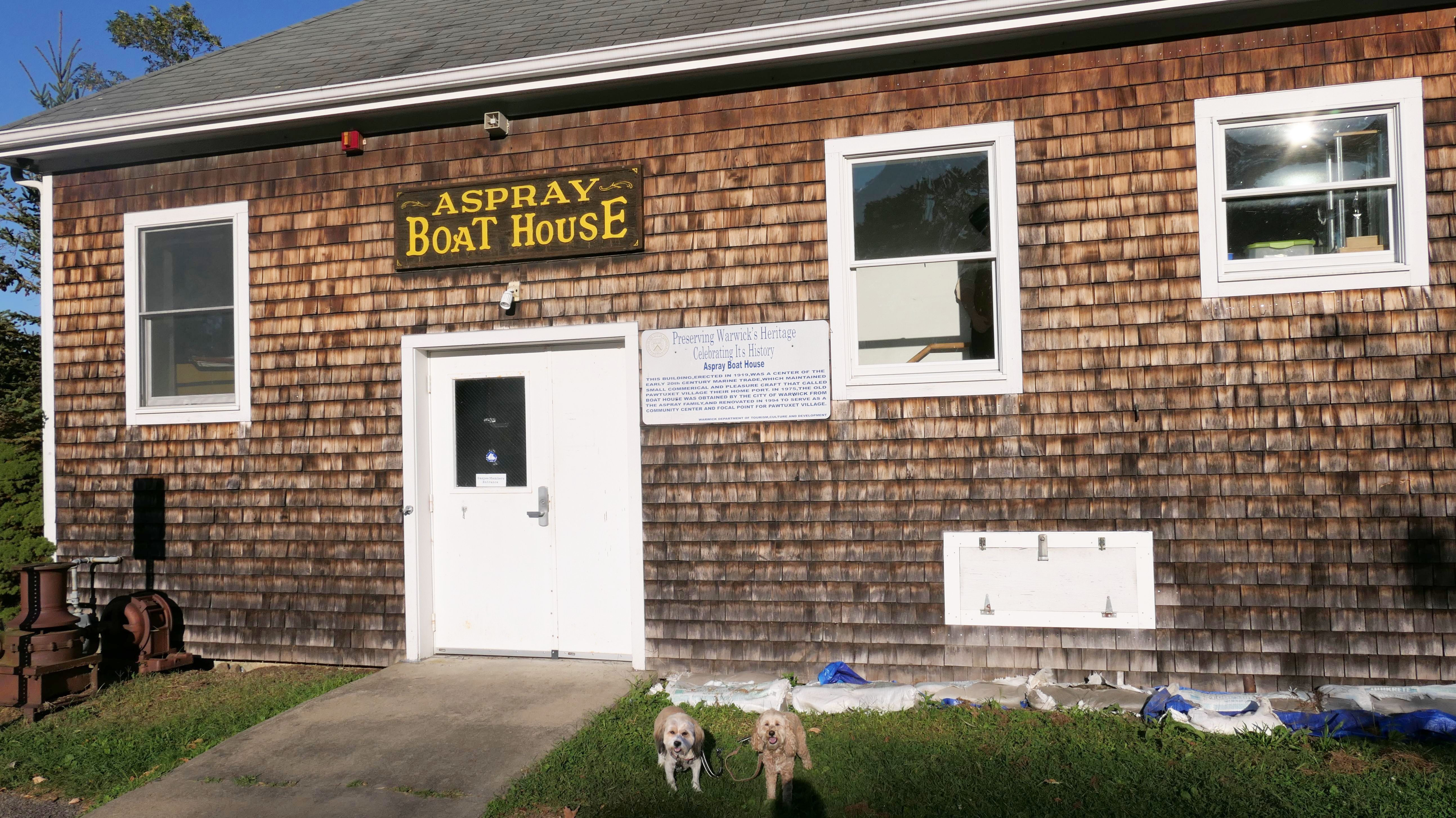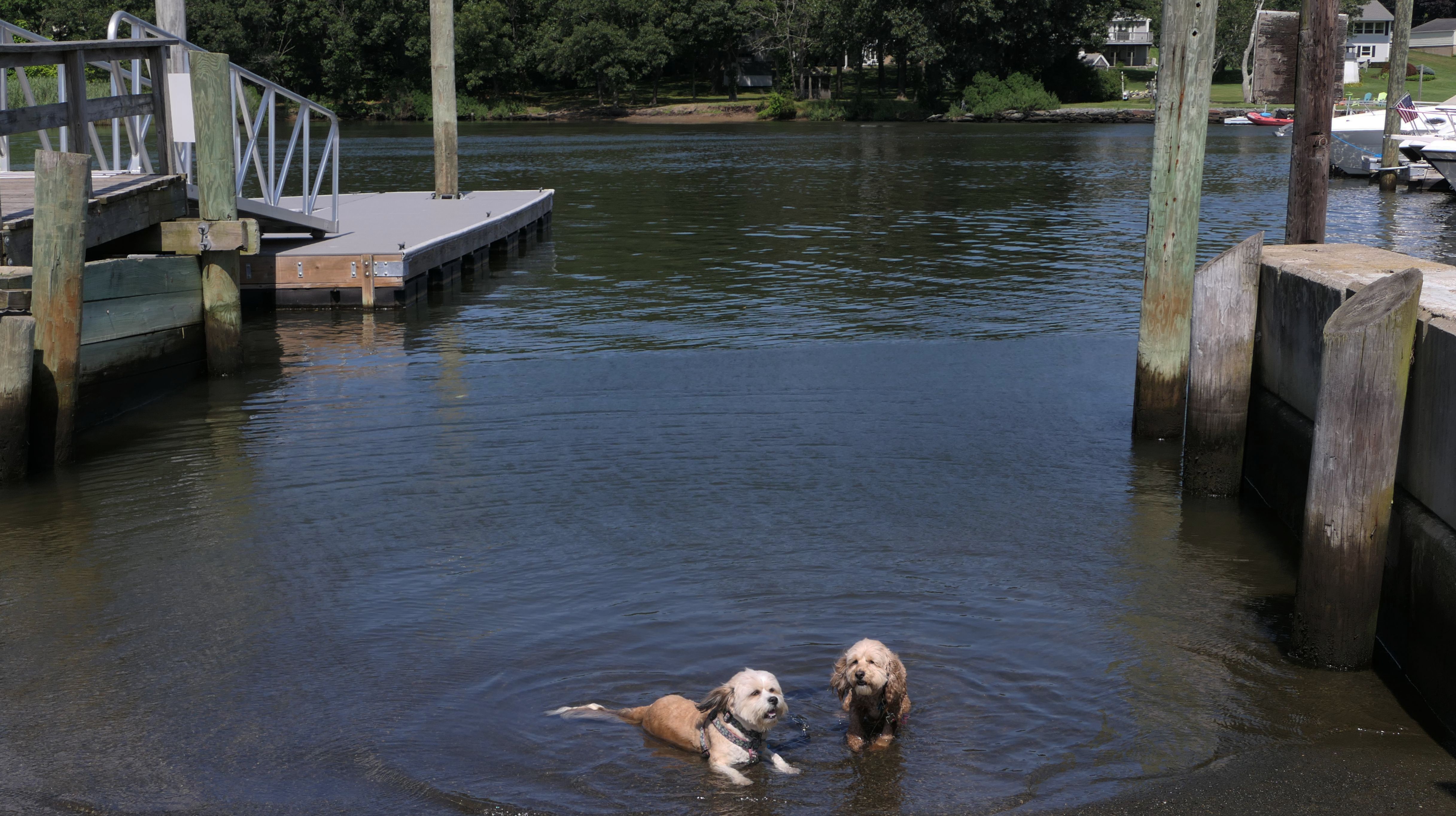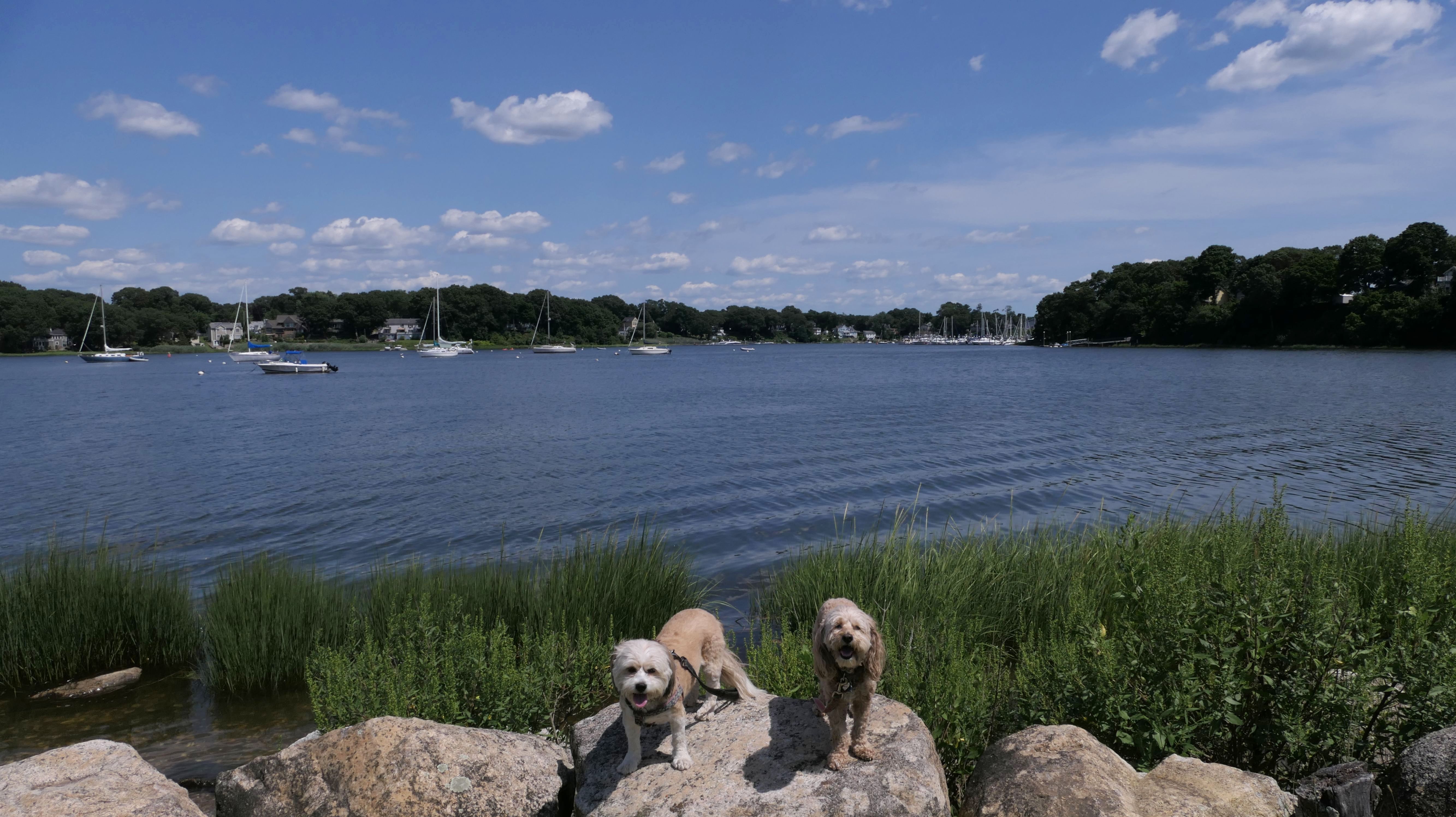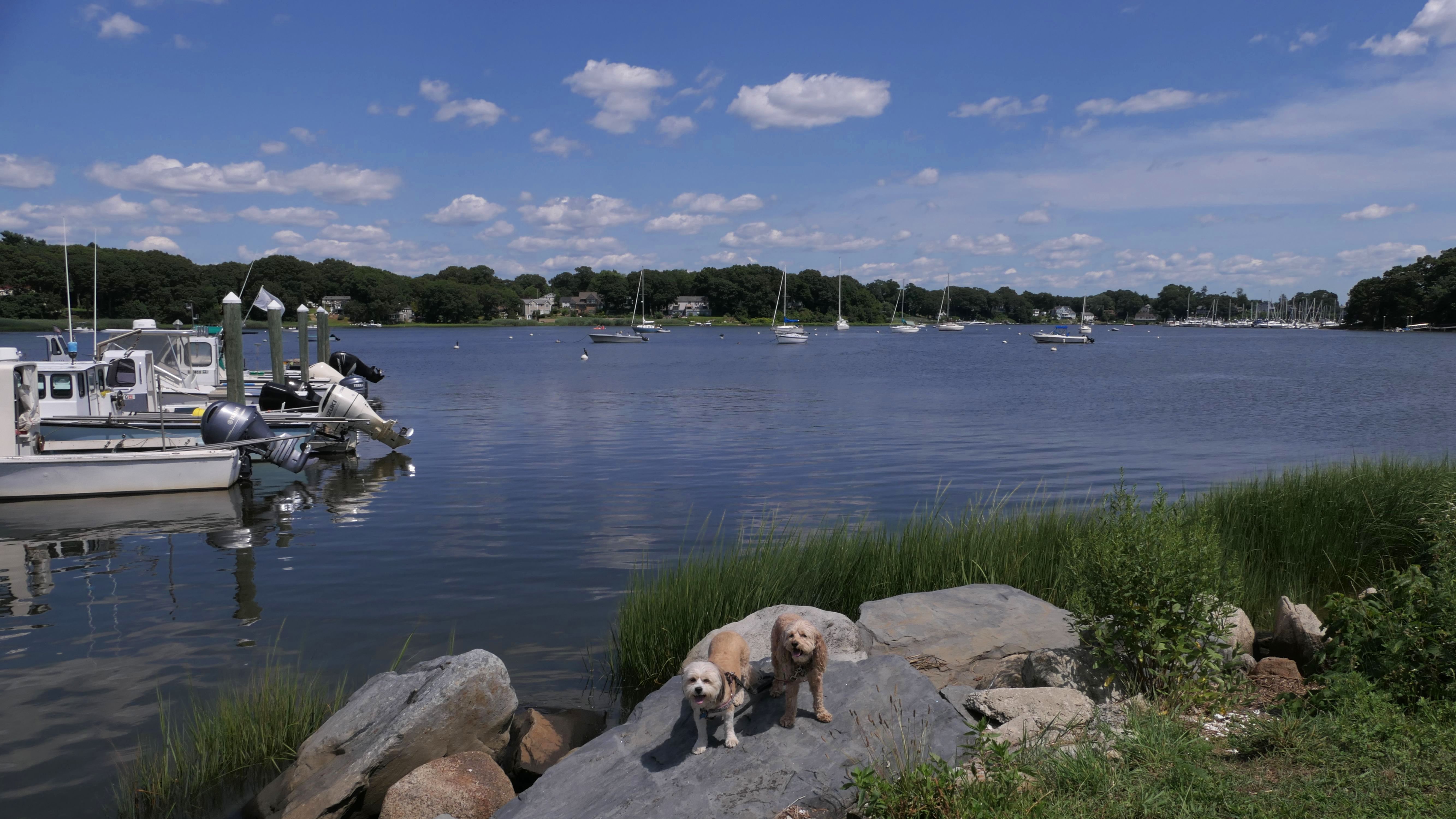 This is a small neighborhood in Warwick, bordering Apponaug Cove. There's a very small park here, as well as a marina, a restaurant and a gift shop. We walked from the park at the end of Hallworth Drive, down Arnold's Neck Drive, toward Post Road and back. Near the marina, there is a boat launch where the dogs decided to cool off in the water.