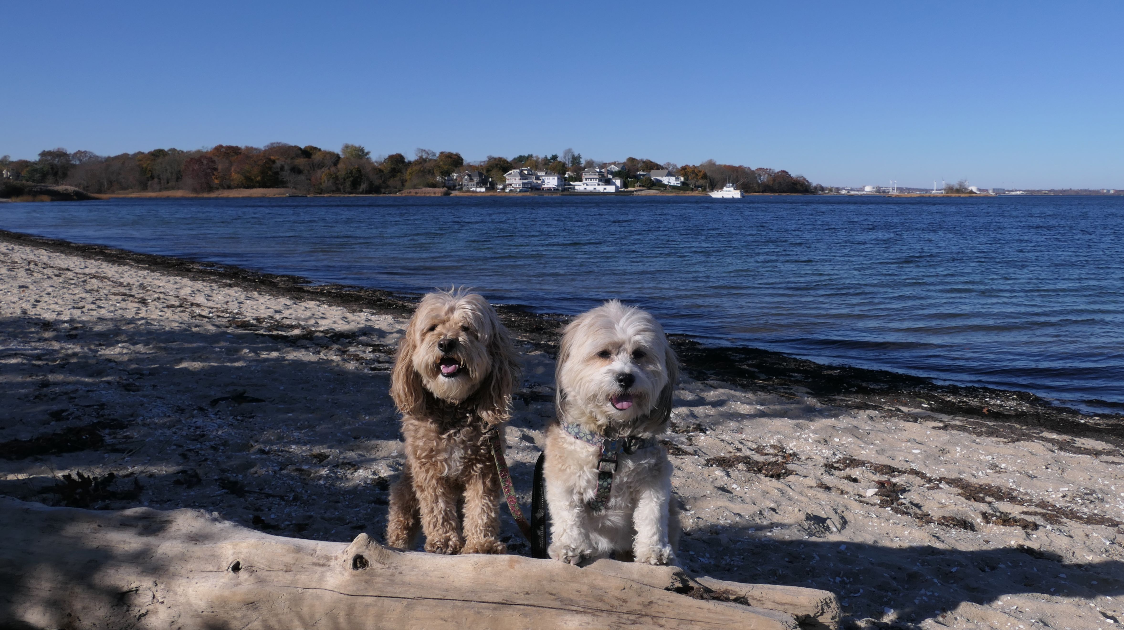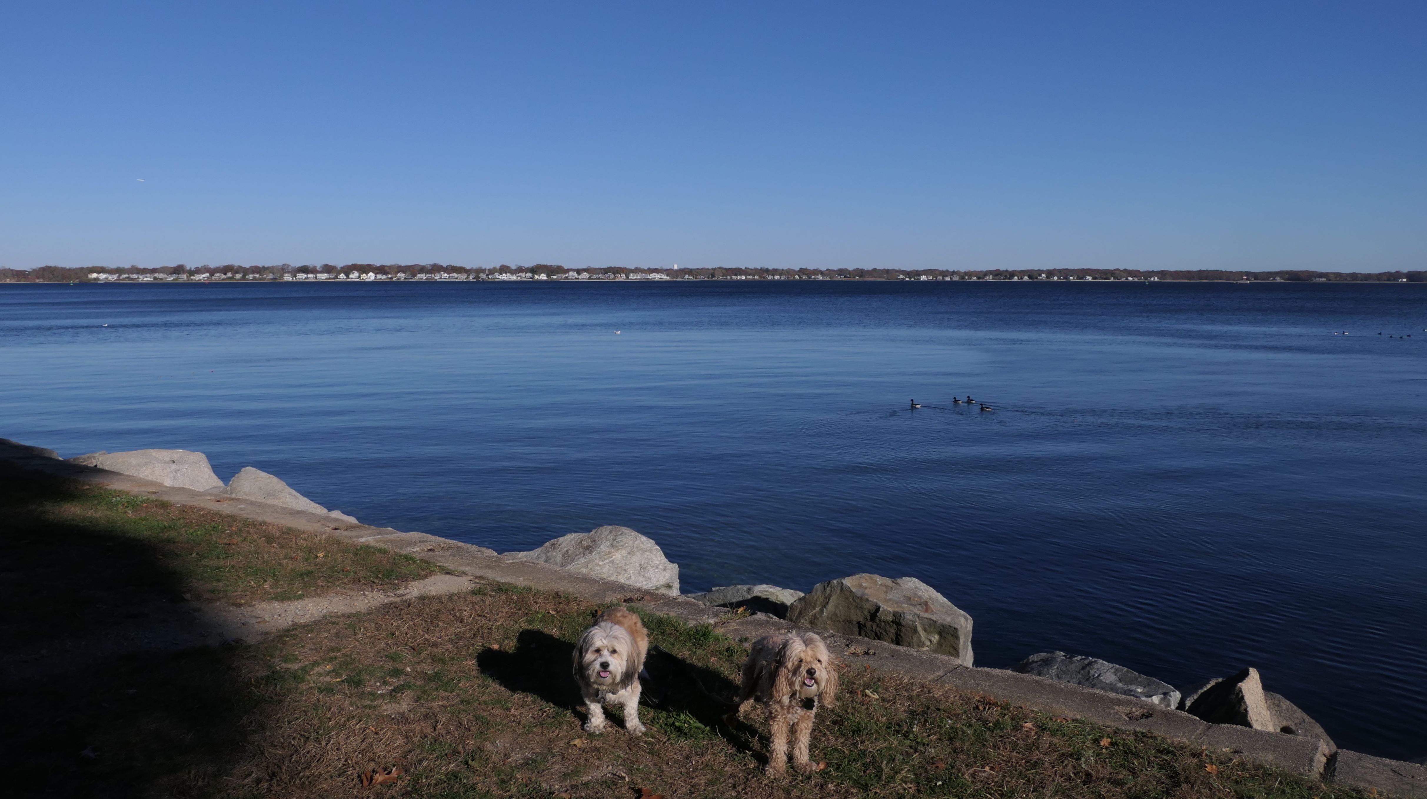 We tried to visit here back in June, but there are only six parking spots, and one of them is a handicap spot. All six were full that time, but this time we were in luck....only three spots were fill upon our arrival. I get the impression that this a primarily a neighborhood park and beach, with only limited access for outsiders. Word is that the neighbors will have you towed if you are parked outside of the six spots. The beach area is protected with a gate. Beyond the gate is a small walking path which leads to a public costal walk. We headed to the actual Gaspee point first. The beach is a bit rocky, with many loose pebbles and shells. Waves are mild this far up the bay. After walking around the peninsula as far as we could, we turned around and headed the other direction. There is a seawall with a mowed walkway at the southern end of the peninsula. There are access points along the way that lead to the neighborhood, but no additional parking areas. There are doggie waste stations with poop bag dispensers and receptacles along the way. We walked a bit over two miles total here, on another gorgeous and unseasonably warm autumn afternoon. It's a good place to bring dogs, especially in the warmer weather when they can cool of in the water, like Mandy and Lexi did today!