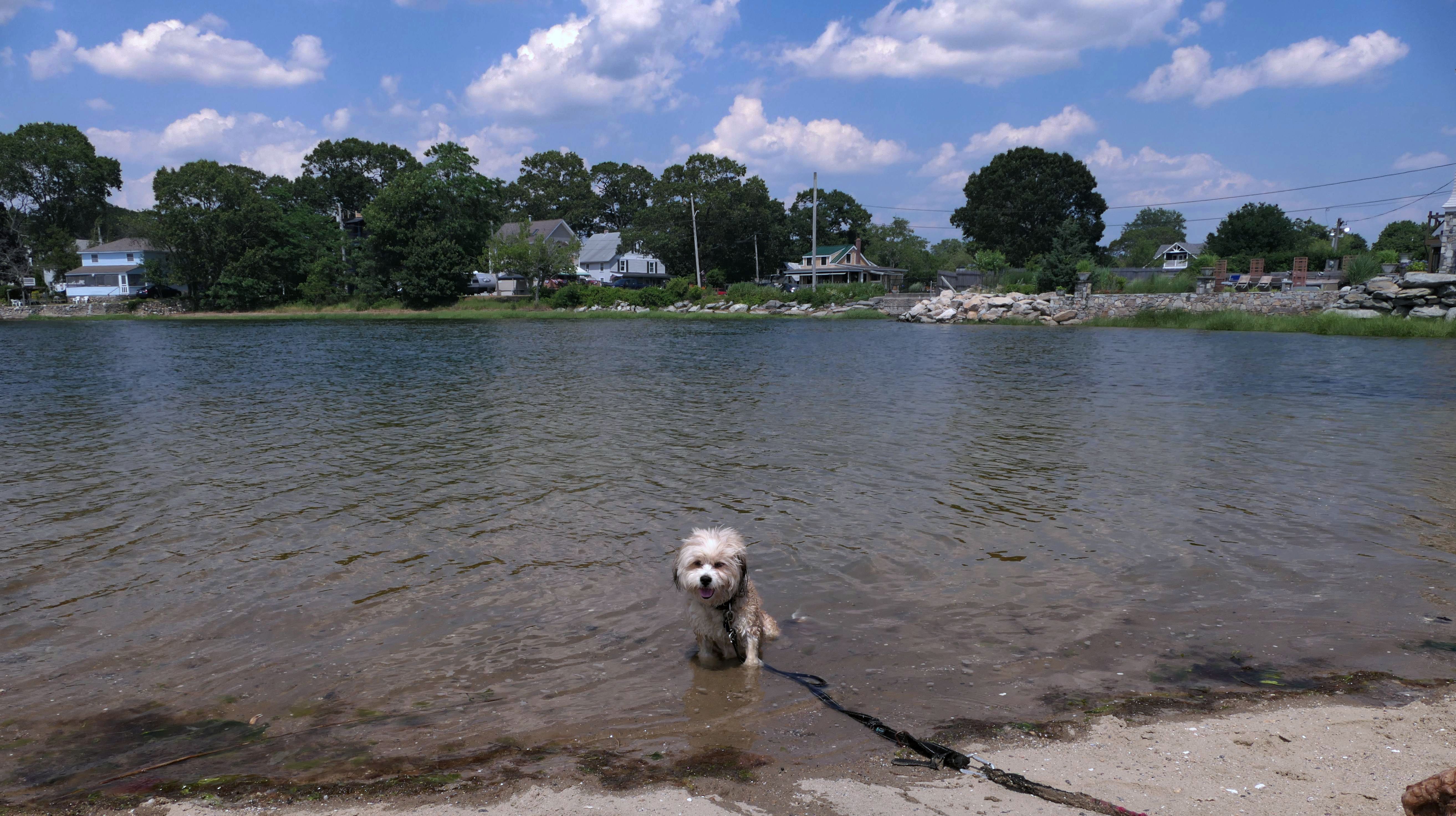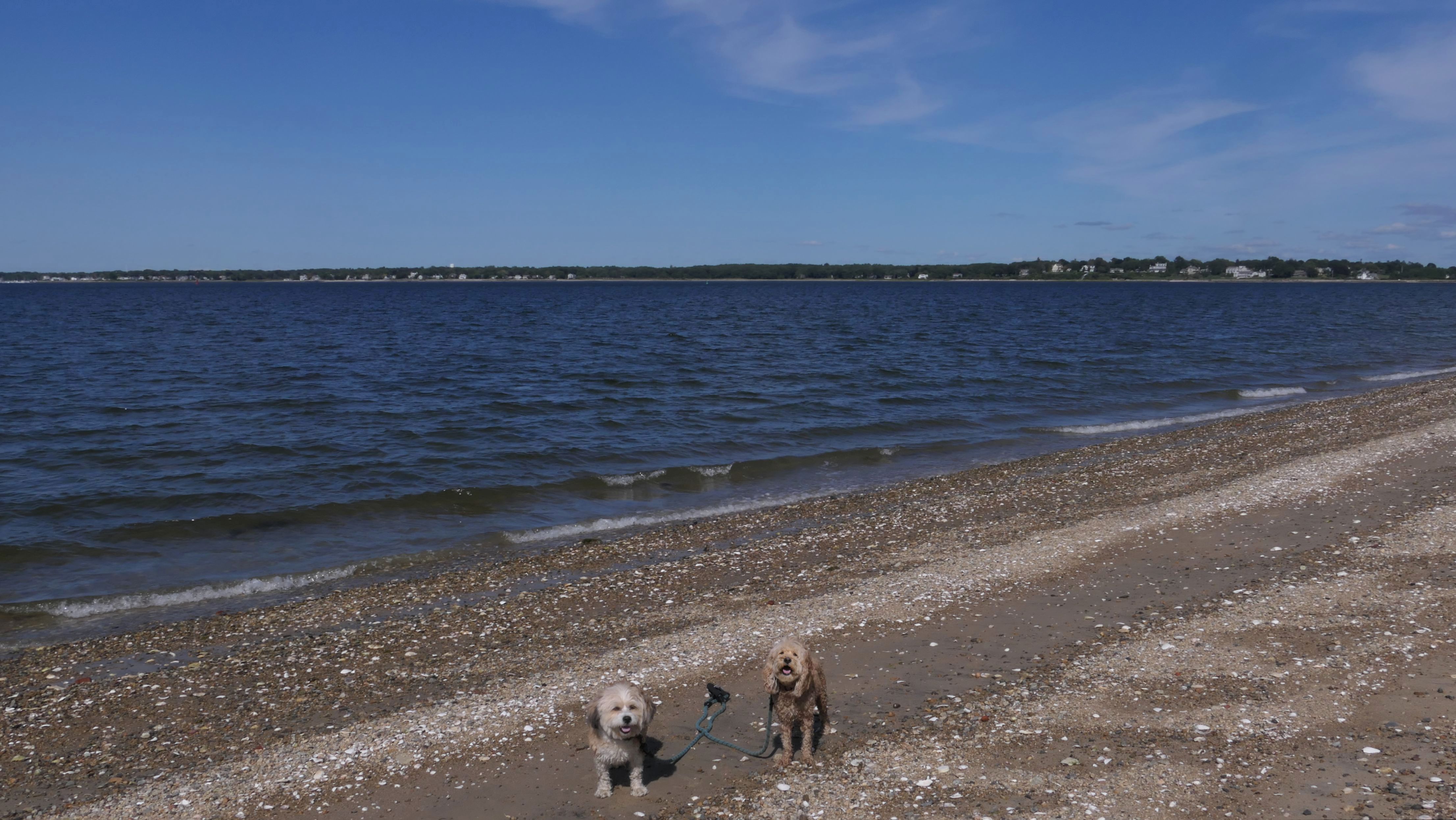 This was our second trip to this beach. This time we didn't go on a long hike first, so we had more time to explore the beach than we did the first time. It turns out that there is a whole other beach area east of the main guarded beach, and south of the Oakland Beach boat ramp. This is a good area for the dogs. The section just to the west of the guarded beach, and part of the walking path, was closed because they were setting up for a fireworks display later in the evening. Mandy and Lexi enjoy beaches like these, with mild waves. It was a hot day, so the dogs were in the water quite a bit. We also walked the area in front of Iggy's Chowder and Doughboys. Along with our walk at Sunset Beach at Brush Neck Cove, and the Suburban Parkway access point, we walked about 2.5 miles total.