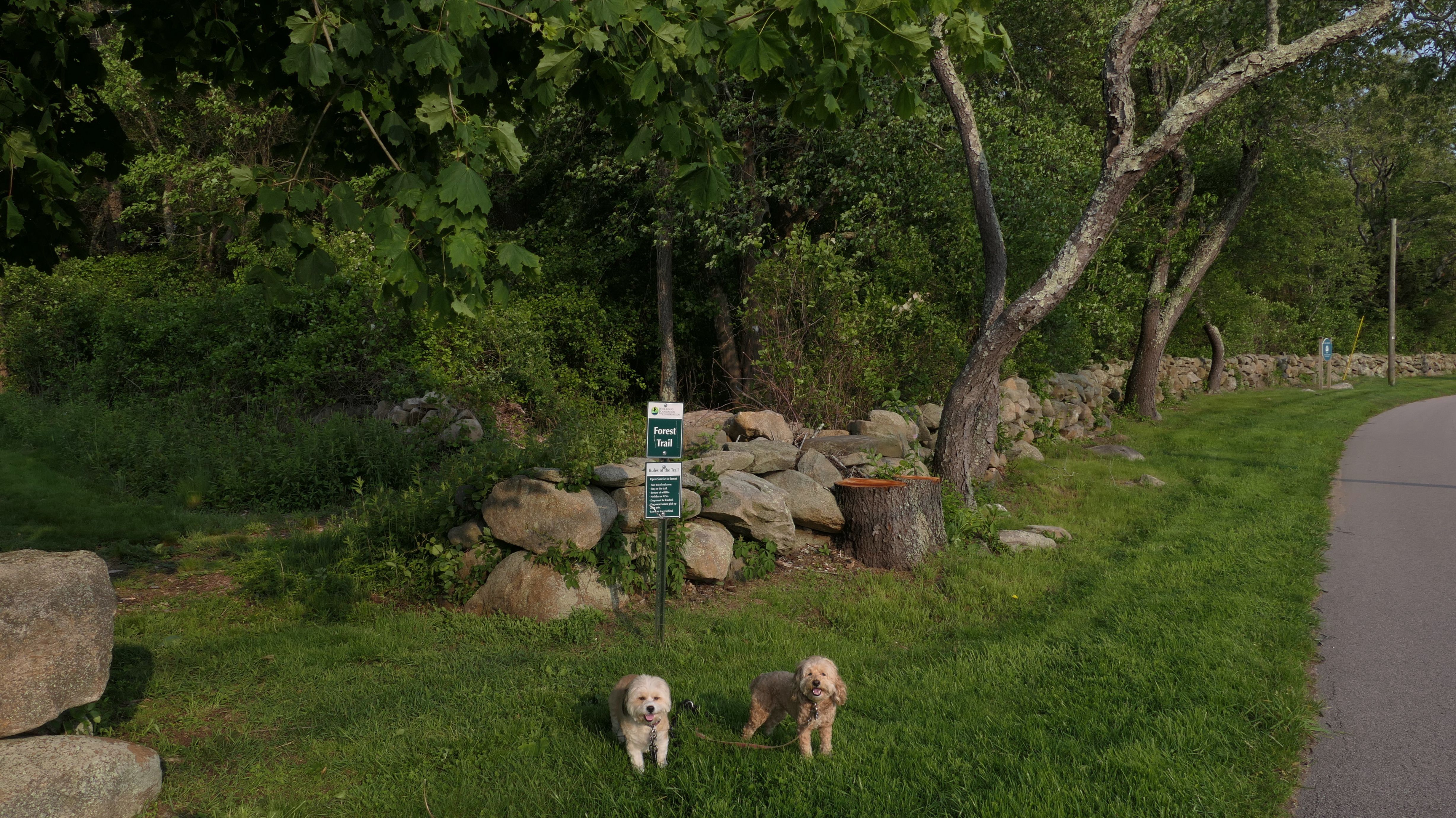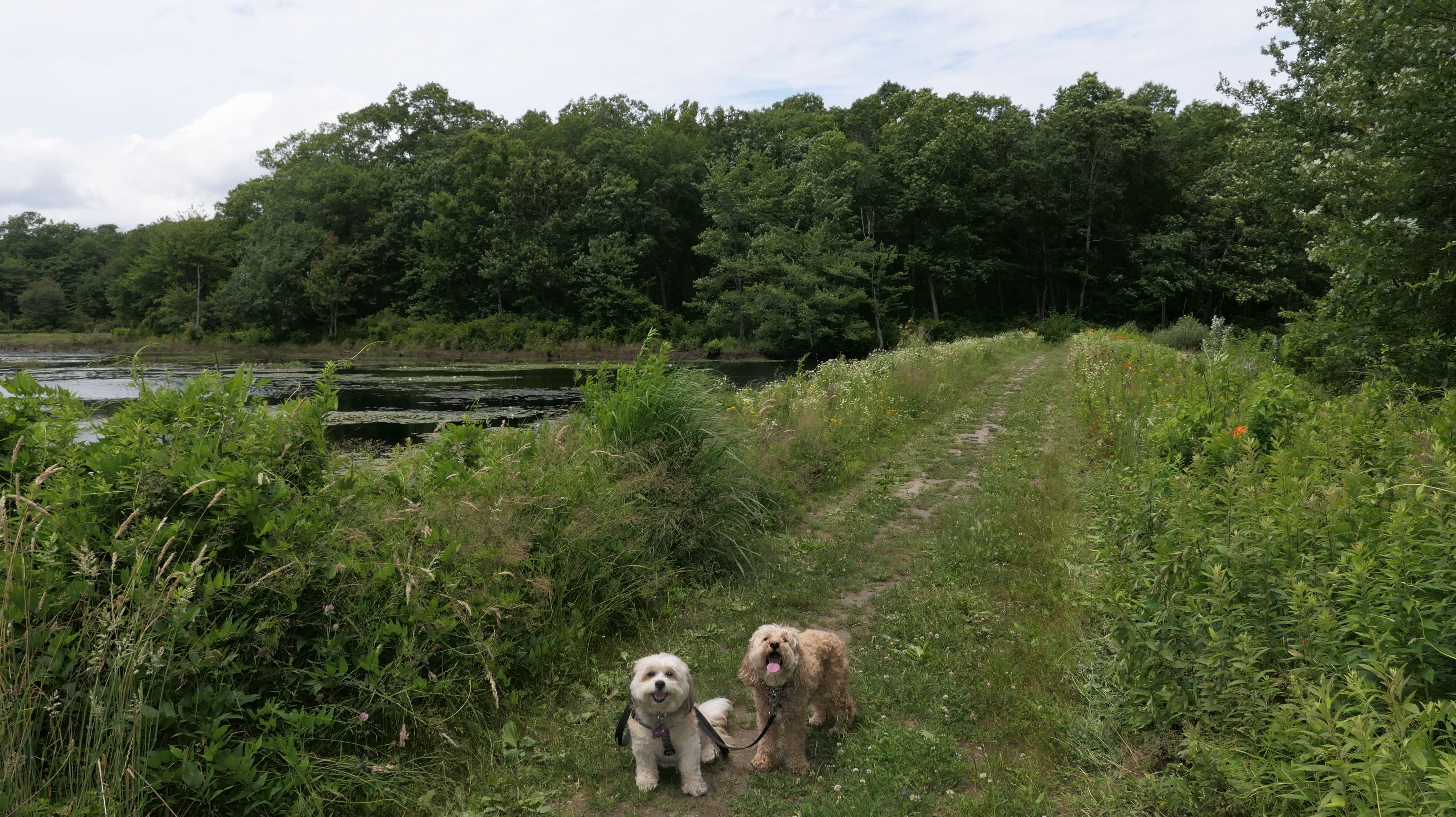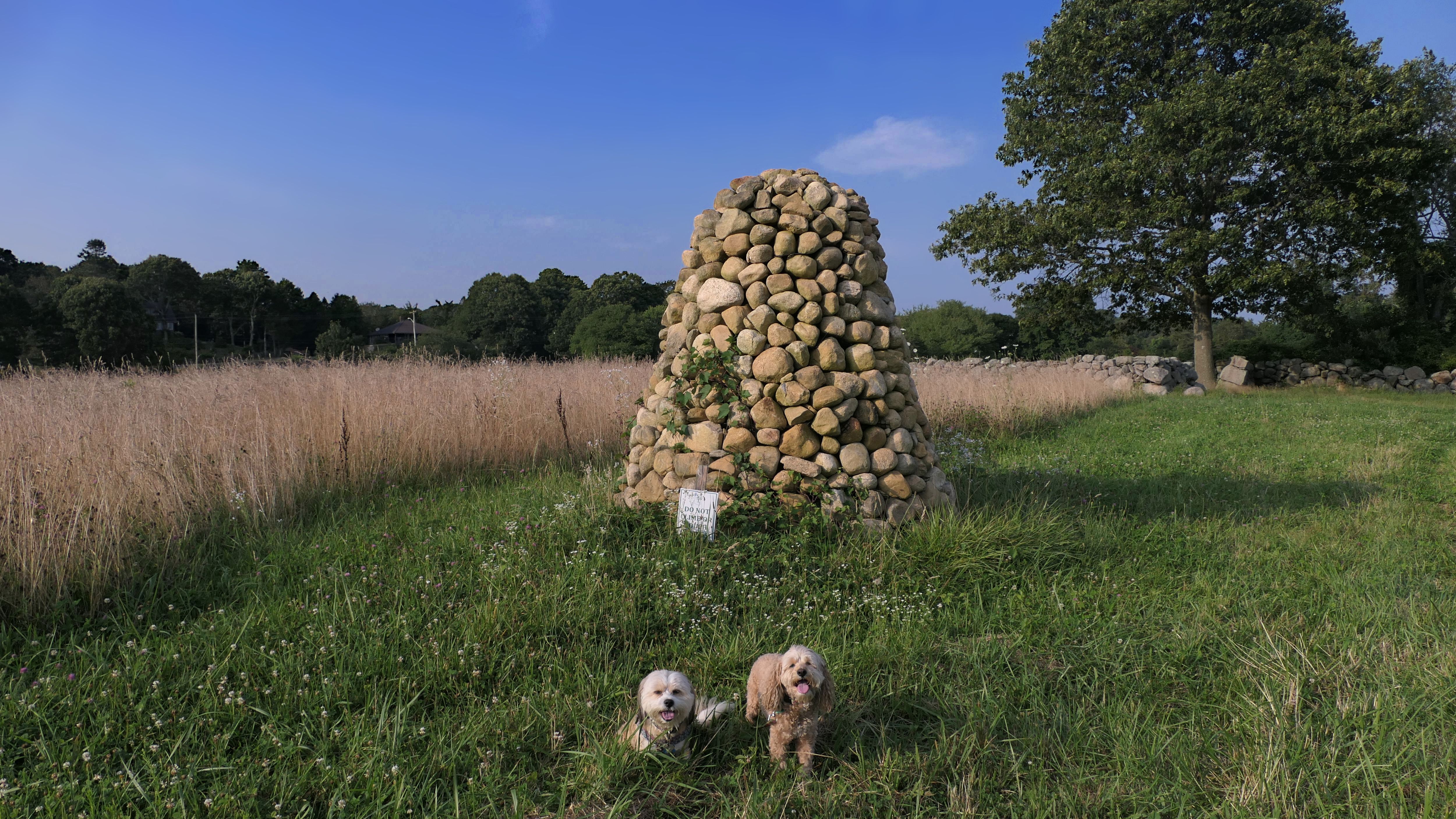 This looks like a nice place, with the stone walls and the cairns, and the salt pond, but this was a rough two mile hike. The trail is in the shape of a three prong fork, with the three prongs going out to the salt pond. The problem was that the kind of trails here need to be mowed, and they haven't been mowed in a while. Most of the trails were overgrown. The first part of the trail, sort of the handle of the fork if you will, is easy enough to traverse, despite the long grass, but each of three prongs caused challenges. The first one was the most overgrown, but the also the driest, with only a little bit of mud. We were able to get the closest to Winnapaug Pond here. The second and third trails were easy at the start, but got muddier and more overgrown the closer to the pond we got. I wound up carrying the dogs over long stretches on the 2nd trail, and we simply turned around when we reached the mud on the 3rd trail. I also had to pull a few ticks off both myself and the dogs when we got back to the car. The long grass is a breeding ground for ticks. While there was only a few ticks on us this time, I wouldn't advise coming here earlier in the season, when tick season is at it's peak. This seems like it could be a wonderful spot, but it needs a bit more maintenance.
