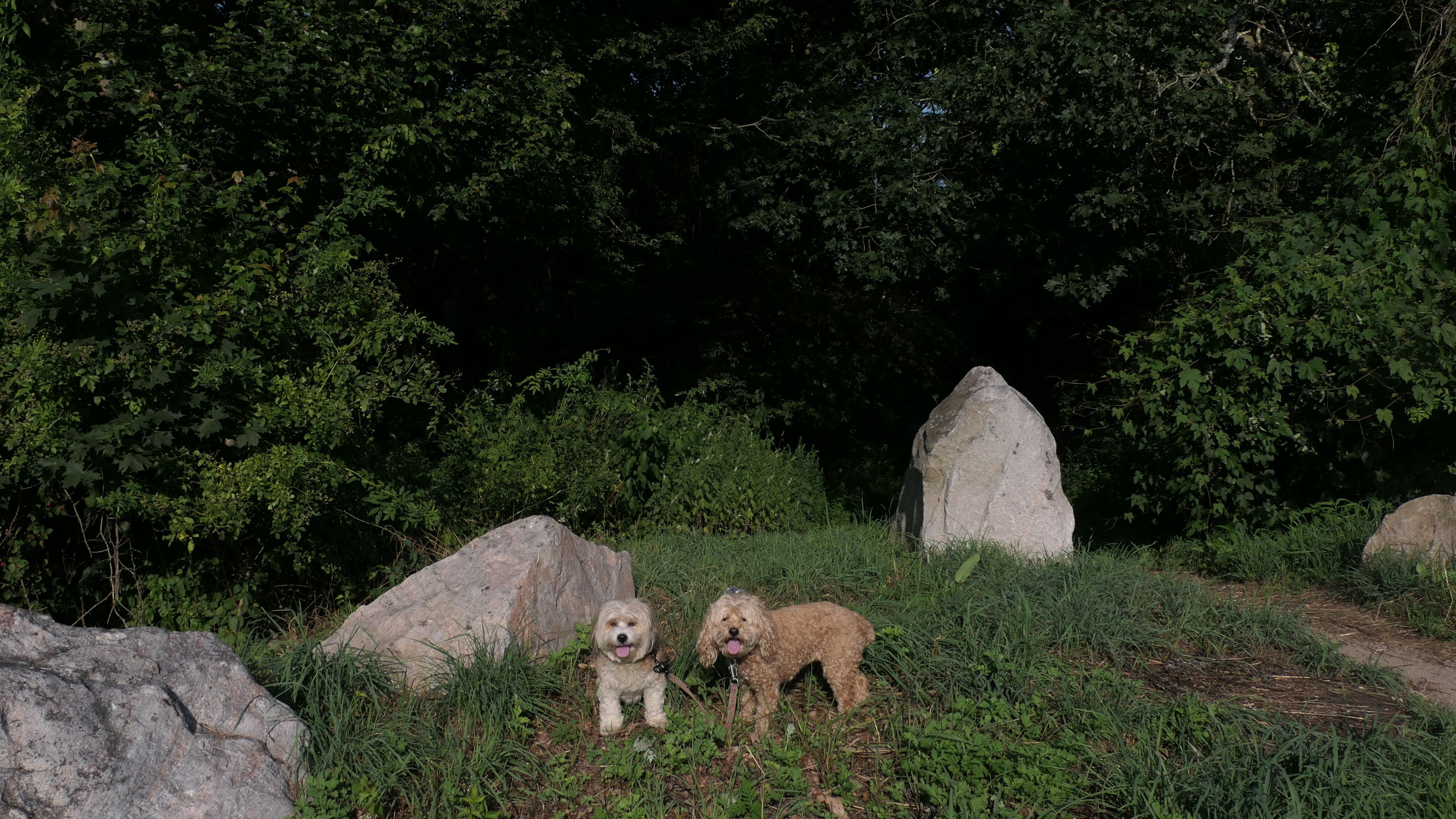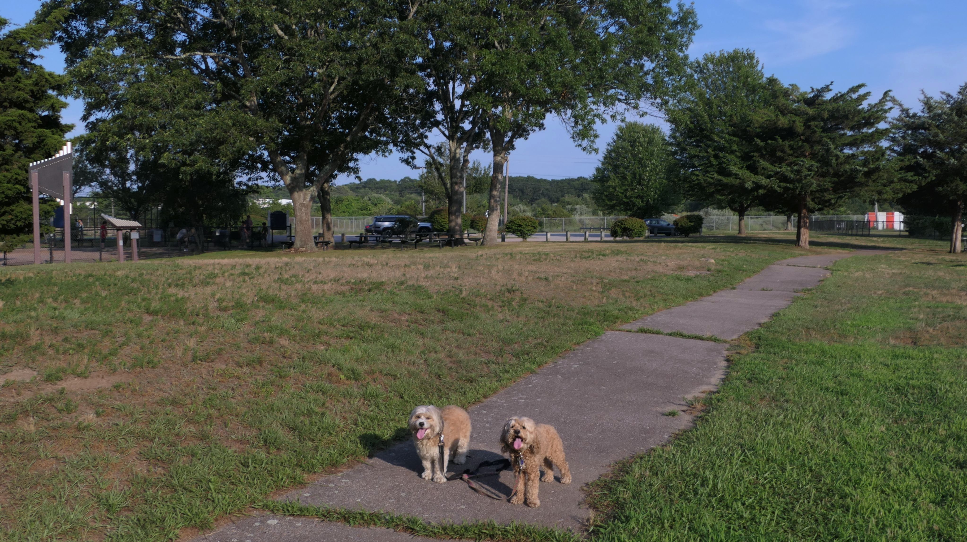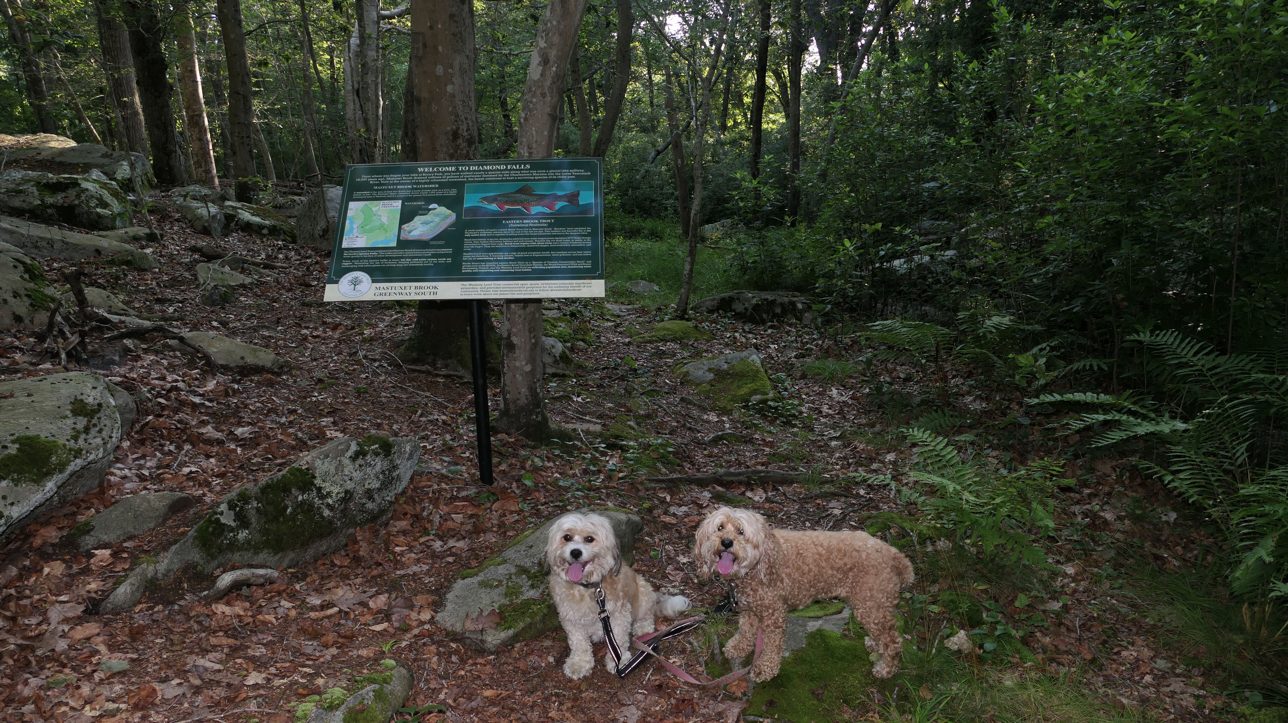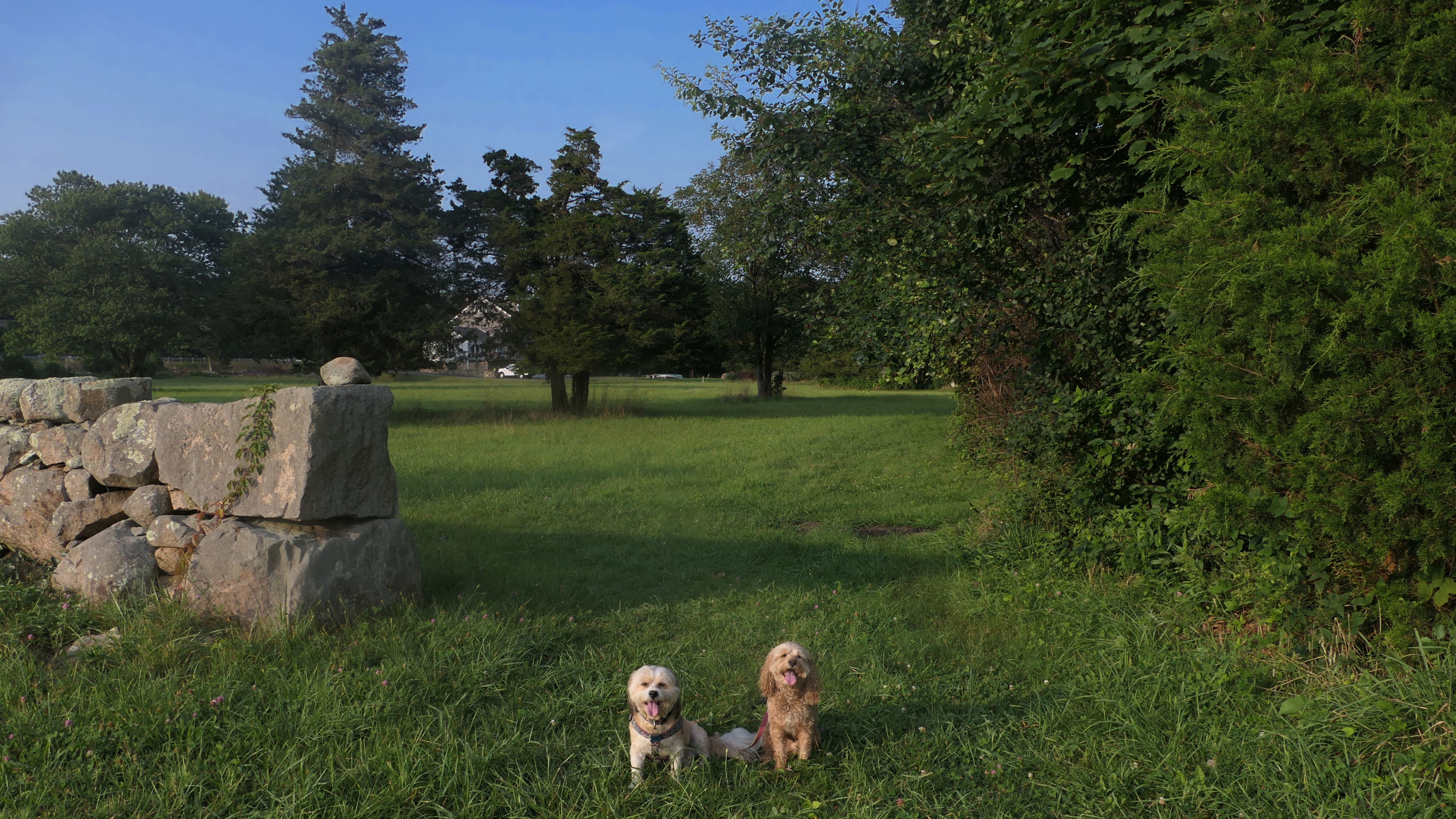 This looks like a nice place, with the stone walls and the cairns, and the salt pond, but this was a rough two mile hike. The trail is in the shape of a three prong fork, with the three prongs going out to the salt pond. The problem was that the kind of trails here need to be mowed, and they haven't been mowed in a while. Most of the trails were overgrown. The first part of the trail, sort of the handle of the fork if you will, is easy enough to traverse, despite the long grass, but each of three prongs caused challenges. The first one was the most overgrown, but the also the driest, with only a little bit of mud. We were able to get the closest to Winnapaug Pond here. The second and third trails were easy at the start, but got muddier and more overgrown the closer to the pond we got. I wound up carrying the dogs over long stretches on the 2nd trail, and we simply turned around when we reached the mud on the 3rd trail. I also had to pull a few ticks off both myself and the dogs when we got back to the car. The long grass is a breeding ground for ticks. While there was only a few ticks on us this time, I wouldn't advise coming here earlier in the season, when tick season is at it's peak. This seems like it could be a wonderful spot, but it needs a bit more maintenance.