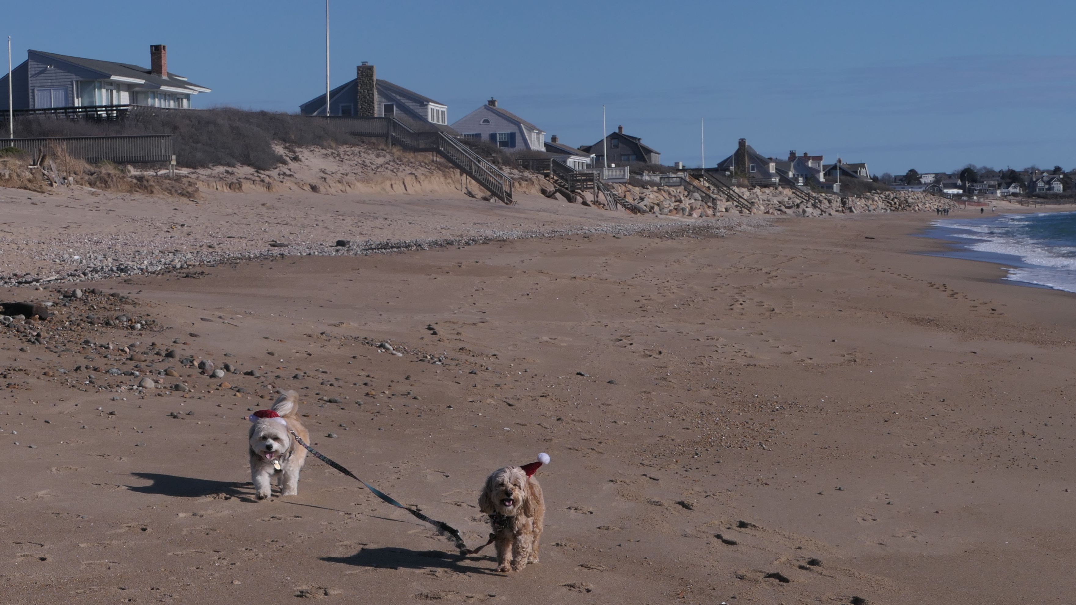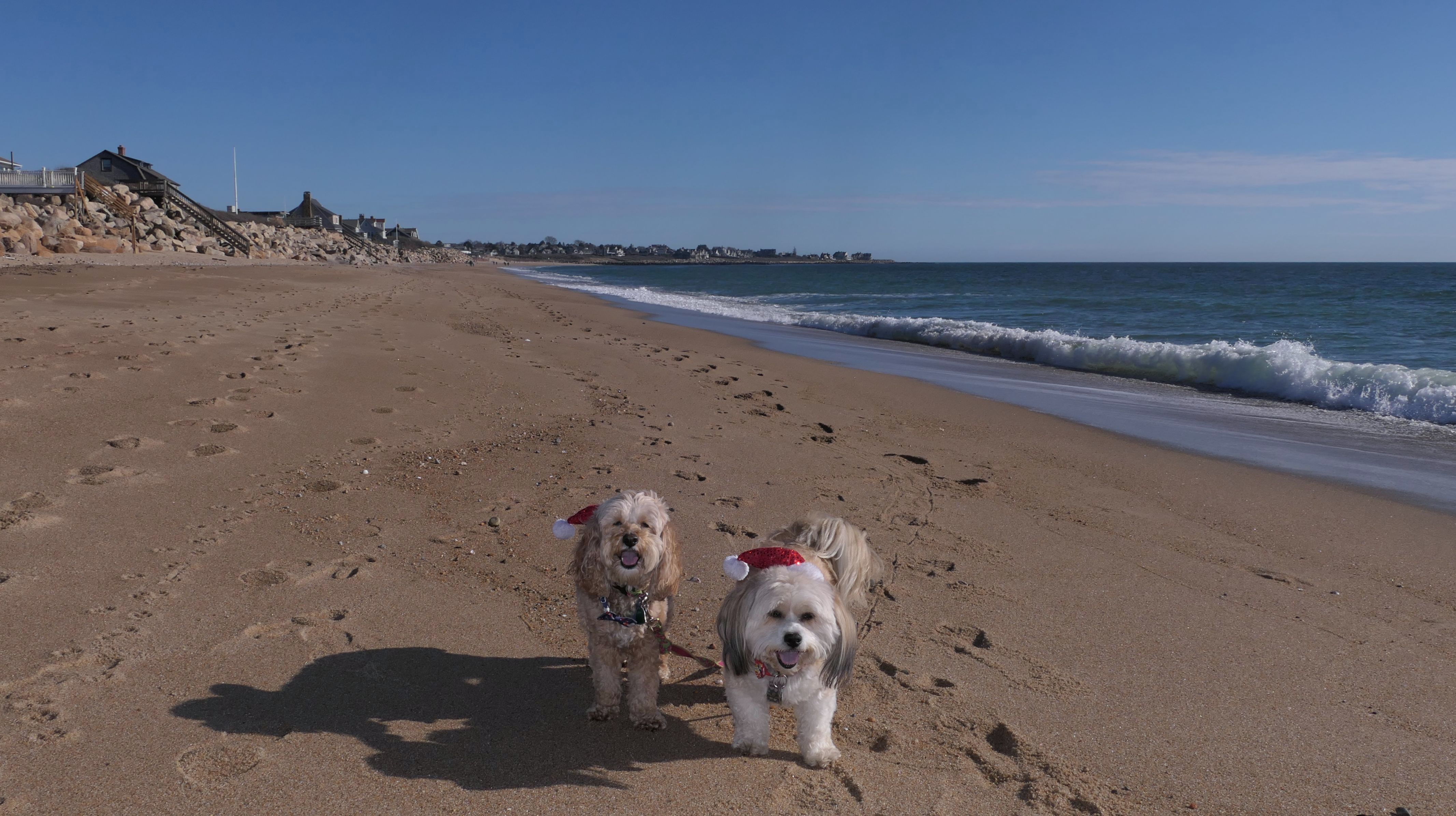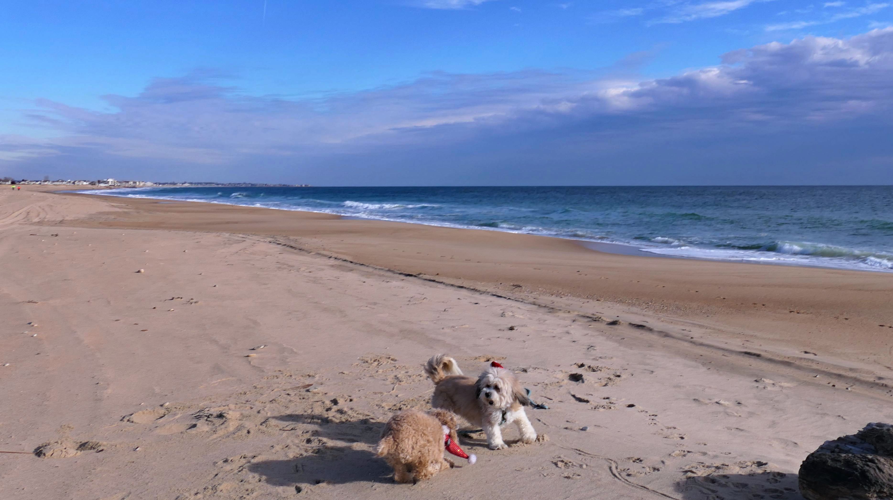 Nothing says Christmas in New England like a trip to the beach! We had a great four mile walk on Christmas Morning. It was damp, dreary, cloudy and foggy in the Hartford Connecticut area, but sunny and near 60 in Westerly. We couldn't park at the main lot since Atlantic Avenue was still flooded from the storm the week before. We parked at Dunes Park just to the west of the breachway, and walked west along the beach. Our route overlapped a bit with a section of the beach we we walked when we were at Misquamicut last year. The dogs were great sports with their Santa hats! And with the hats, we can tell these photos were taken on Christmas and not some day in July!