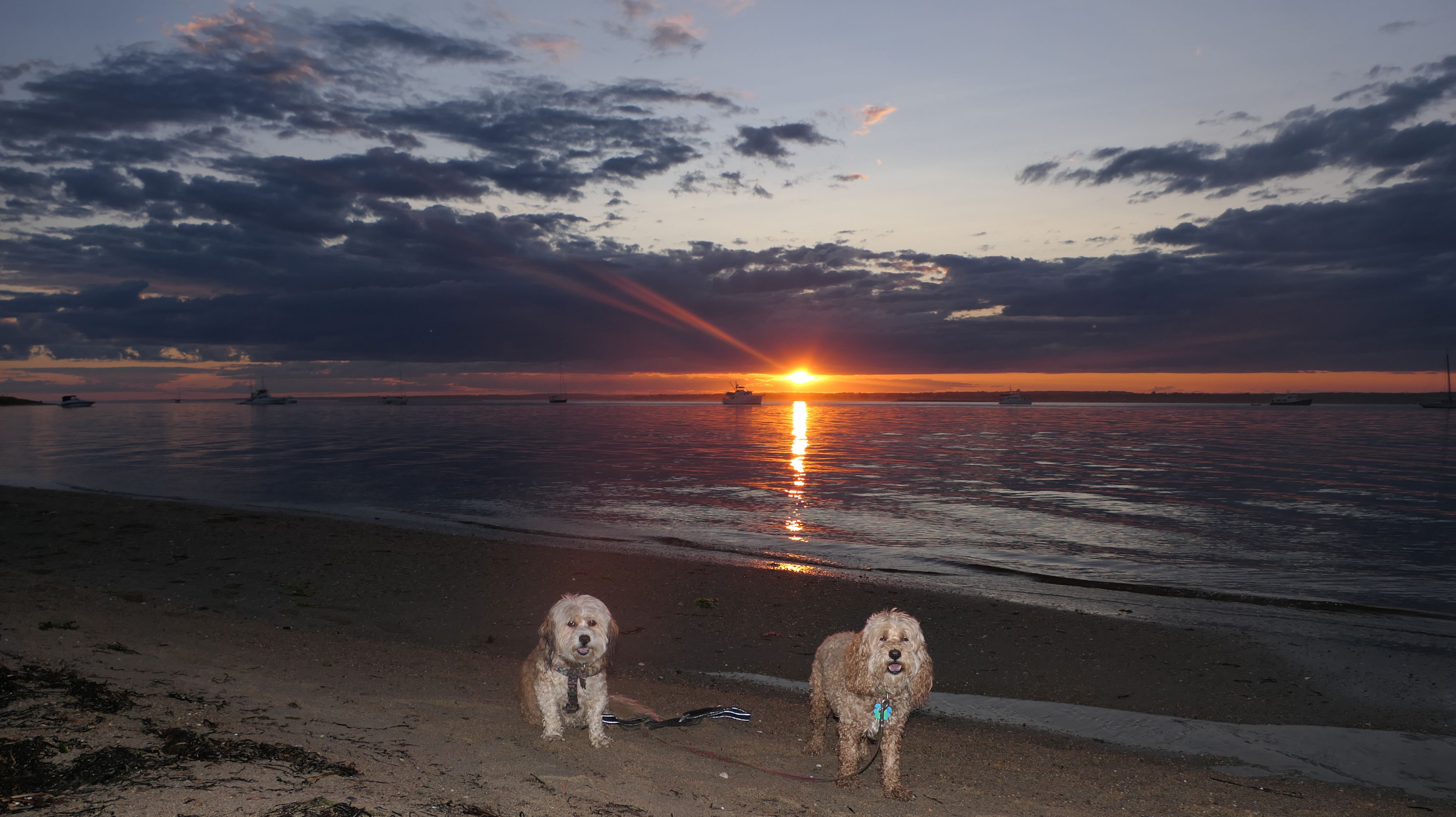 Since it had been three and a half years since the last time we walked the full loop here, it seemed like a good time to revisit this fantastic spot. The first time it was 30 degrees in December, so I thought going in the middle of summer might be a nice change! Dogs are allowed here in the summer time after 6PM, and we got started around 6:15PM, shortly after a considerable rain storm had moved through the area. Napatree Point is a small peninsula that sticks out of the southwest end of Westerly, blocking Stonington, CT from the open waters of the Atlantic. We started on the ocean side, which is pretty must just a nice walk on the beach. It was just after high tide, and the waves were pretty strong. Once we got to the rocks at the tip of the peninsula, there wasn't a way I could find to safely get to the other side of the point. There are a few cross-over trails along the way, but they were roped off due to piping plovers nesting, so we couldn't walk the same loop that we did back in December of 2020. We had to head back along the beach the way we came, and cross over to the bay side much closer to our starting point. We made it just in time for the sunset, which was barely visible between the few clouds that had moved through. Since the waves are tame on the bay side, the dogs enjoy the water much more on this side! This was a wonderful evening hike, even if we couldn't walk the entire route as planned.