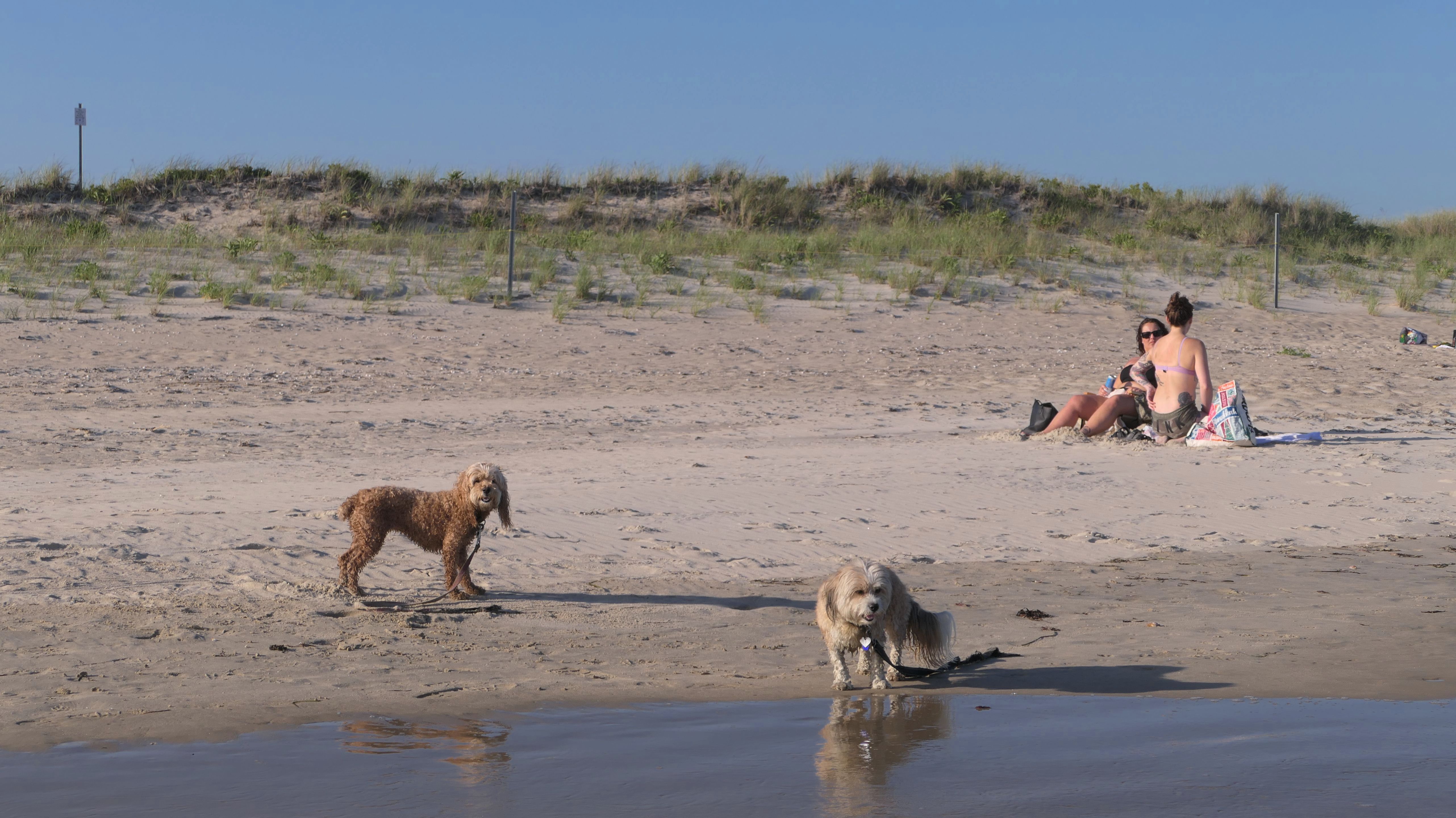 It was a beautiful evening, so we couldn't resist another walk on the beach. This is actually a series of different connected town beaches, but we started near Dunes Park, so that's the category I'm using for these photos. We actually parked at the fisherman's lot just to the west of the breachway, and headed west, most likely overlapping with Westerly Town Beach. Dogs are allowed on the Westerly town beaches after 6PM during the summer months, and we arrived about 20 minutes after 6. It was actually breezy, and felt kind of cool on the beach, despite it being a hot day. There were a lot of kids playing on the beach, and a number of them asked to pet Mandy and Lexi, who were more than happy to oblige! The waves were crazy this evening. Mandy walked through the edge of the waves a few times, but Lexi avoided them for the most part. We walked about a half mile, before turning around and heading back.