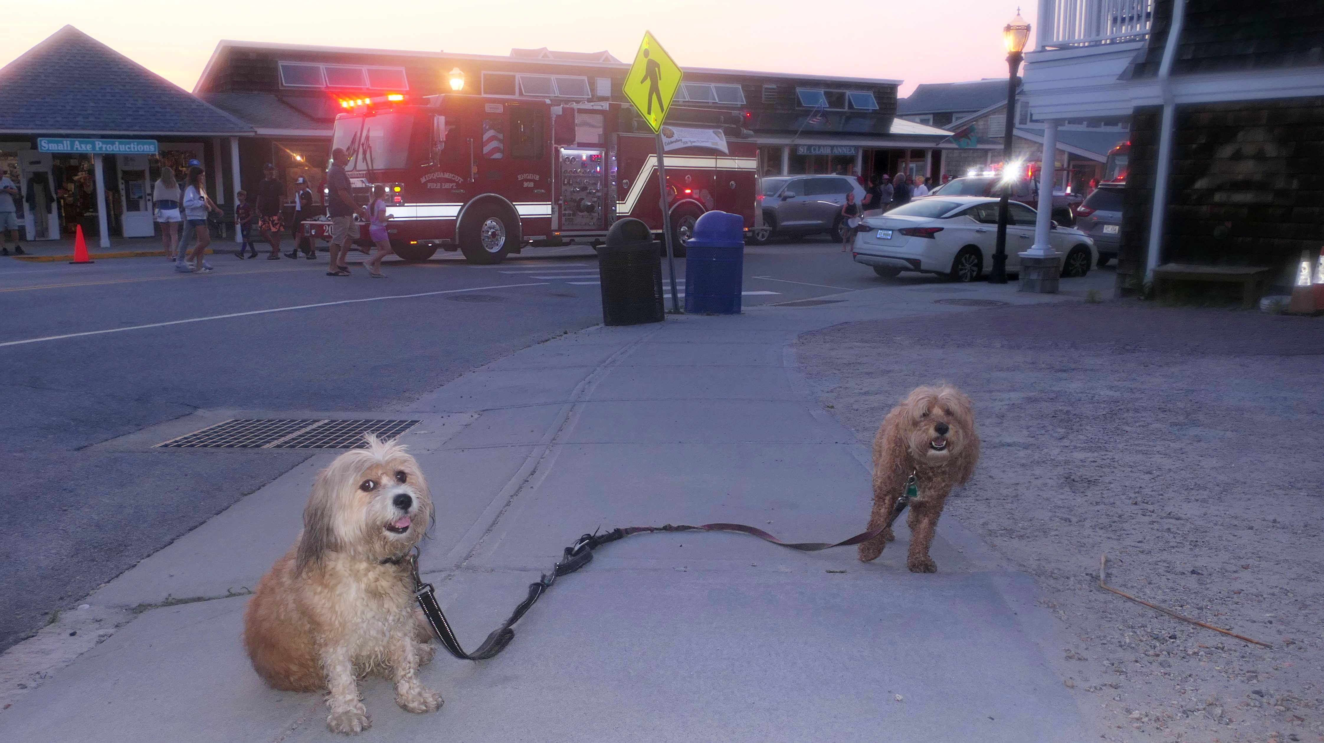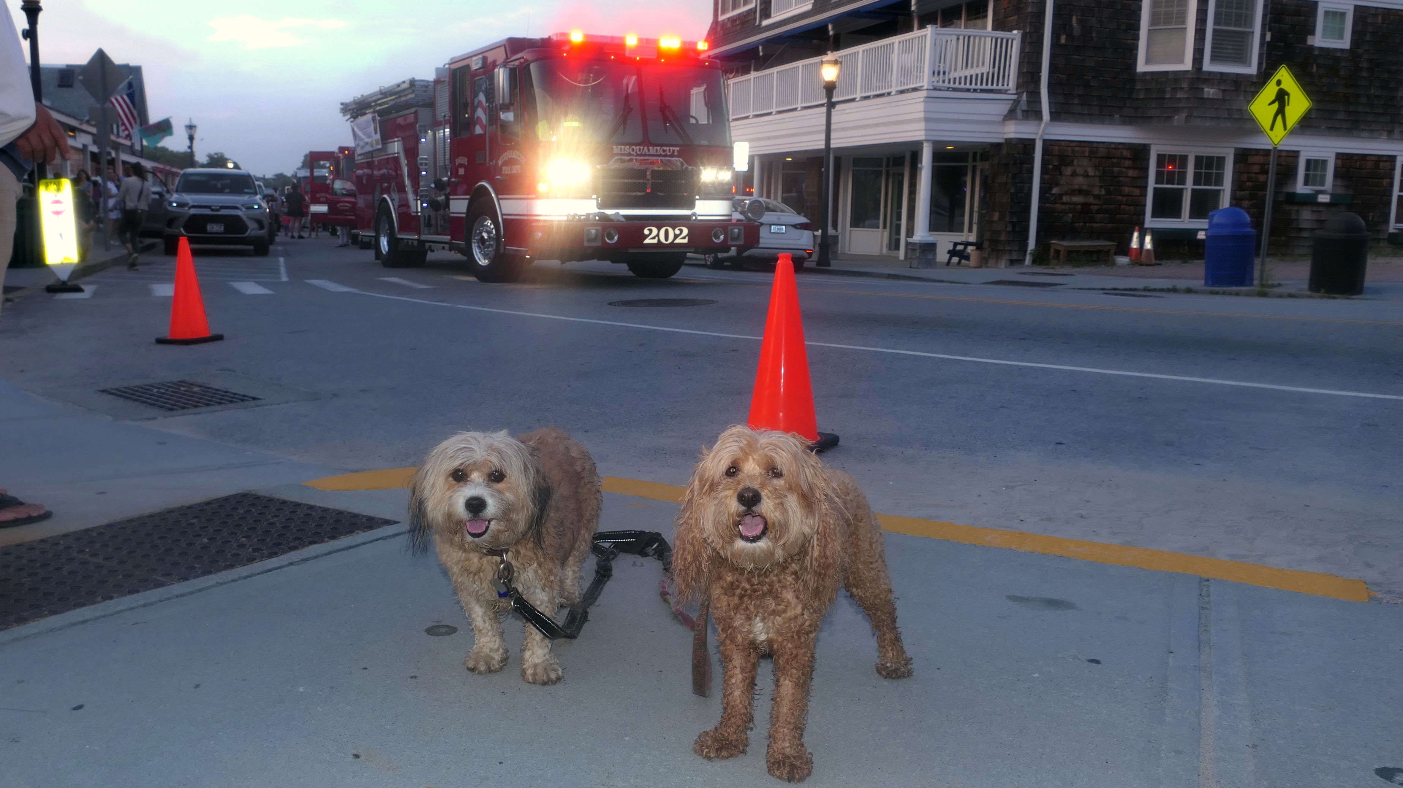 We walked through here on our way to and from East Beach. We've passed through this area many times over the past few years. This was the first opportunity I've head to get good photos of the Watch Hill Carousel. It's usually not open when we visit. The area seemed busier than usual. I was lucky to find a place to park. What I did not realize was that this was the night of the annual Karl E. Kenyon Smokey Bear Parade. A parade of fire trucks and first responder vehicles made it's way through, right as we were headed back to the car. Fire trucks from a number of different nearby communities participated. The sirens were loud, and I don't think Mandy and Lexi liked them all that much. This was the end of the parade route, and the trucks parked for a bit, so we weren't able to leave until they filed out. My photos didn't come out that great. Both the lenses on my camera and phone kept steaming up, so unfortunately the photos aren't the best.