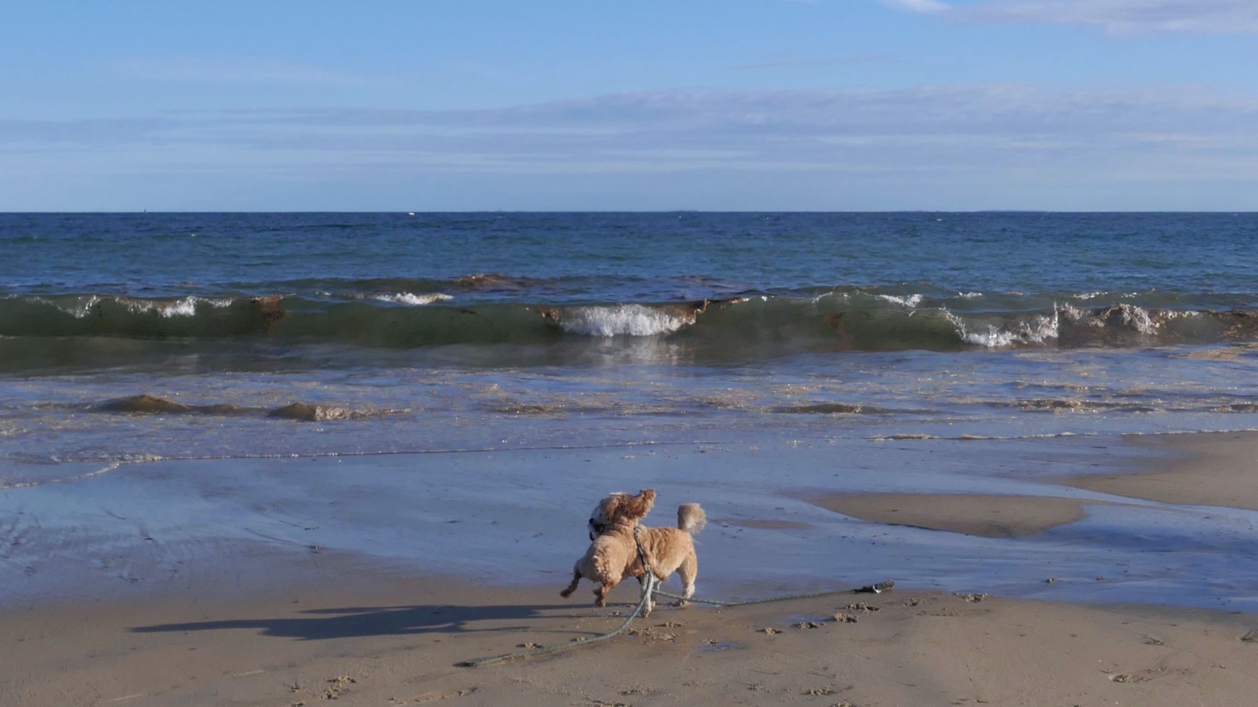 We arrived here right at high tide. Even though Hurricane Erin was still far away, it was already starting to causing higher than normal tides in Southern New England. We actually had to walk through water just to get to the beach. Even on the bay side where the entrance to the conservation area is, water had overtaken most of the sand. Not only that, the parking lot was flooding as well. Of course, that didn't stop Mandy & Lexi from playing on the beach! The tides are only supposed to get worse the next few days, but at least the dogs got to run around and play on this day.