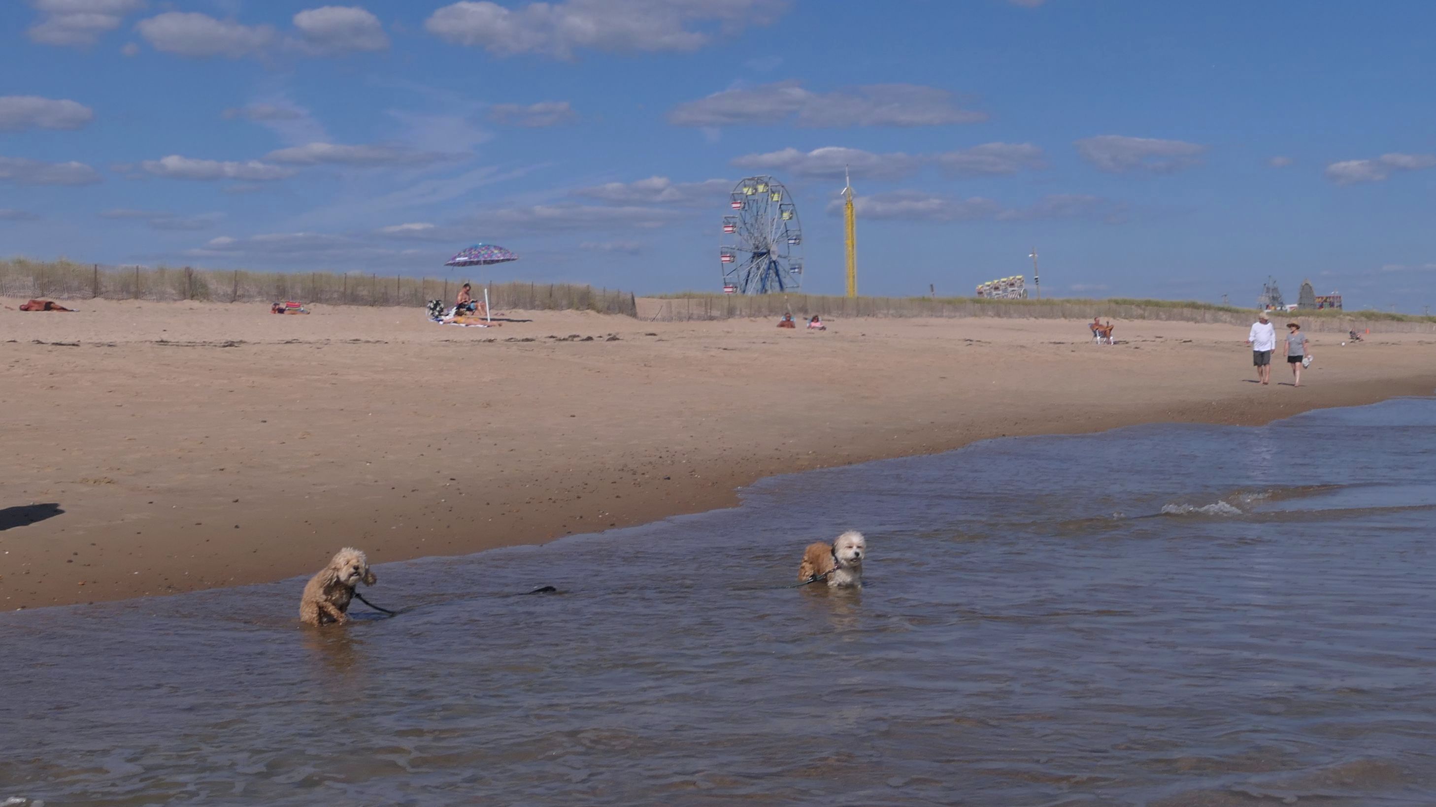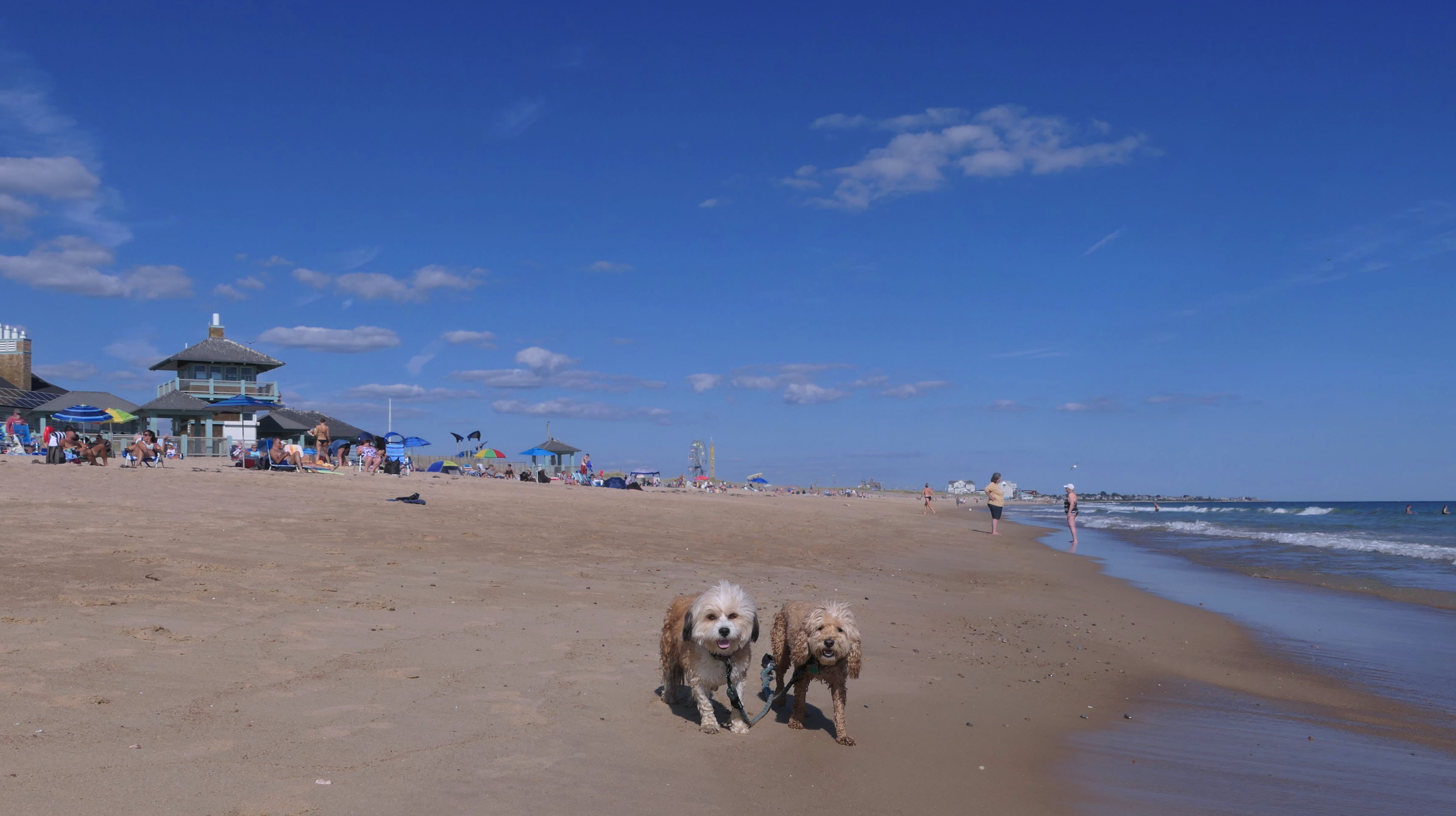 This was a wonderful late summer walk on the beach. Although dogs are technically allowed on the state beach until October, the town beaches on either side allow dogs after Labor Day. It's unclear where the borders are, so we basically just walked from Westerly Town Beach through the main tourist beach, and over to Misquamicut Fire District Beach, and back. The beach was moderately busy. It was a Thursday afternoon during the week, so even though it was a warm day, crowds weren't anything like what you'd see here during the summer peak. There were actually a good deal of people with their dogs here as well. We were here a day before the annual Fall Fest, so you can see the amusement park rides in the background of some of the photos. Lexi tried to get Mandy to play a couple times, but all Mandy wanted to do was relax in the water!