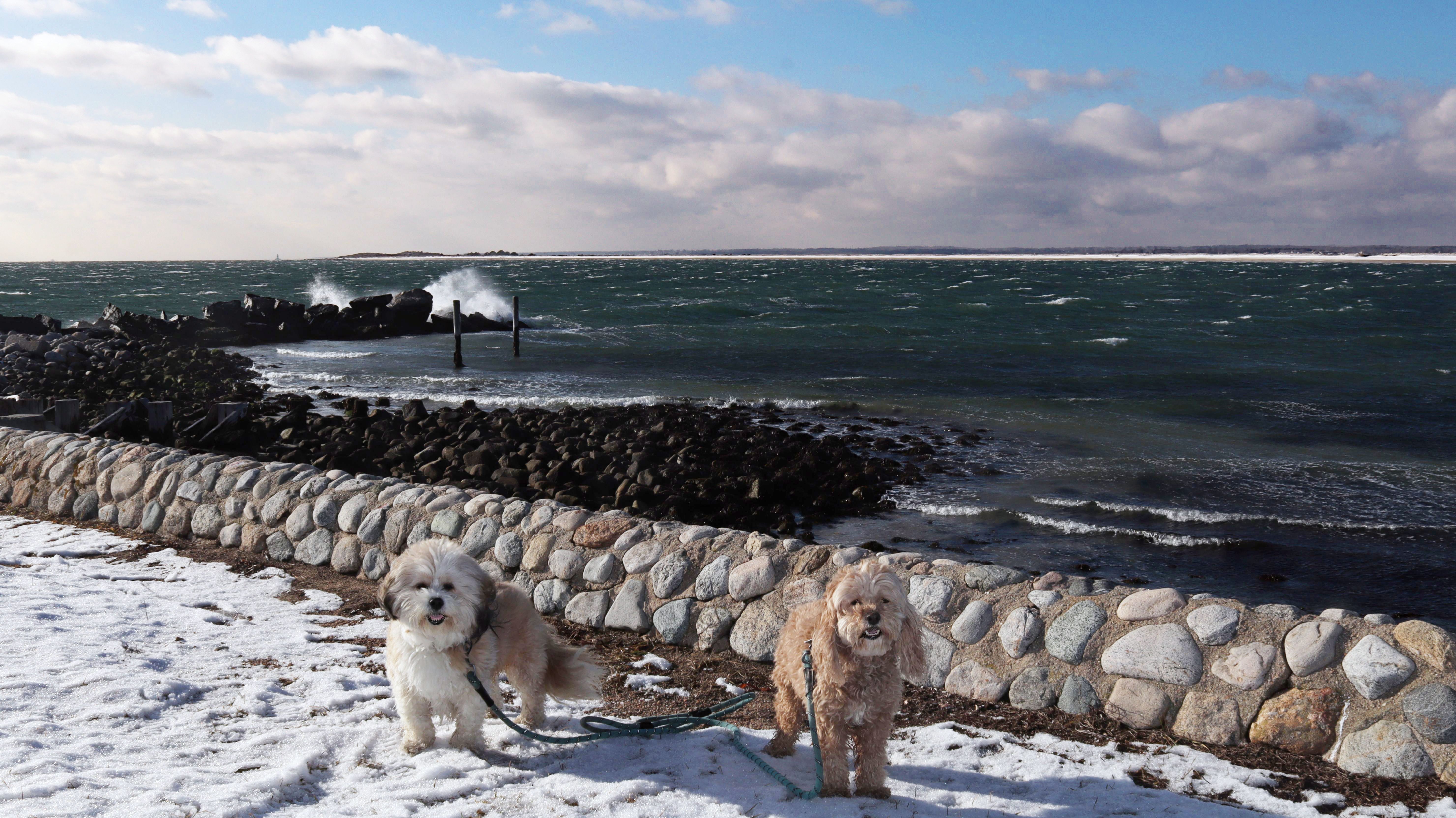 It had snowed for two days straight, but we were able to salvage the last day of the long weekend. There wasn't as much snow right on the shore as there was inland, so I thought this would be a good place to take the dogs for a walk. I pictured taking a photograph of them in front of a scenic, snowy lighthouse... it all seemed great in my mind. In reality, there wasn't much snow and the conditions were brutal! While there was very little wind inland, it was about as windy as I've ever experienced here! That made taking any photos a real challenge. We did get a few okay pictures, and while I got plenty of exercise shoveling snow over the weekend, it was good to get the dogs out. We took a short walk around Watch Hill after walking down the road to the lighthouse. That being said, it might have been better remaining inland.