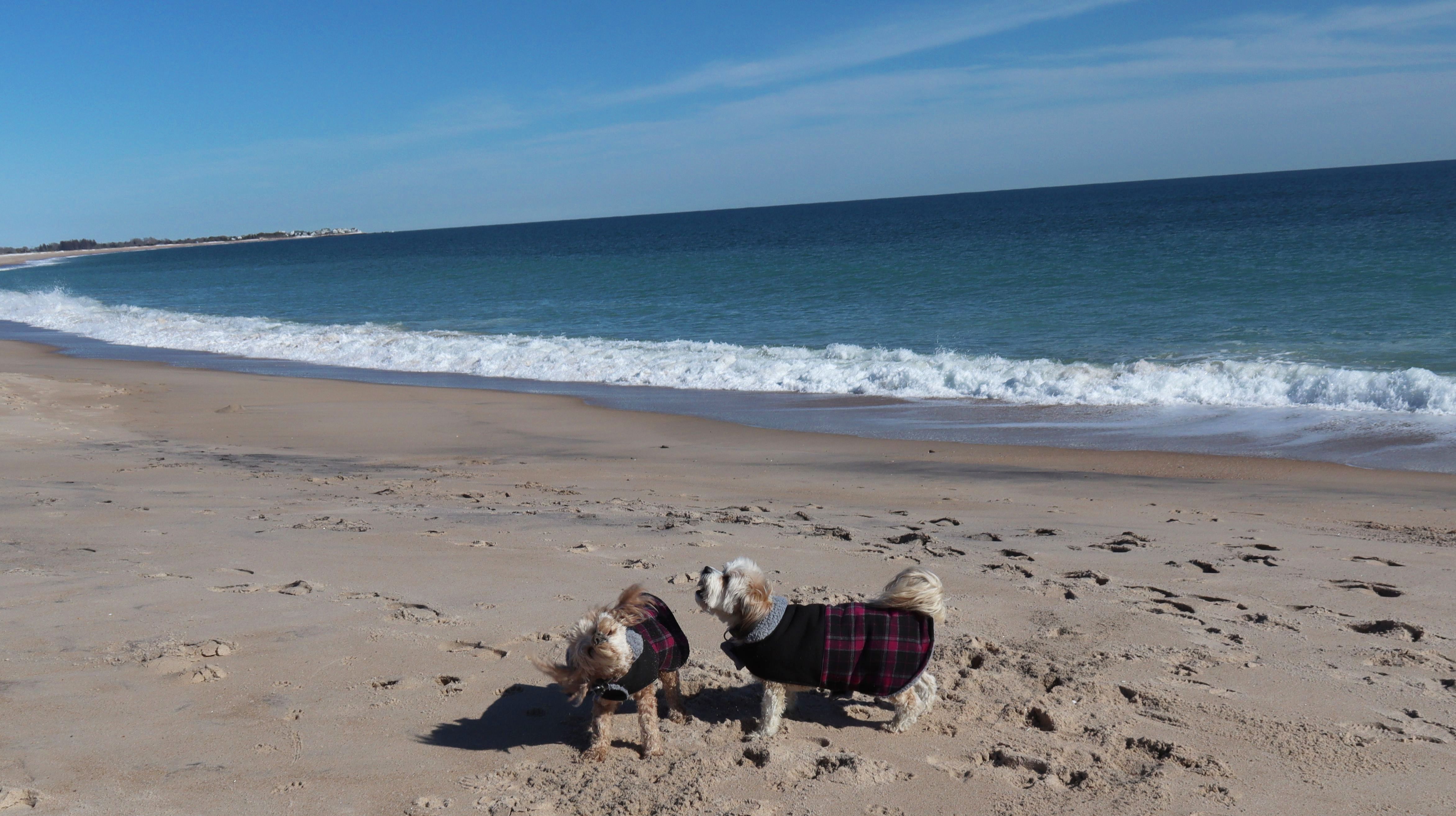 This was a cold and windy day at the beach. We walked the loop around the beach. We got two thirds of the way through the loop, and came to a point where we either had to pass through an inlet, or turn around and go back. Keep in mind, it was about 30 degrees and windy, so naturally we walked through the inlet. The dogs didn't seem to care. I was wearing sneakers, but fortunately had wool socks that kept my feet from freezing. The first picture below is one of my all time favorite pictures I've taken of the dogs.