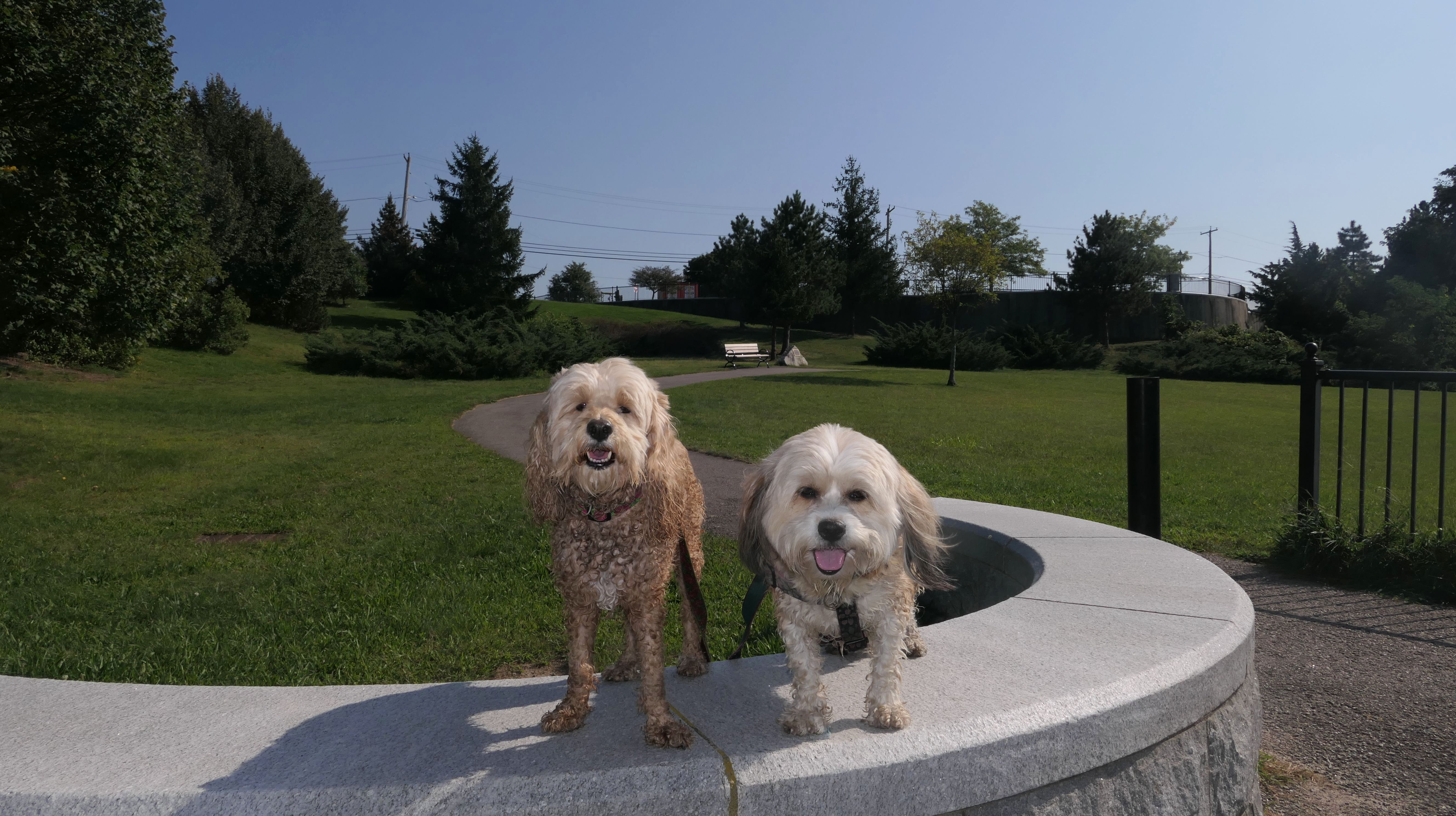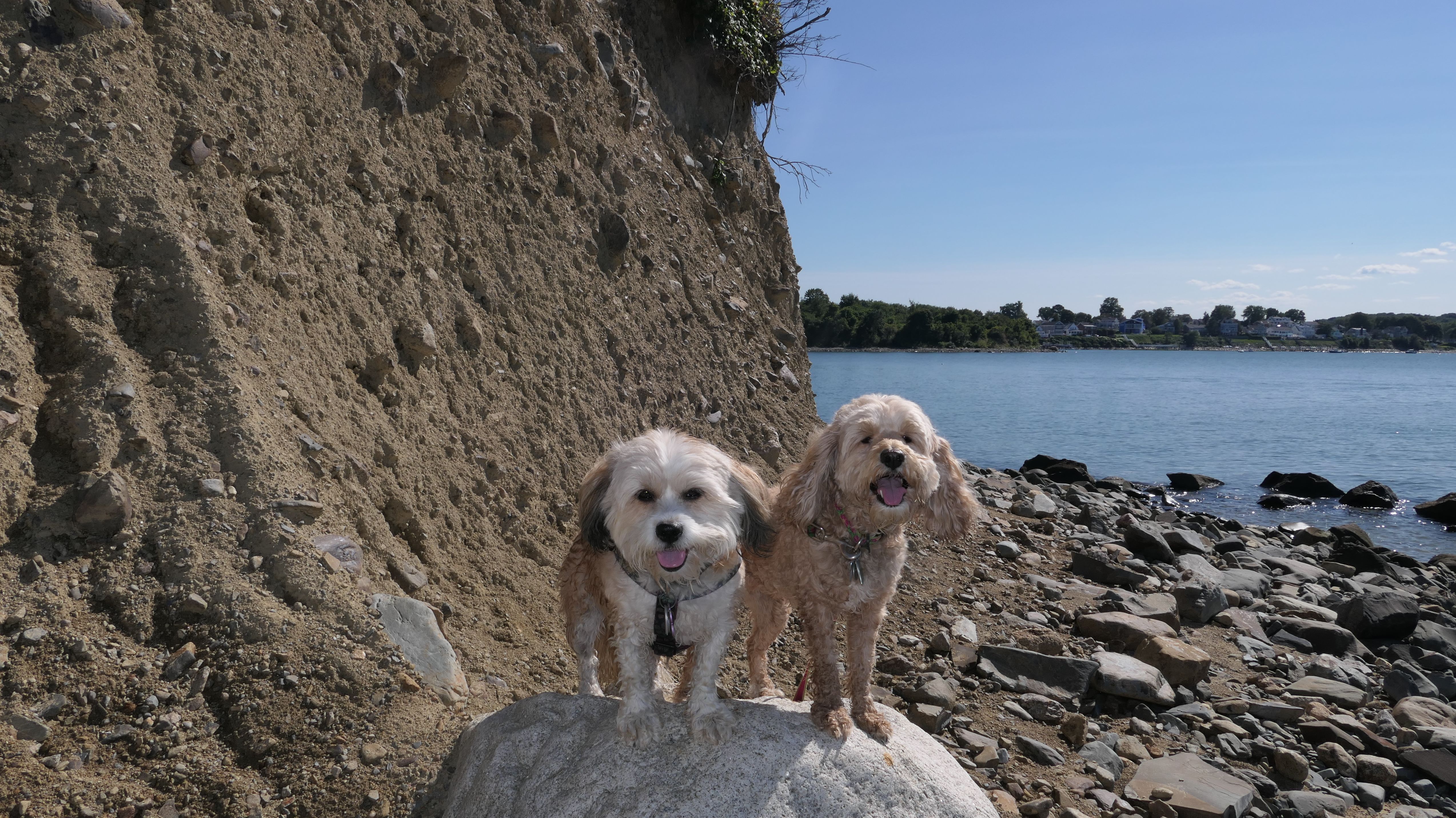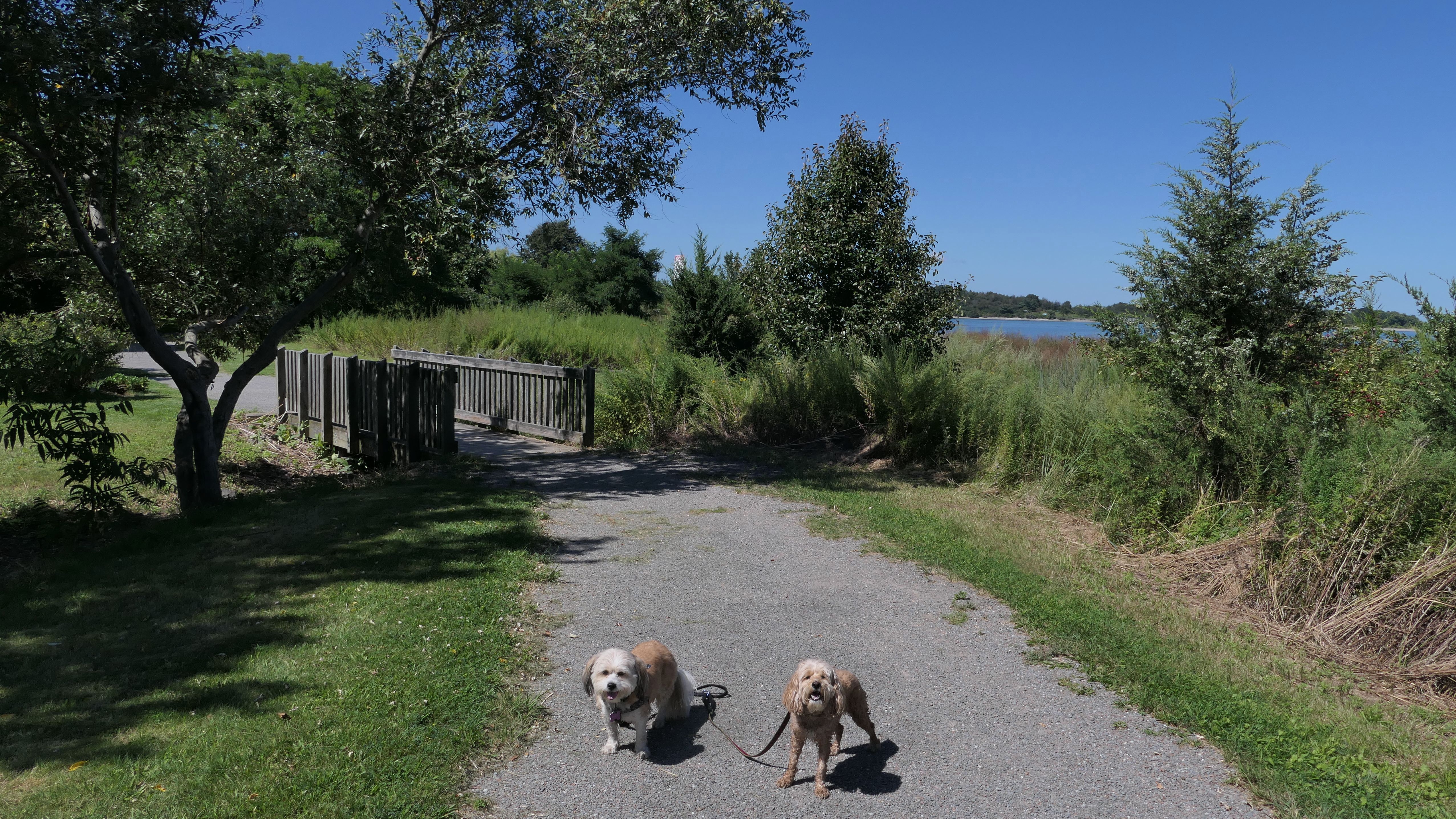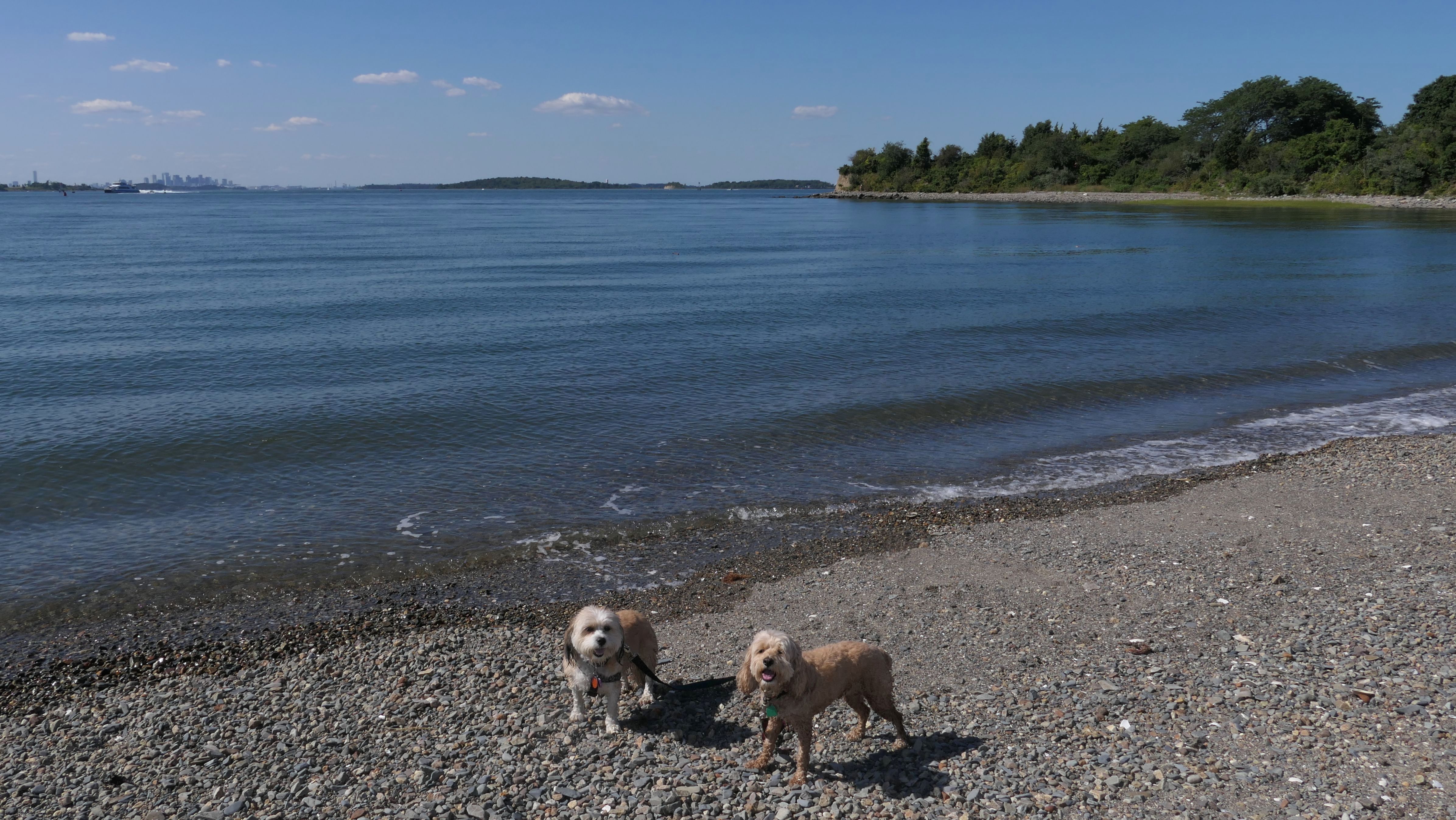 This is one of the best places we've visited in Massachusetts. The state park is on a peninsula that extends into Hingham Bay, and is located on a former Nike missle site. There's an easy stone dust loop trail that runs for about two miles, as well as a mowed meadow area, and rocky beaches along the perimiter of the peninsula. In addition to the trail, we explored the entire rocky beach. One side of the peninsula offers views of the Boston skyline. There are also views of many boats, yachts, and ships that use the bay. There are plenty places for the dogs to cool off in the water. There's a picnic area, as well as other picnic tables throughout the park. It's a great place to bring dogs for a walk. The weather was perfect, so this was a really fun trip!