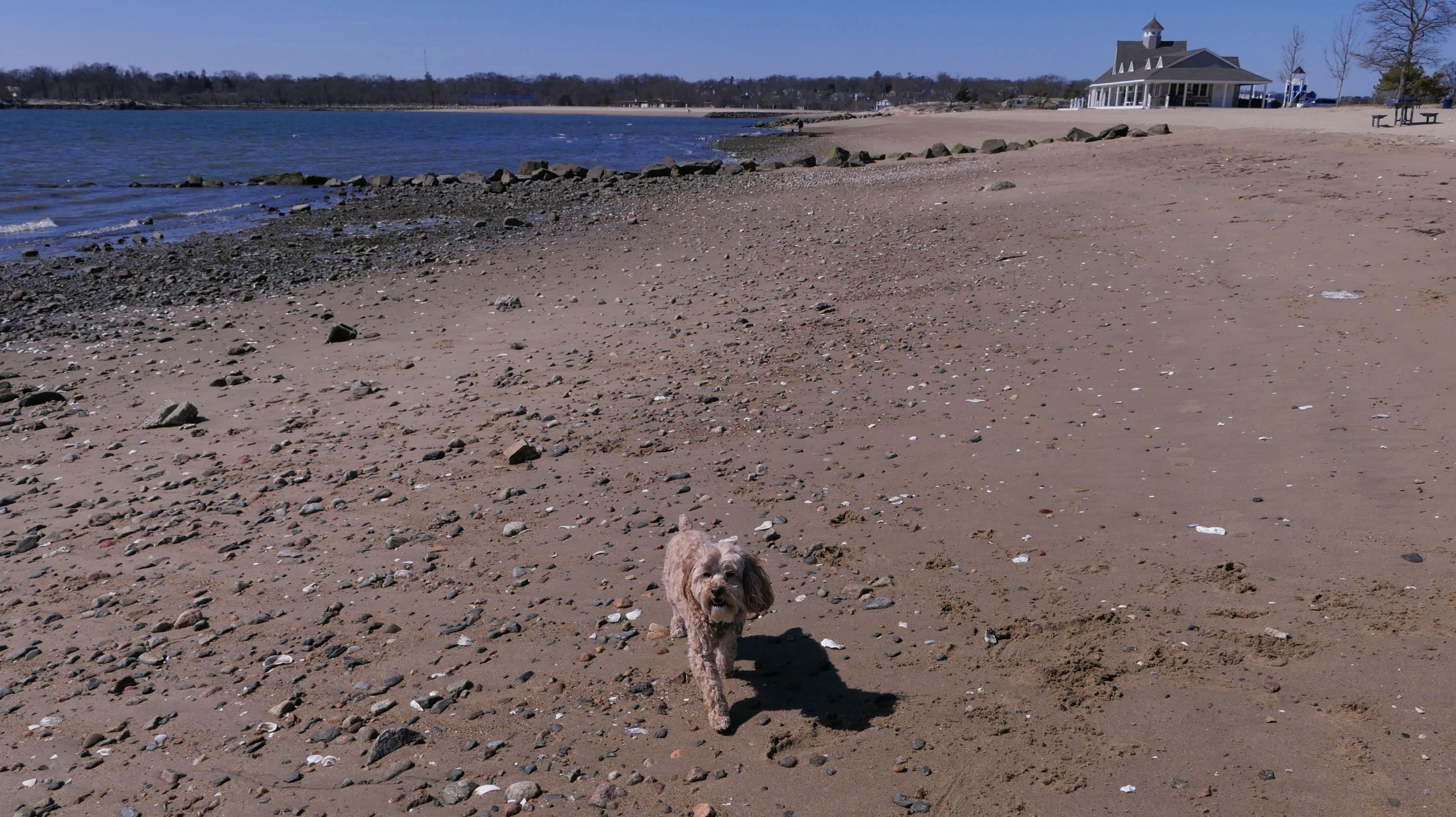 This beach features an off-leash dog area that's available in the winter months, from November 1st to March 31st. But beware, the dogs aren't allowed anywhere else on the beach except this small rocky area at the far end. The town of Darien pays an Animal Control Officer to sit in his truck and watch the beach to make sure that dog's don't cross the invisible line into the nice part of the beach (Tax payer money at work!). We didn't realize this as first, as I thought the dogs were only allowed off-leash in that small rocky area, but I could walk them on the rest of the beach. The sign does say "Winter Dog Walking" after all. The off-leash section isn't big enough to actually take the dogs for a walk. He did not give me a ticket even though he has been instructed to give tickets out without warnings for the evil dog owners who violate this rule. We stayed in our designated area for about 15 minutes or so. There was only one other dog here, and I had to warn the dog's owner when she crossed into the forbidden zone. Thankfully, she was able to get back in time before the officer could get to her! On our way out, I passed the officer and mentioned that the signs weren't very clear. He then proceeded to check that my dogs had their license tags. I guess he was just looking for a reason to give me a ticket at that point. Thankfully, both dogs have their licenses on their collars! It's nice that the town has an off-leash dog area on the beach, but there are better winter time off-leash beaches in the nearby towns of Fairfield, Westport and Norwalk. We actually headed to the Norwalk beach after this. There's no real reason to visit this one in Darien, as the others are all much nicer anyway.