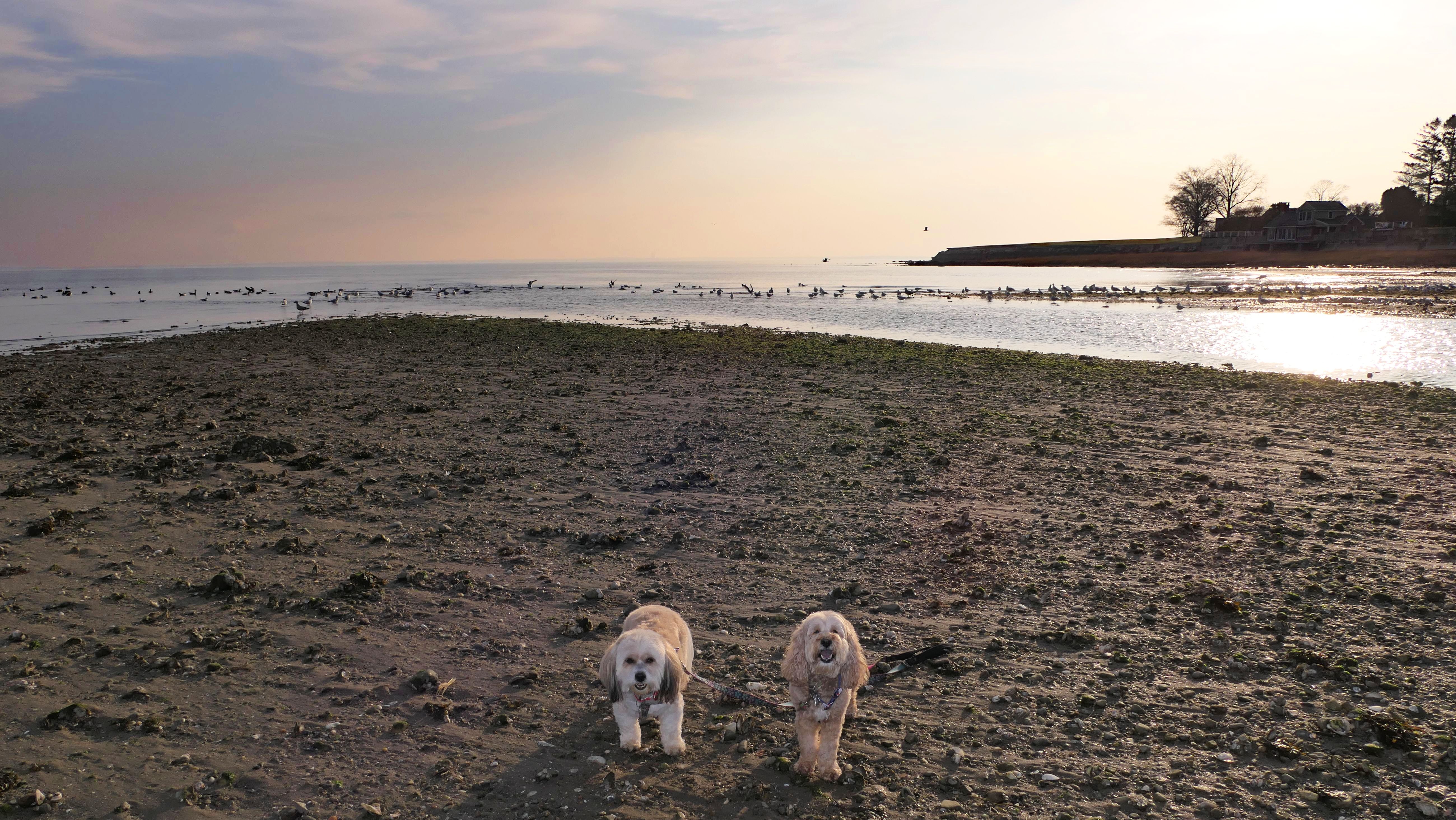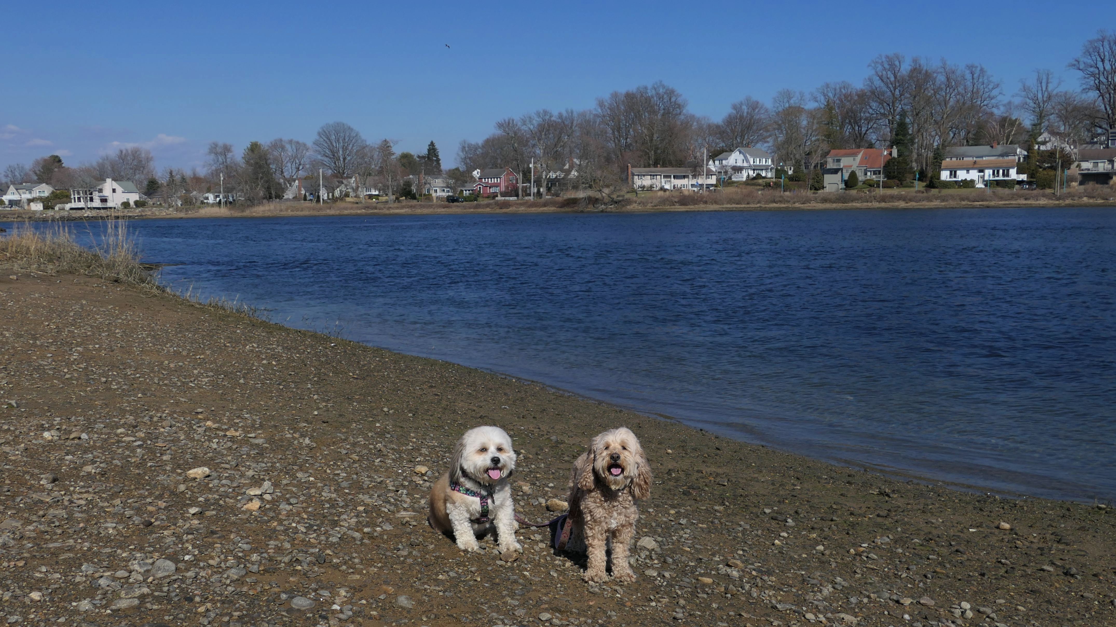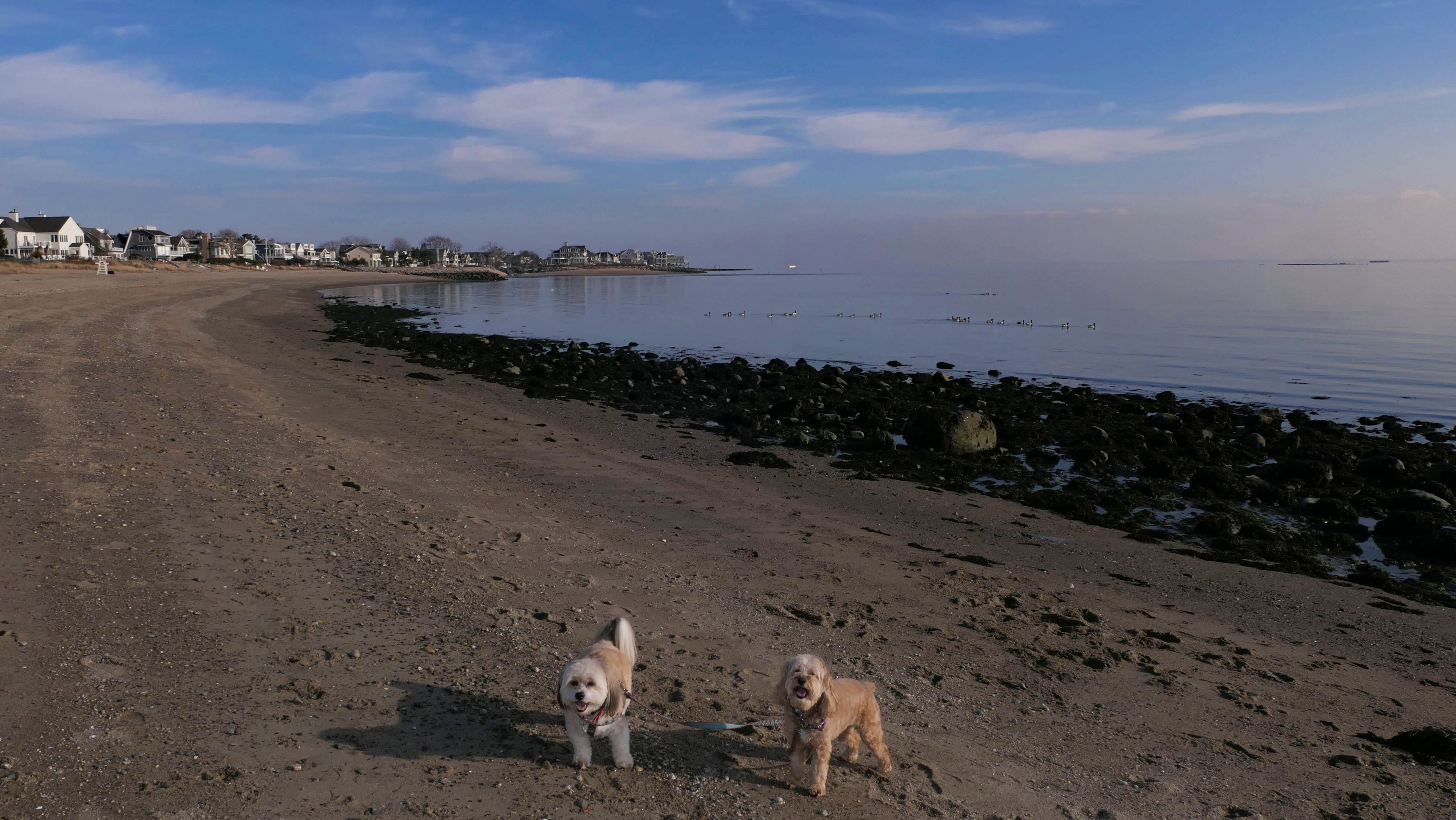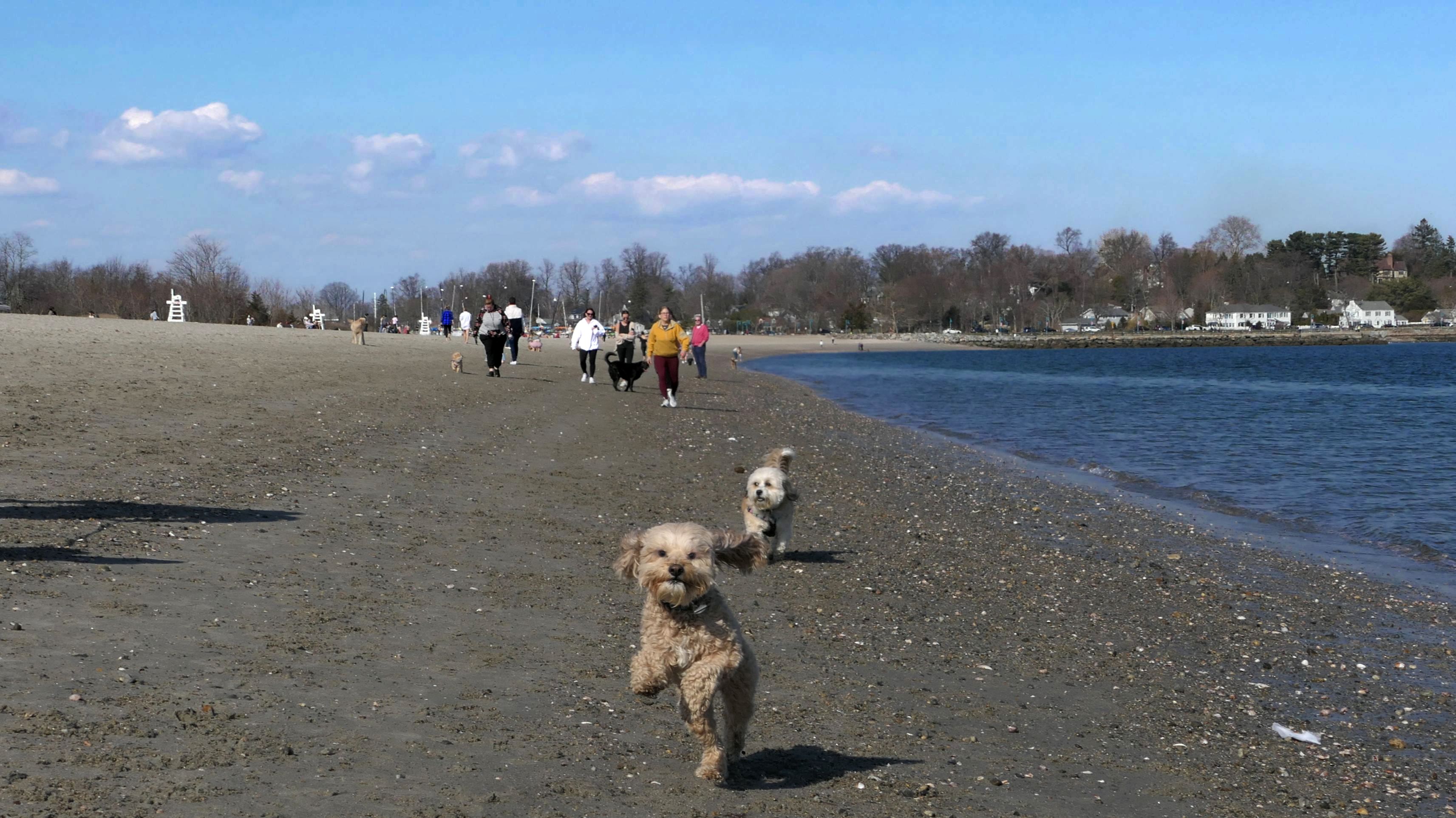 Our fourth visit here was on a warm Friday in mid March. We arrived after hiking at Pine Creek and Ash Creek. Since we had already done our walks, I brought the pups here just to play. Unfortunately they were too tired and didn't play all that much, so we explored the area near the rocks on the part of the beach near the Bridgeport border. They did invade a picnic. Fortunately, the women loved the dogs and didn't mind.