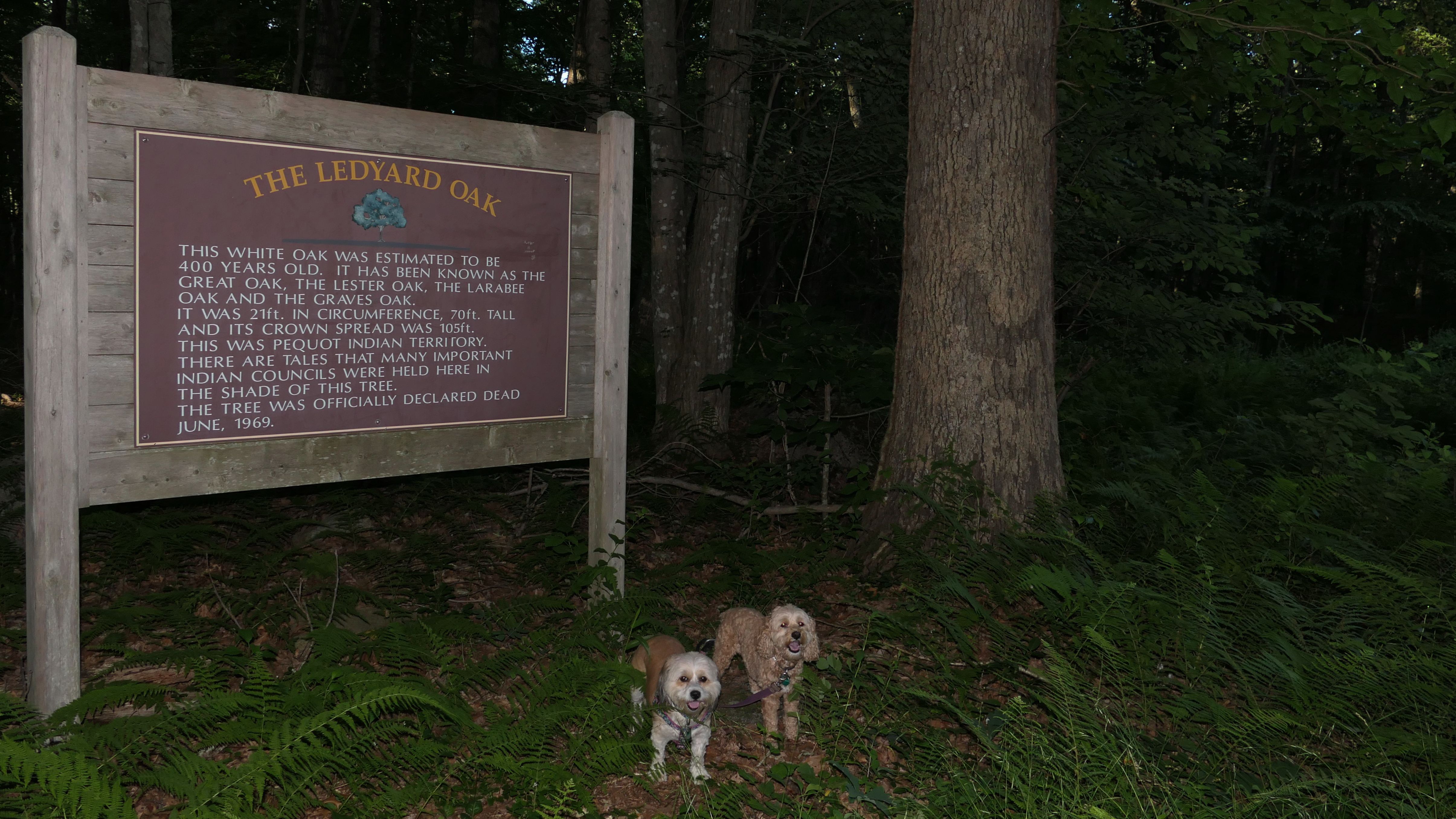 The trails here are in the woods located behind the Nathan Lester House. The house, located within the historic Gales Ferry section of Ledyard and built in the 18th century, is now home to a museum. The best photo opportunities here are at the grounds around the house. There is a large grassy area with picnic tables, and a garden area. The trails are basic woodsy trails. There is a large sign commemorating the location where "The Ledyard Oak" once stood. It was a very large, 70 foot tree, but it was declared dead in 1969 and is no longer there. These are easy hiking trails. The perimeter loop is about 1.7 miles, but we extended the hike to 3 miles by checking out some of the connecting trails, one of which led to the power line cutoff.