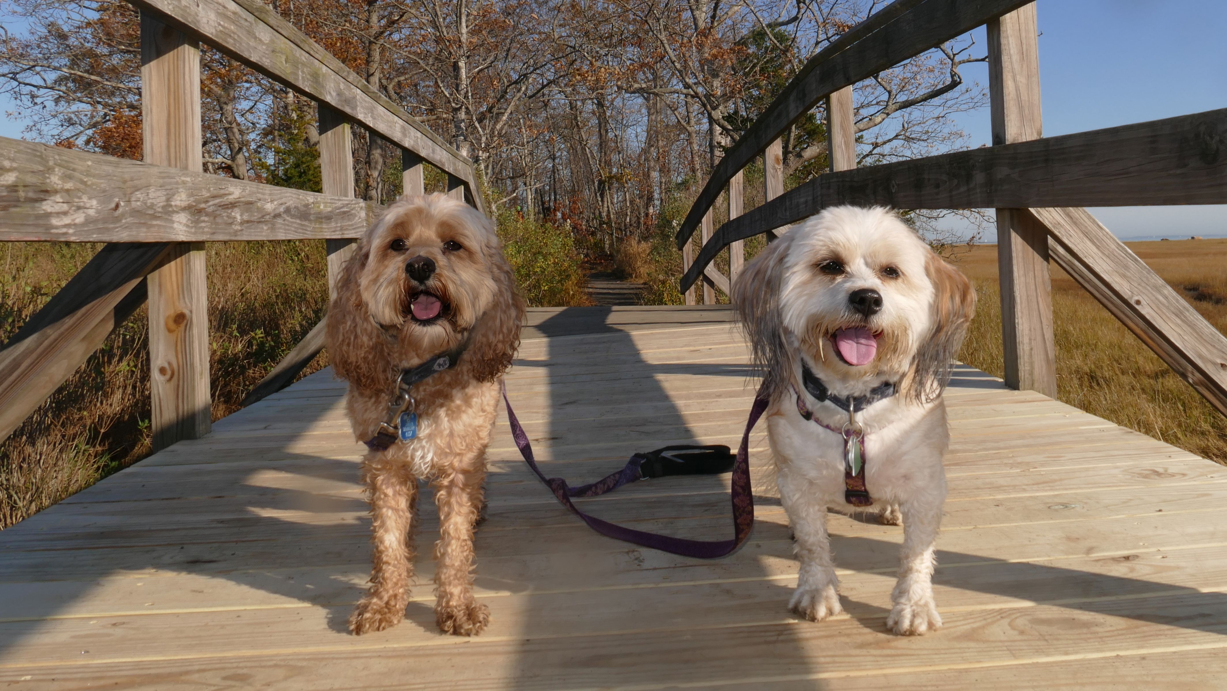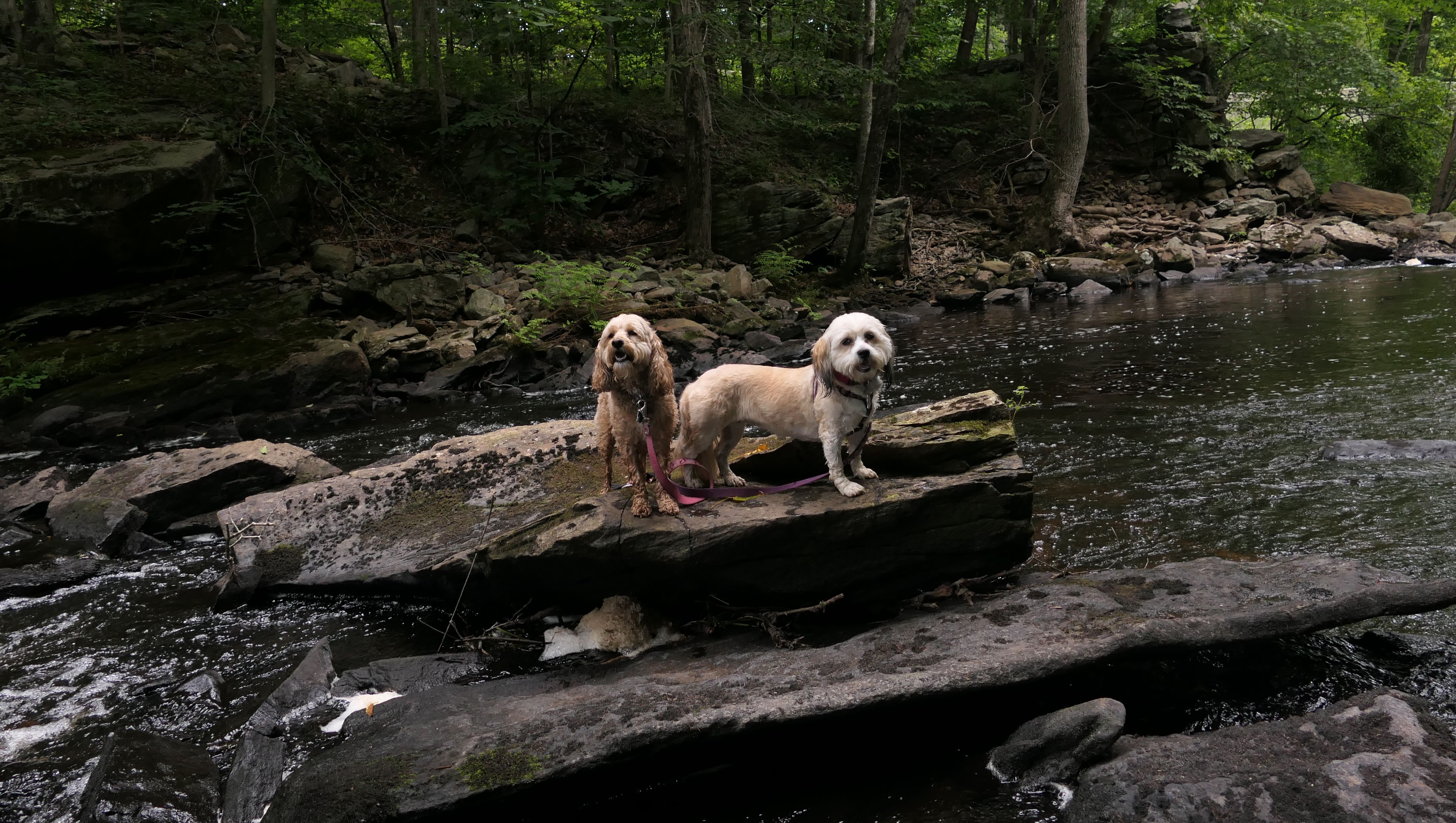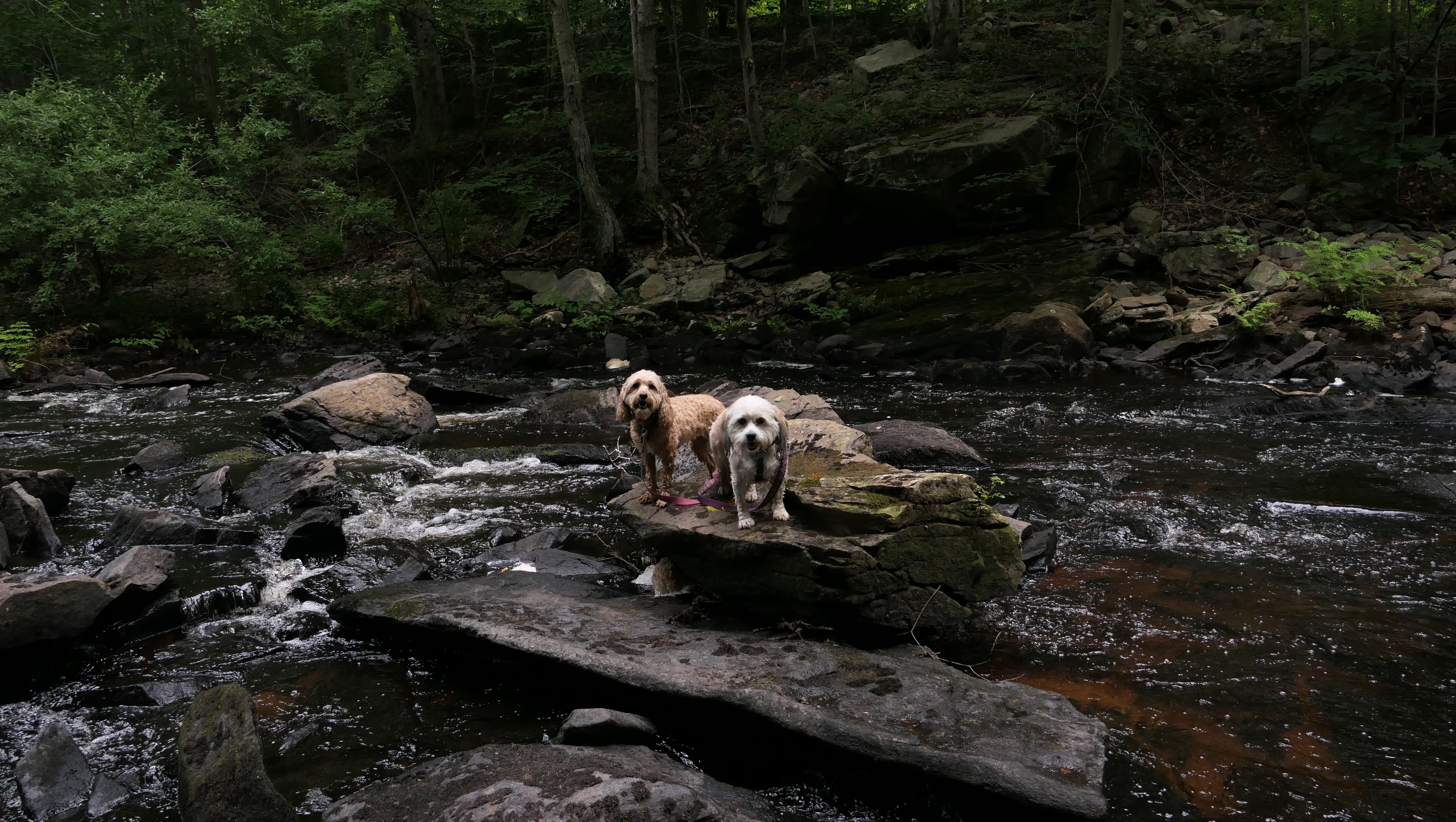 The Paper Mill Trail resides on Madison Land Trust property that once was the site of an old paper mill (hence the name). The ruins of the paper mill are at the beginning of the trail. There are remnants of a stone dam and a concrete dam that "breached." The dams were on the Hammonasset River, which also serves as the border between Madison and Killingworth. It's possible the dogs are in Killingsworth in some of the pictures below, at least the ones where they are in the middle of the river. The trail follows the river for about a mile, and then veers off from the river and loops around very near to some backyards. This part of the trail is rather ordinary.