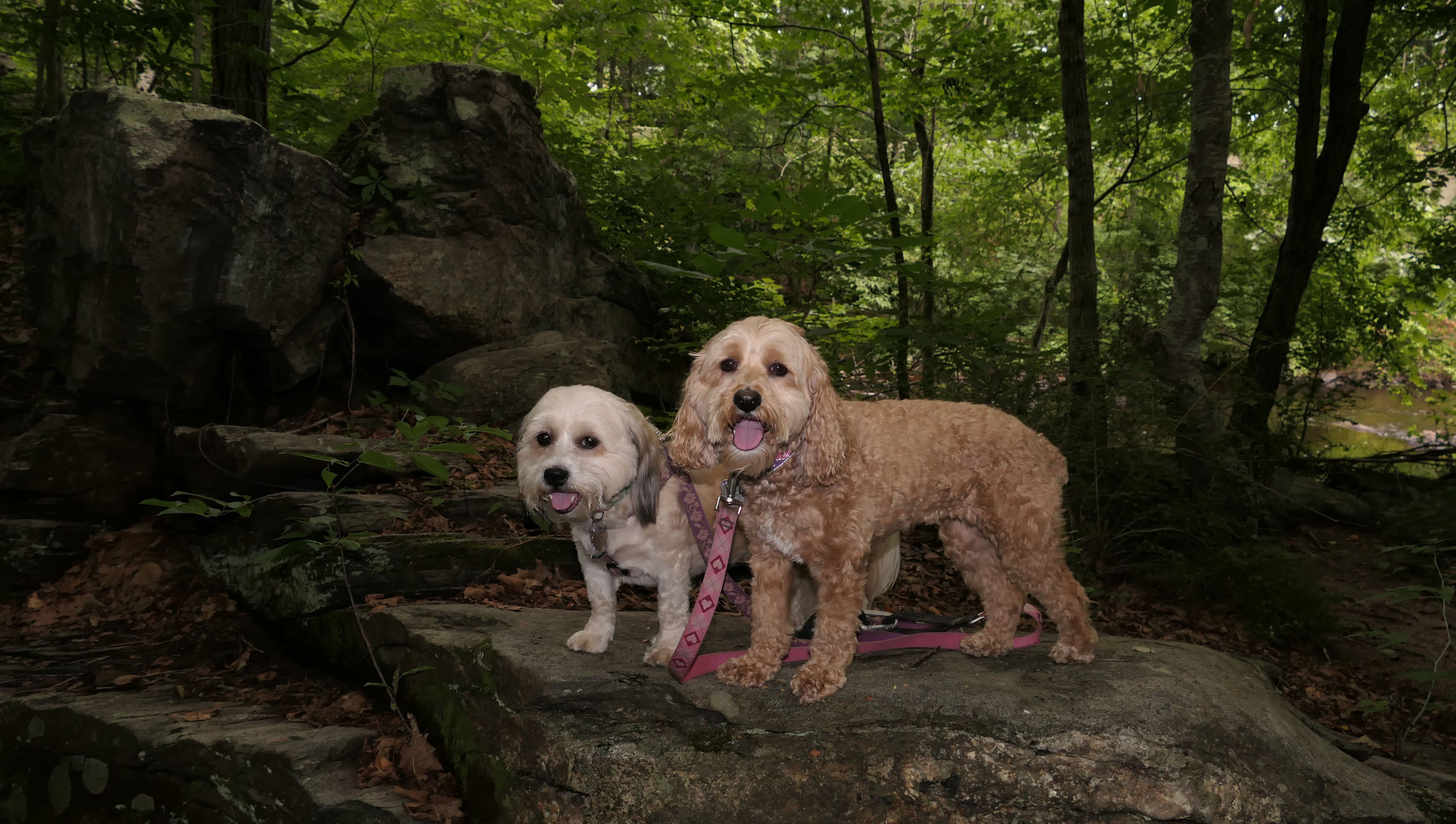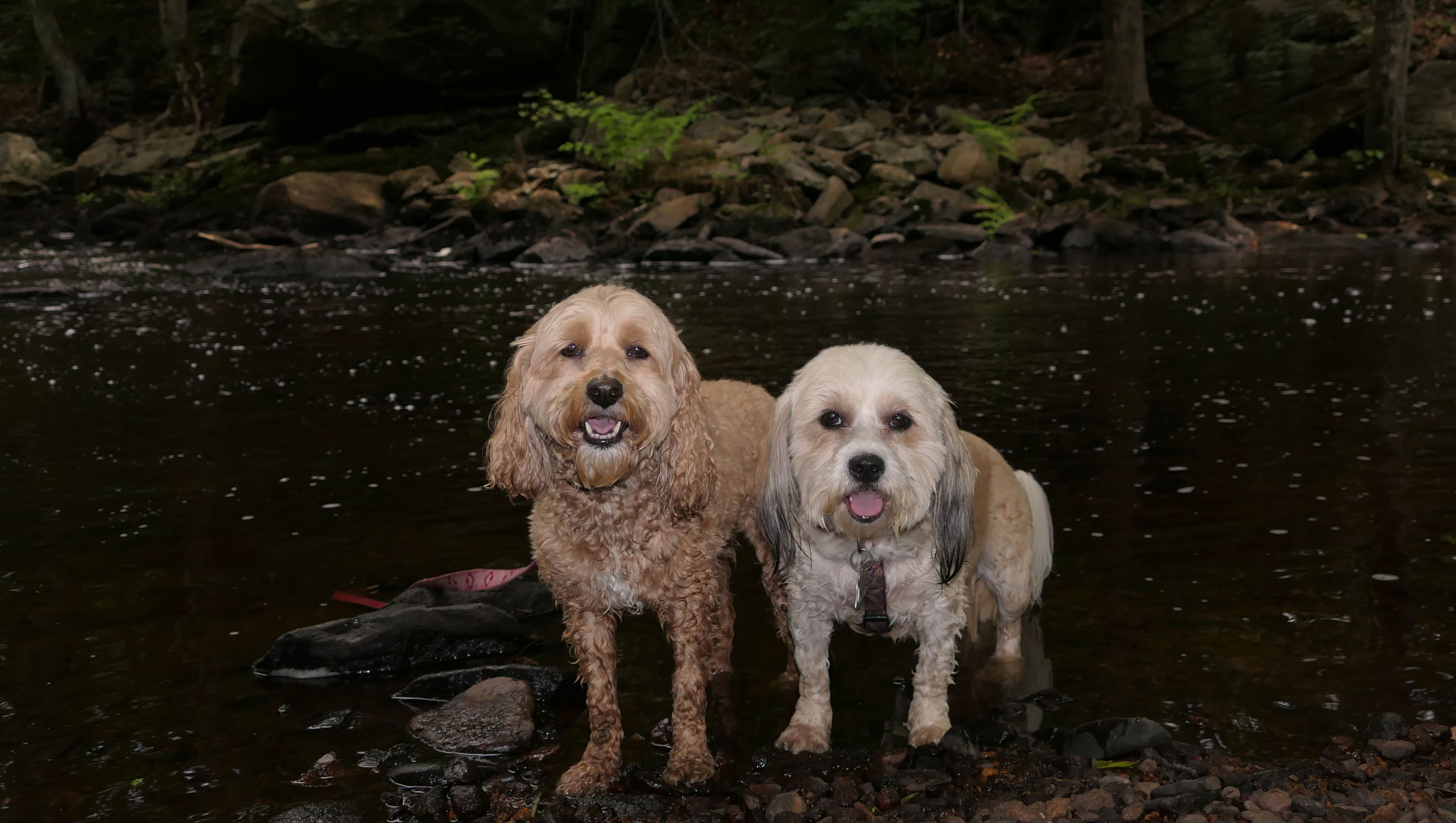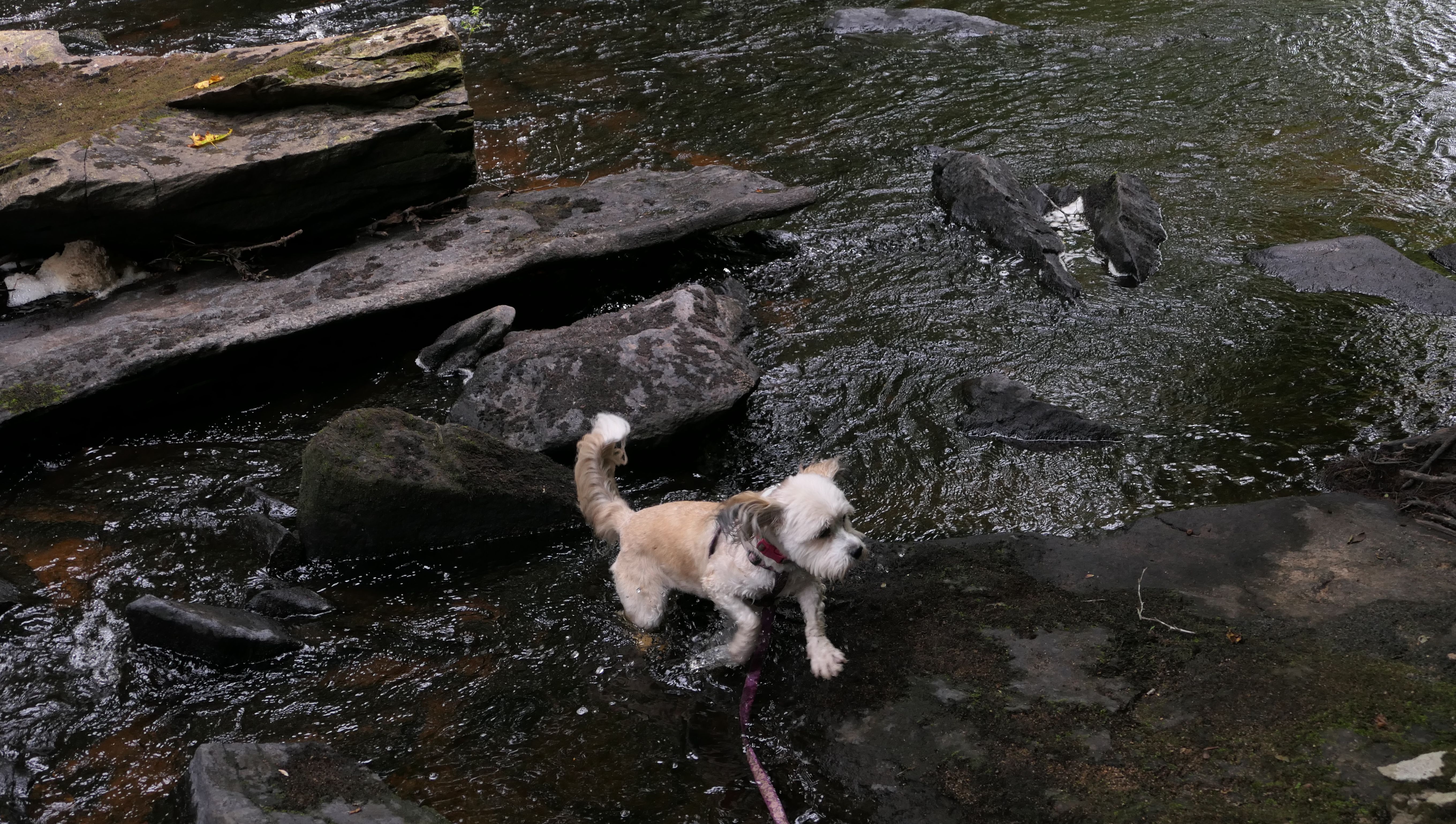 The Paper Mill Trail resides on Madison Land Trust property that once was the site of an old paper mill (hence the name). The ruins of the paper mill are at the beginning of the trail. There are remnants of a stone dam and a concrete dam that "breached." The dams were on the Hammonasset River, which also serves as the border between Madison and Killingworth. It's possible the dogs are in Killingsworth in some of the pictures below, at least the ones where they are in the middle of the river. The trail follows the river for about a mile, and then veers off from the river and loops around very near to some backyards. This part of the trail is rather ordinary.