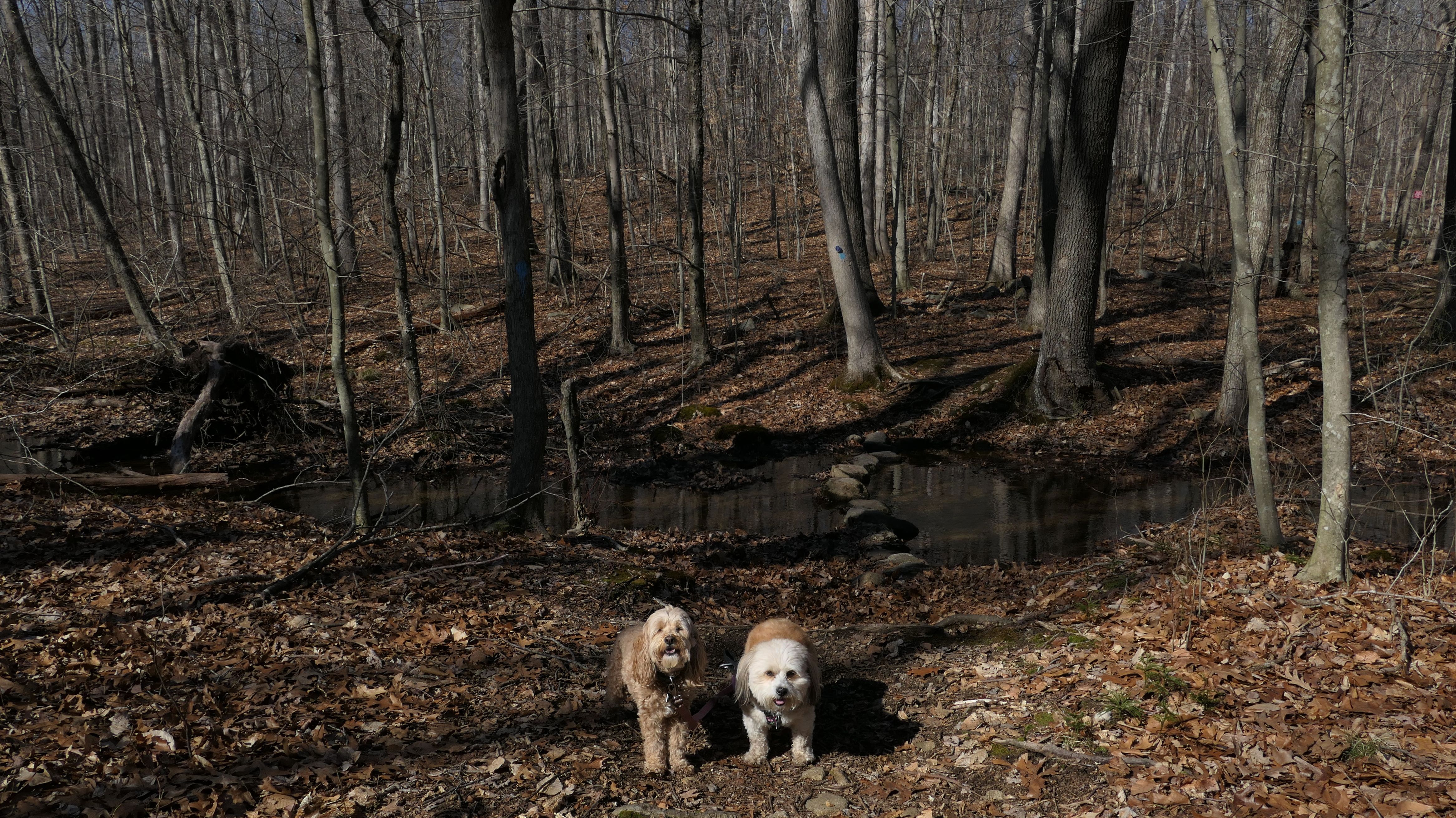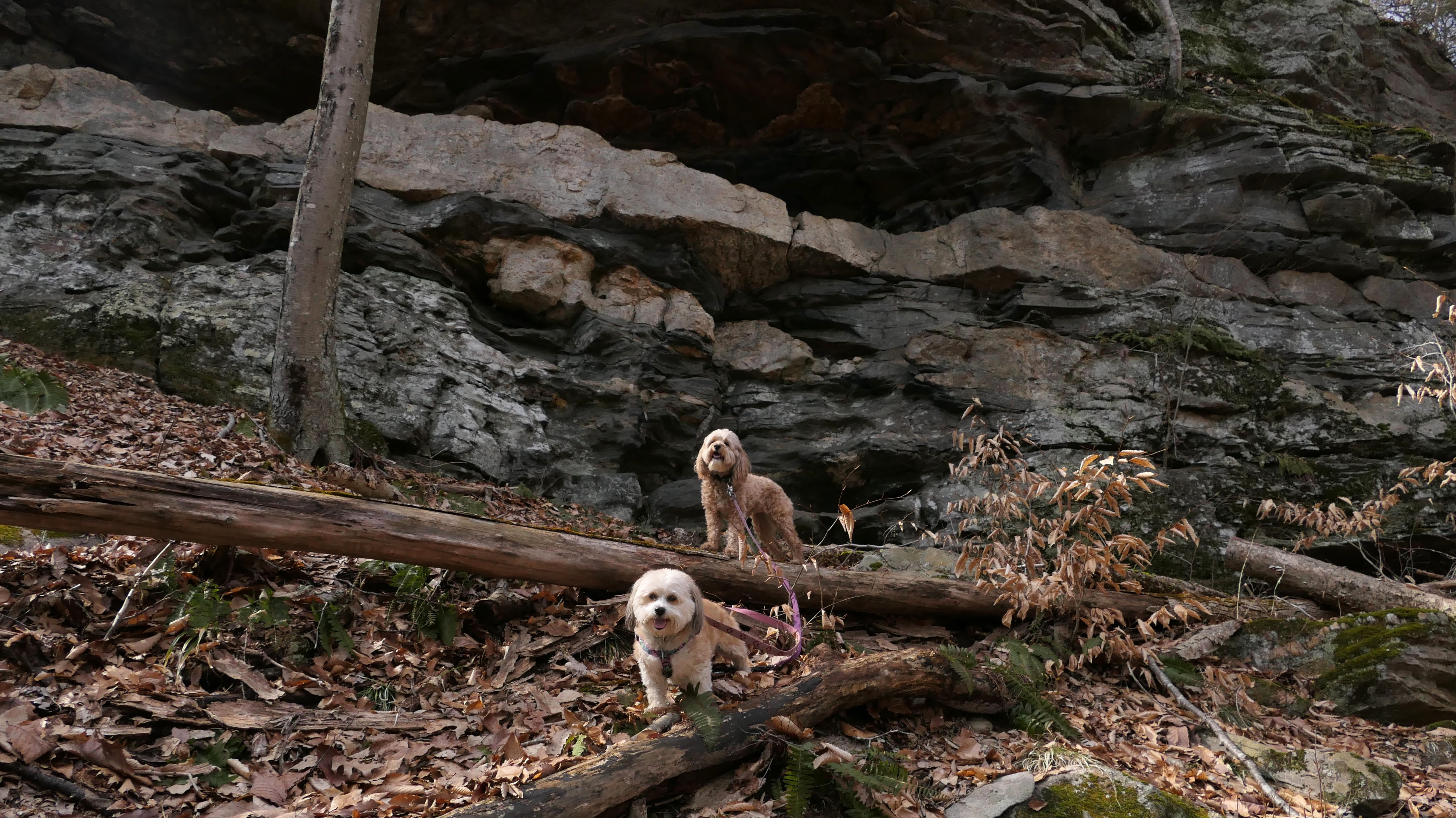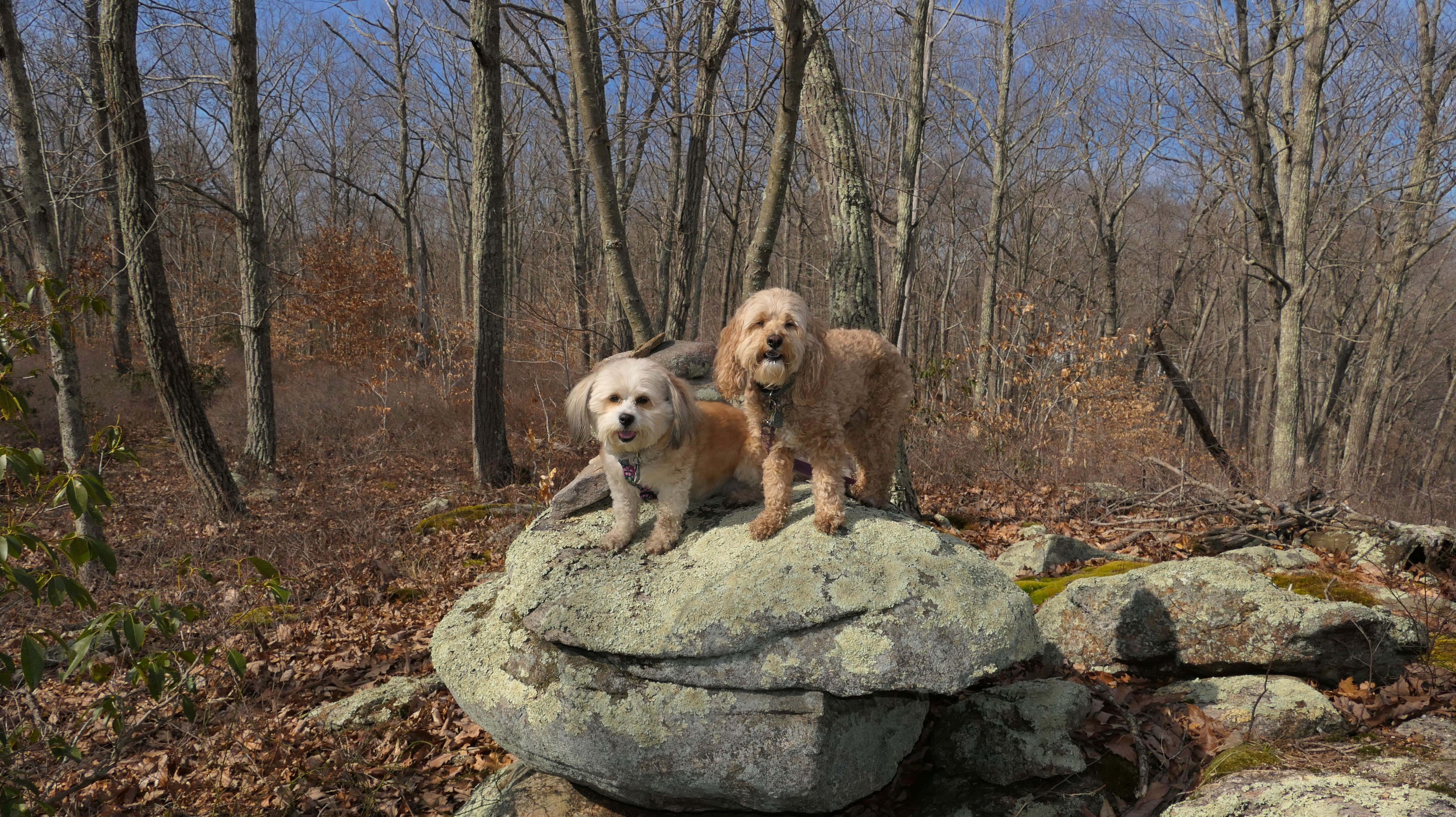 This is the first of two Madison Land Conservation Trust Trails we hiked on this day. Both were similar, and if my camera wasn't automatically geotagging the photos, I might have trouble figuring out which place each photo was from. We hiked a loop that was about a mile and a half long. The highlight of this one was the "Indian Rock Shelters" of course. Those are pretty much large rock formations, with some small caves. The trail itself is not very steep, but it is rocky. It was suprisingly not too muddy, but there were stream crossings with only rocks availble to cross. Of course the dogs just walked through the streams instead of balancing on the rocks.