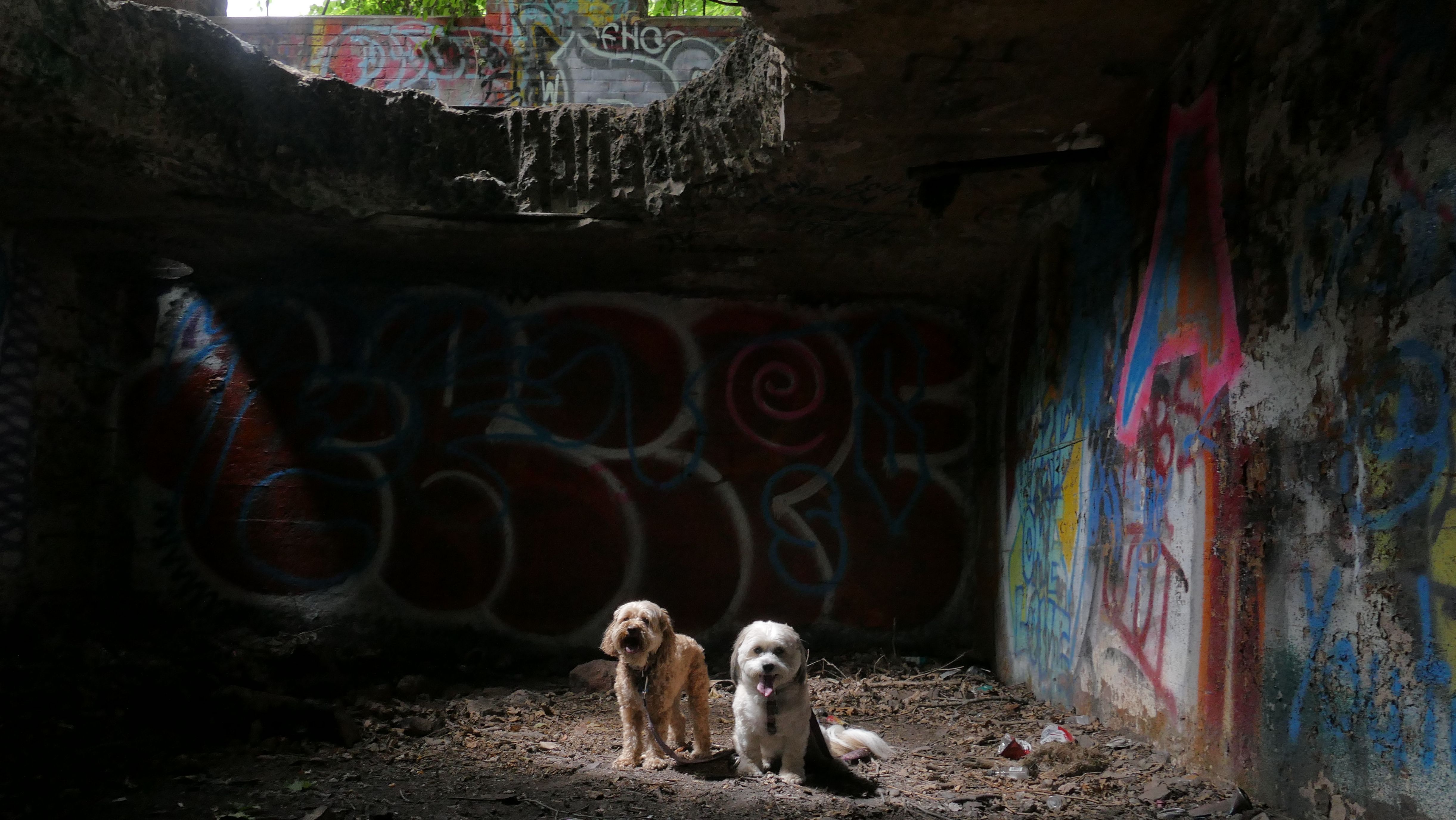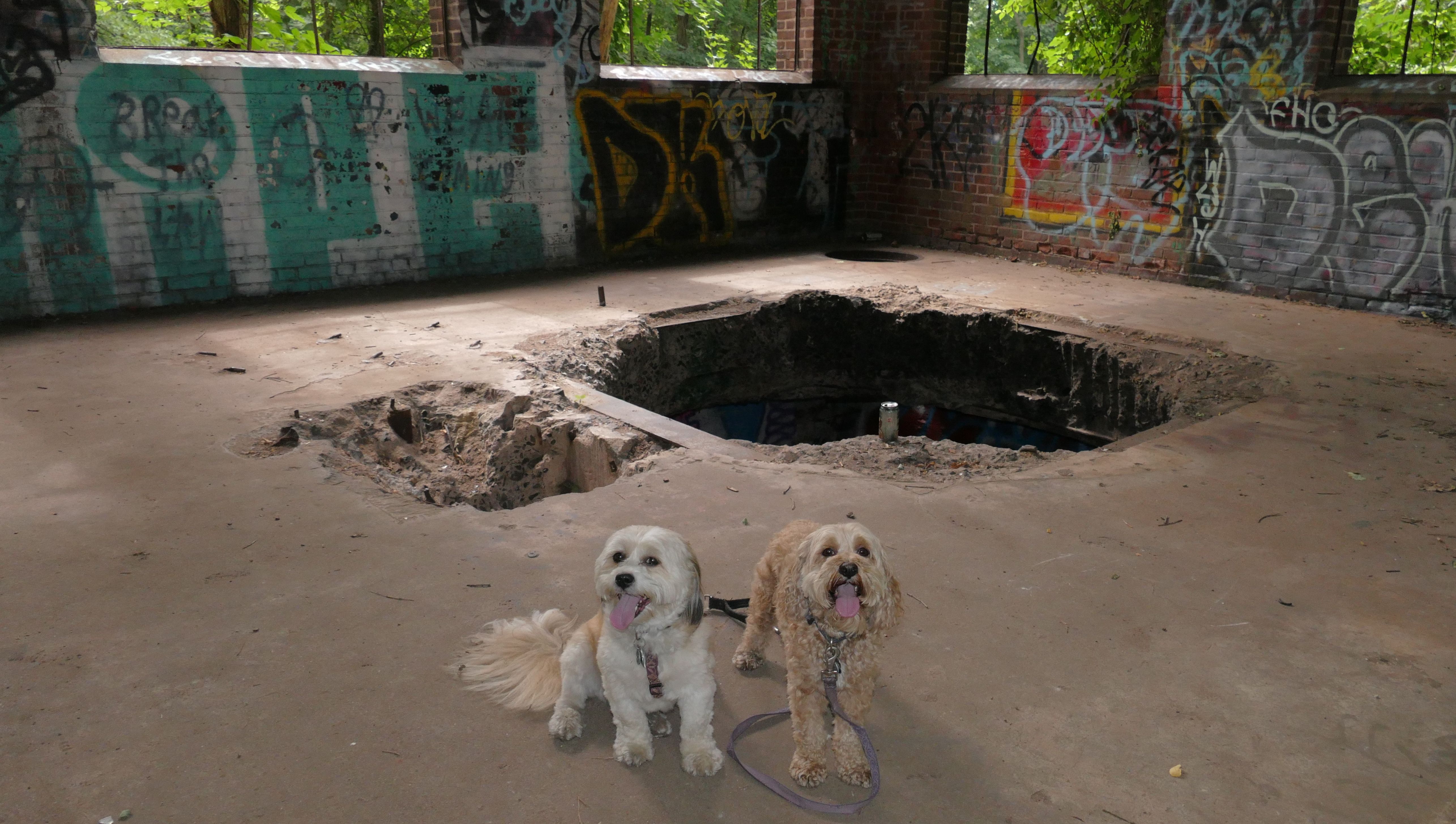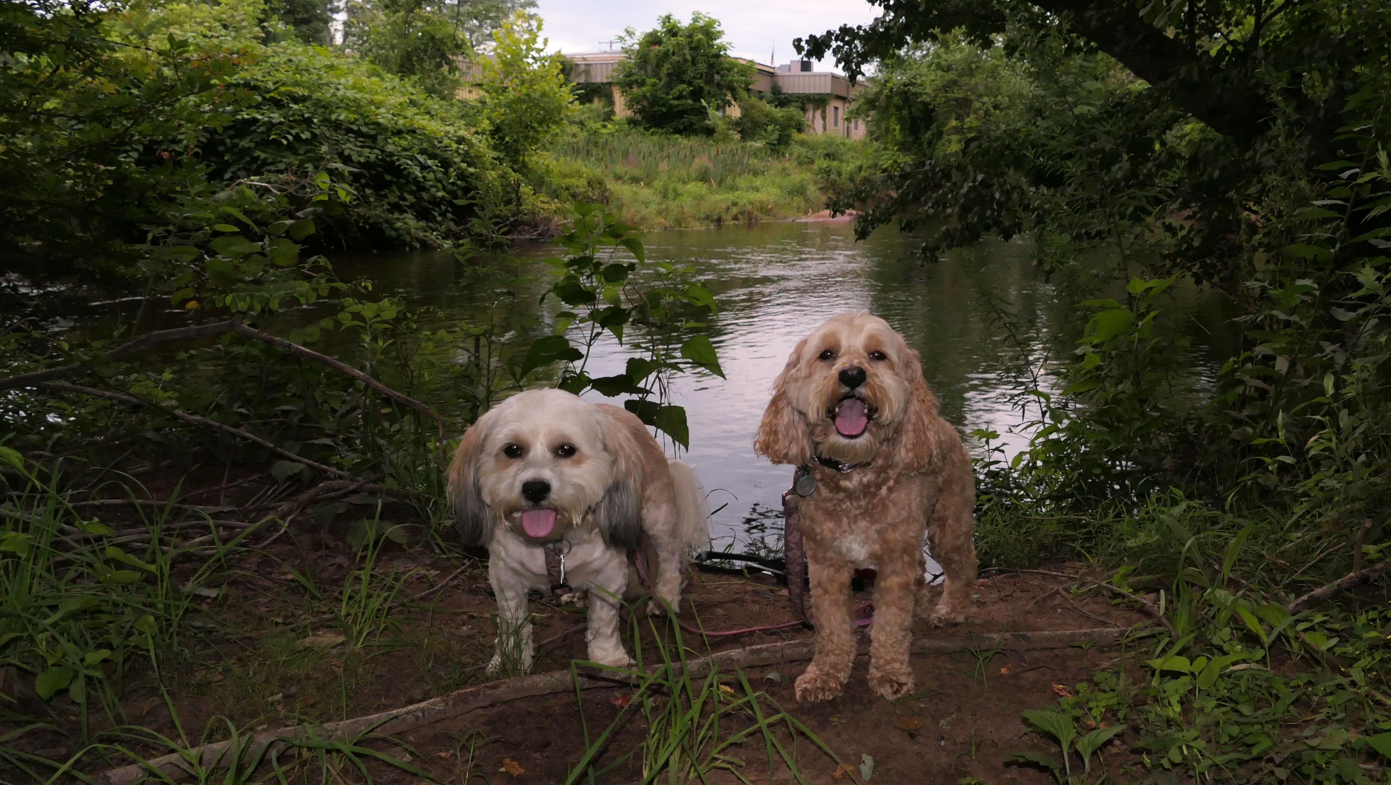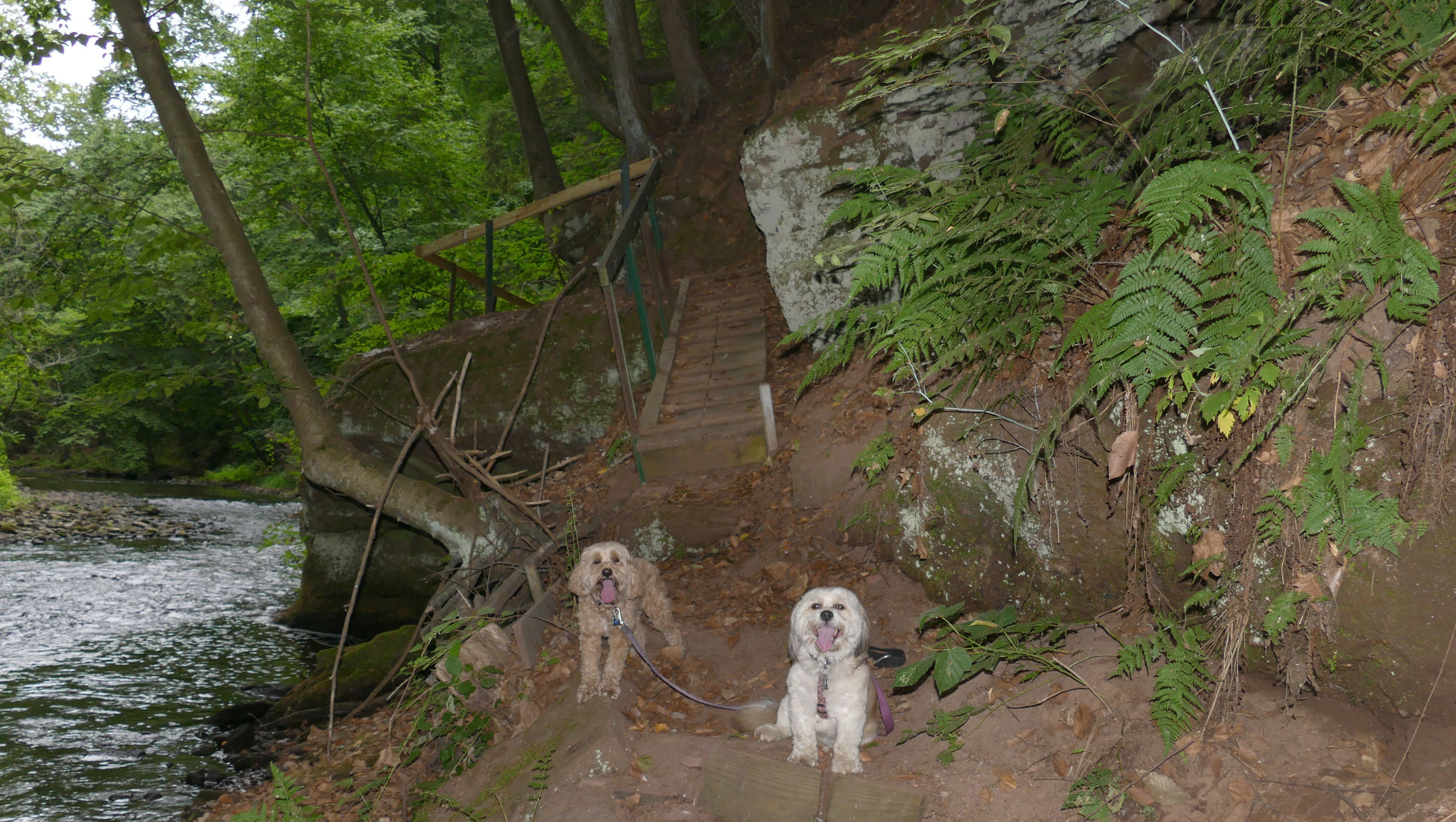 The Adam's Mill Restaurant was a staple in the town of Manchester for years. The restaruant has folded, and it is now Elicit Brewery. The trail starts behind the restaurant. You can walk a loop here, but you will come out down the road a bit next to the car dealership and have to walk the last segment on the sidewalk. The river crossing is actually over an old railroad bridge, and is technically closed to pedestrians. There really is no legitimate way to walk the loop unless you are a rule breaker! The bridge is a steel grate bridge. Mandy absolutely hates those, so we didn't actually cross the first time we visited. The second time we visited, I carried her over the bridge! Once on the other side of the bridge, there didn't seem to be an easy way back down the hill to the trail. We had to climb down a real steep hill. That was a real adventure with the dogs. Somehow we managed to get down in one piece! There's a side trail behind the restaurant, along a levee that leads to ruins of an old mill that were interesting to explore. Like the New State Road Trail, there is also a section on the side of a cliff that is a little tough to navigate.