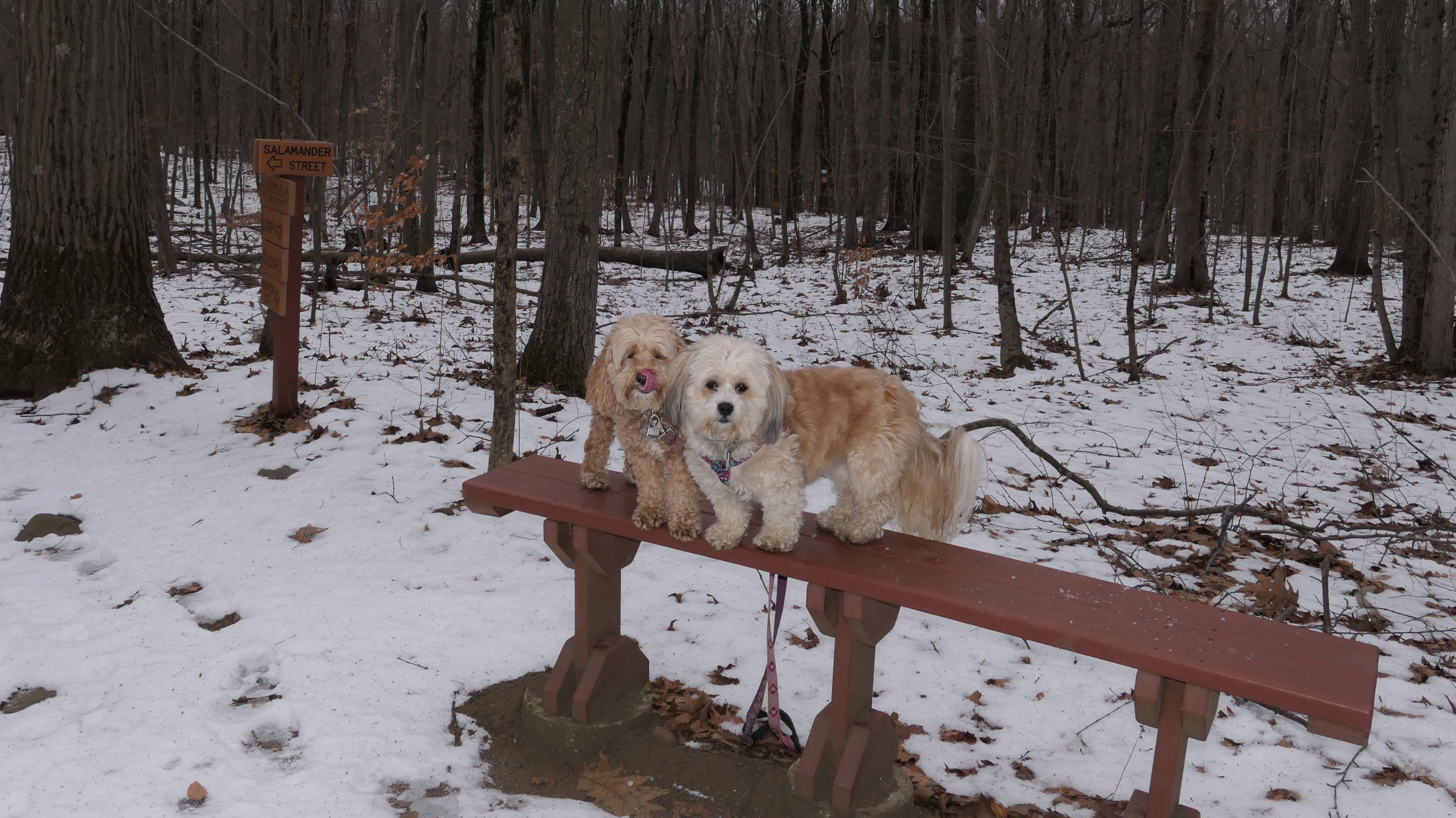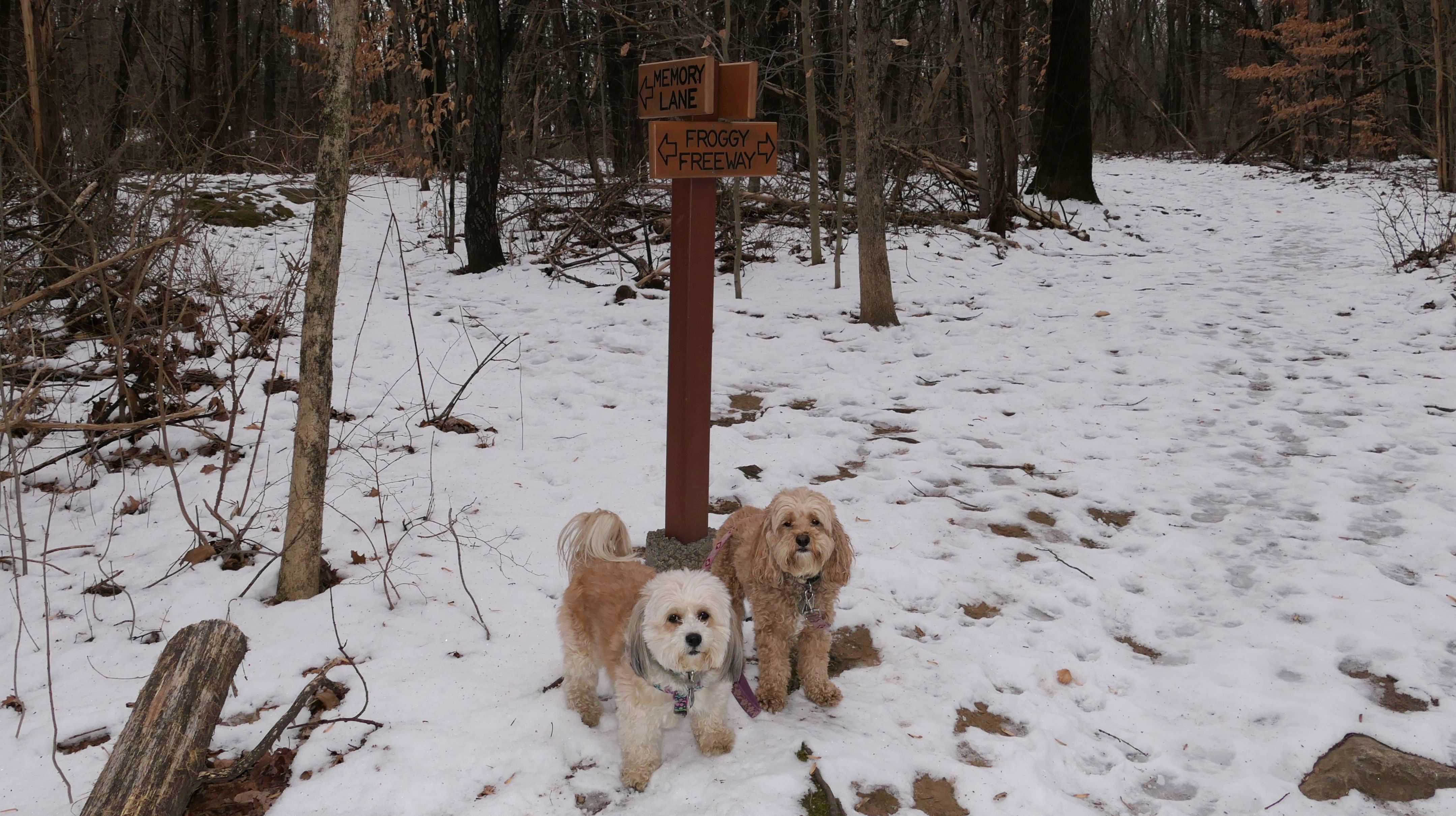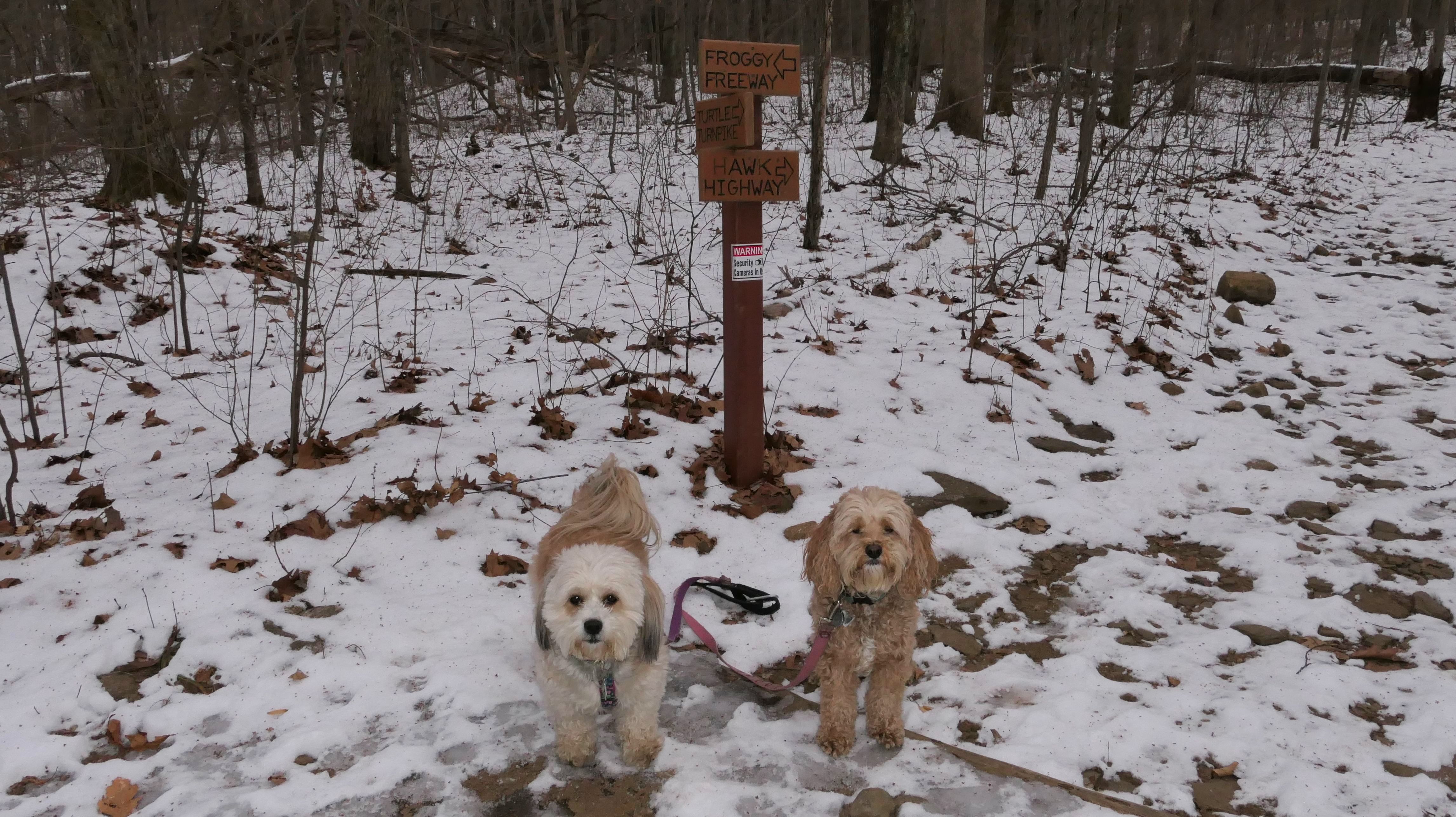 Not to be confused with Webb Mountain Park, Webb Mountain Discovery Zone is an area down the road from the main park, that is tailored for kids. There is a "scavenger hunt", with educational signs that explain the geography and the nature of the area. There are signs along the trail, complete with cutesy names for the different sections of the trail, such as Turtle Turnpike, Froggy Freeway, and Hawk Highway, among others. Some of the terrain is hilly and rocky and might be tough for kids, but there are plenty of benches along the way. Toward the end of our hike, we encountered a group of what I think was Brownies, with their Scout Master. It turns out they were on an educational trip, and one of the things they noticed were fresh paw prints in the snow. Turns out they were tracking Mandy and Lexi!