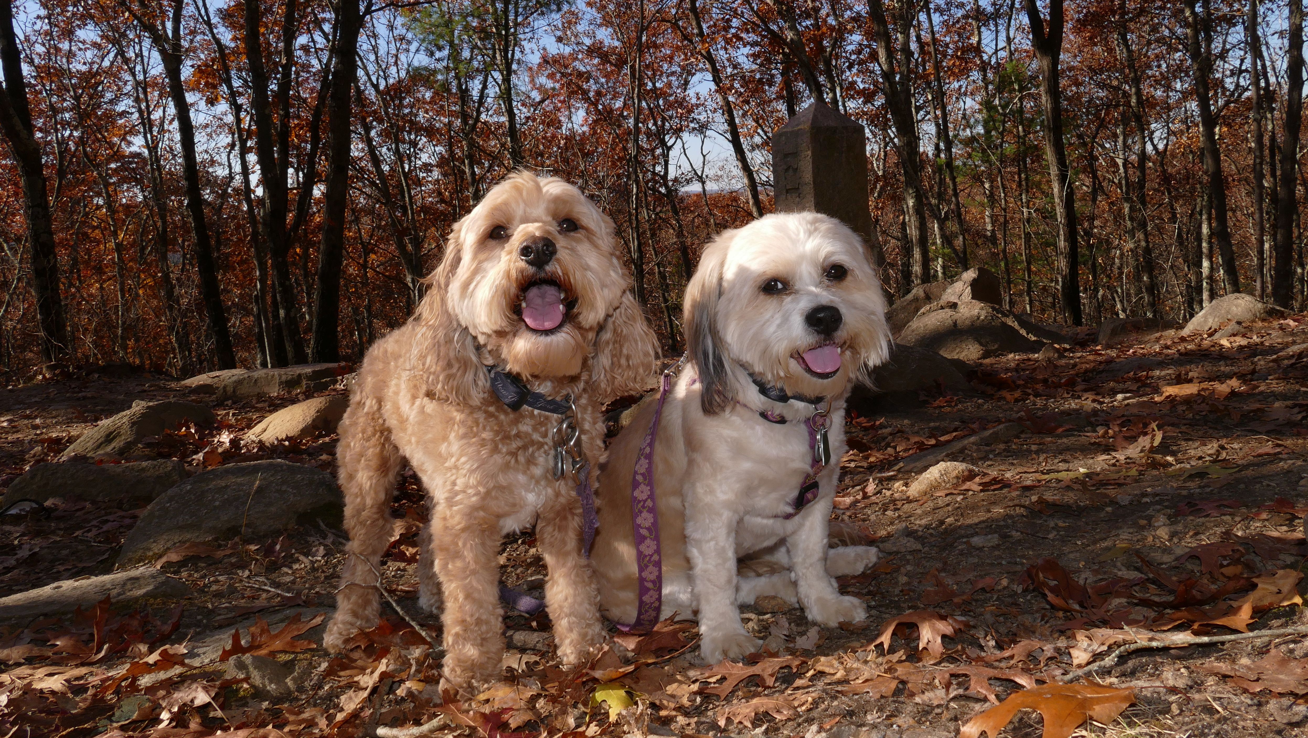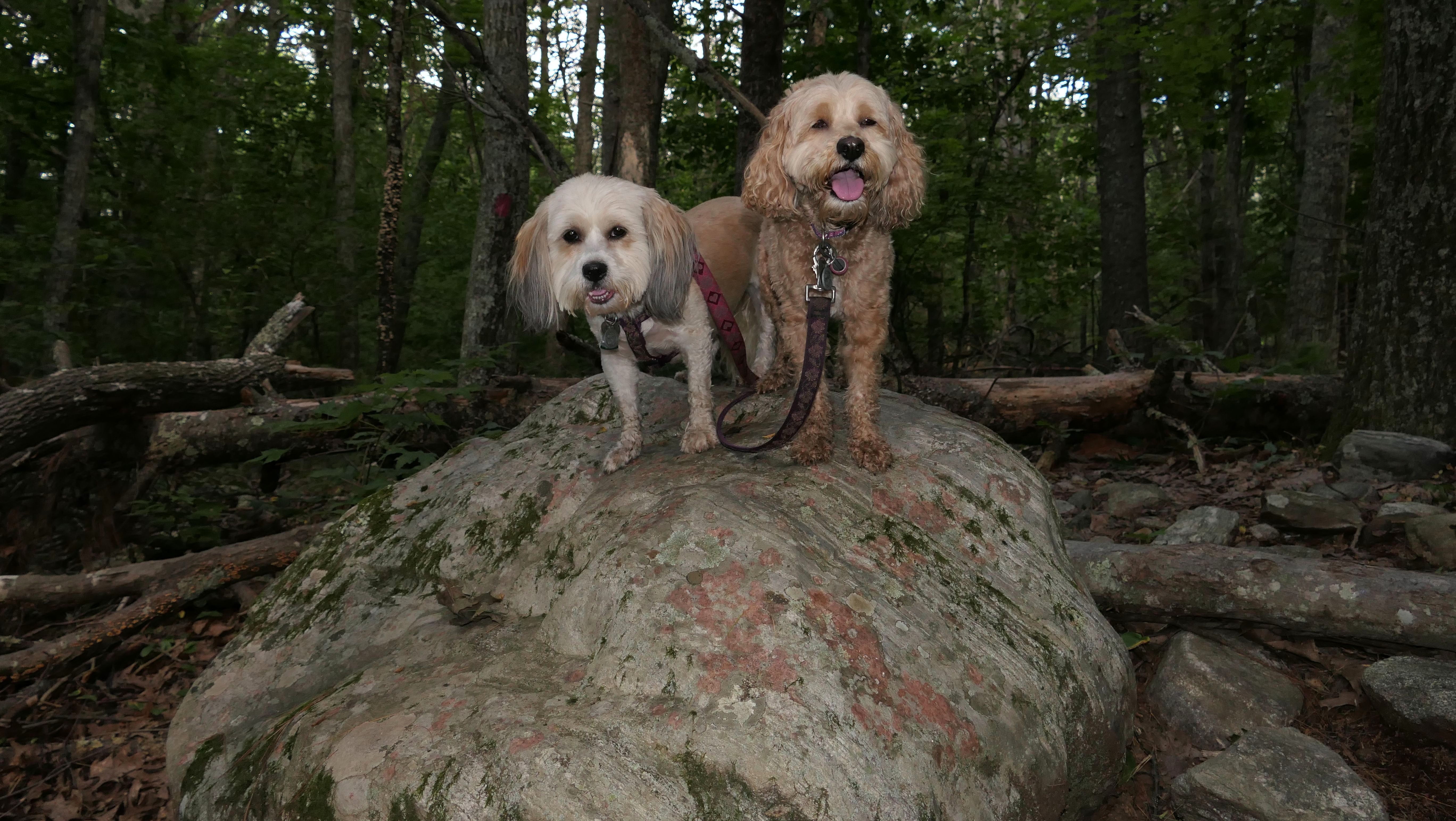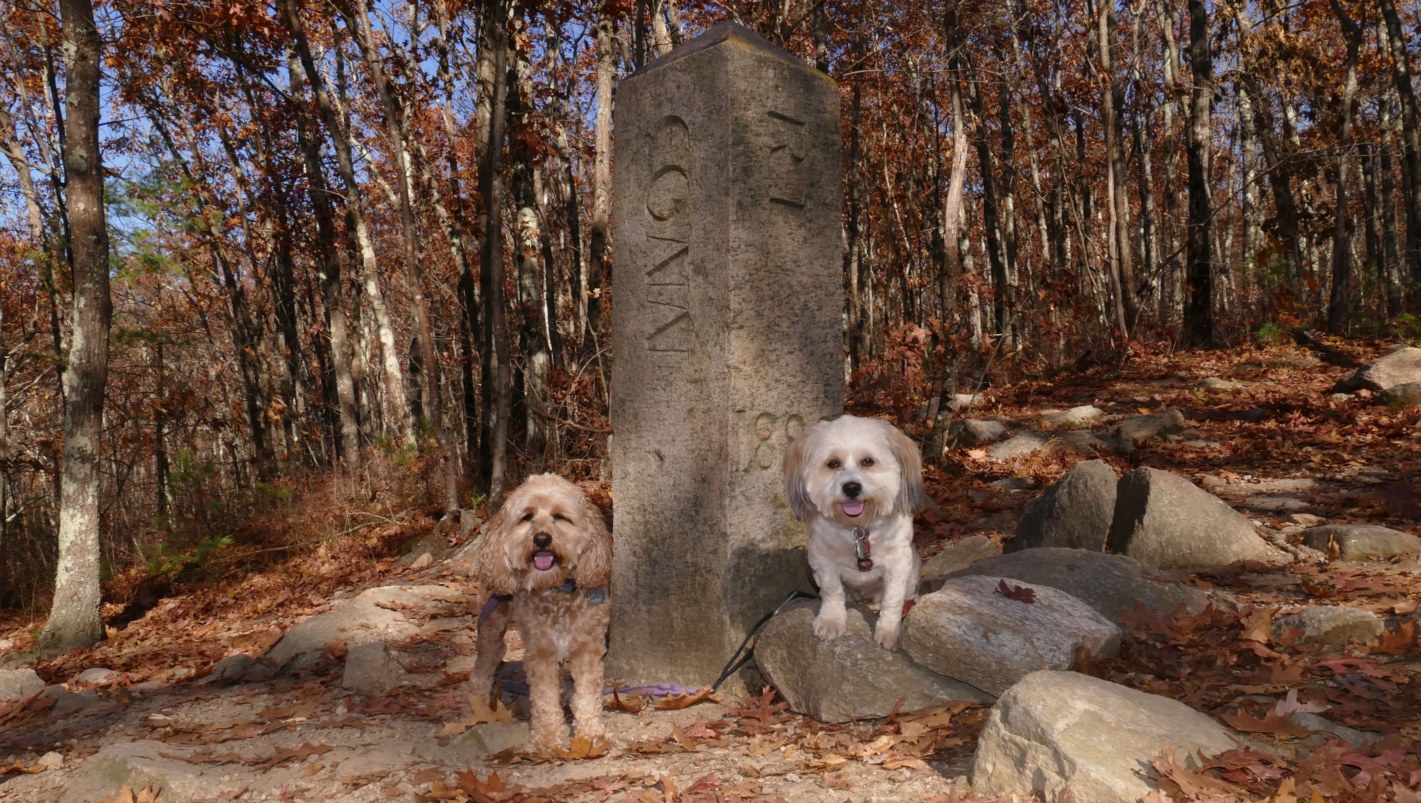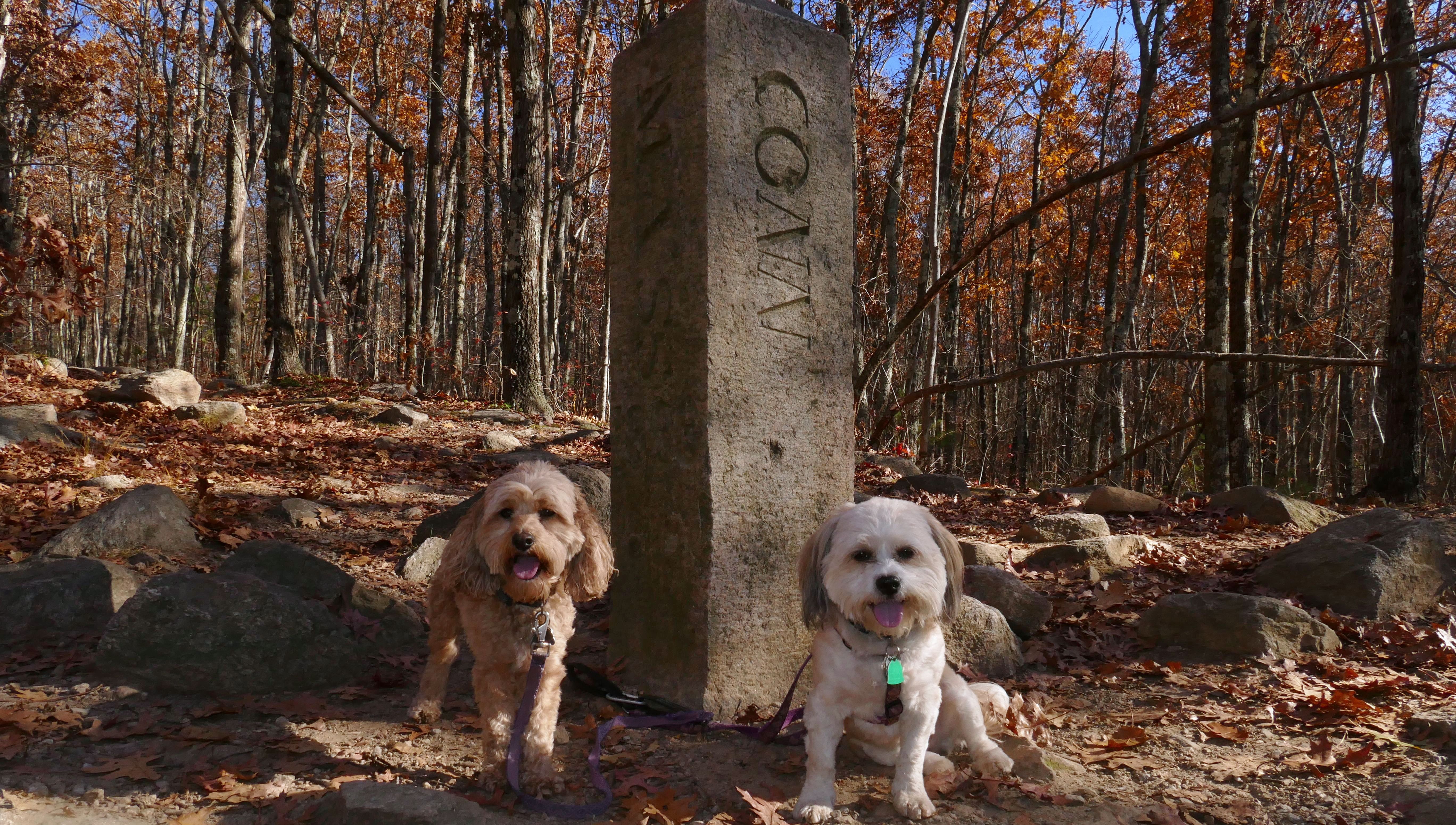 This is a cool hike to the corner of where three states intersect. We start from the Air-Line trail, and then hike up a pretty steep hill. We arrive at the peak and there is a marker to indicate the borders of Connecticut, Massachusetts and Rhode Island I know it's really silly, but I kept posing the dogs so that one of them would be standing in one state, and the other one would be in another state, until I got every combination.