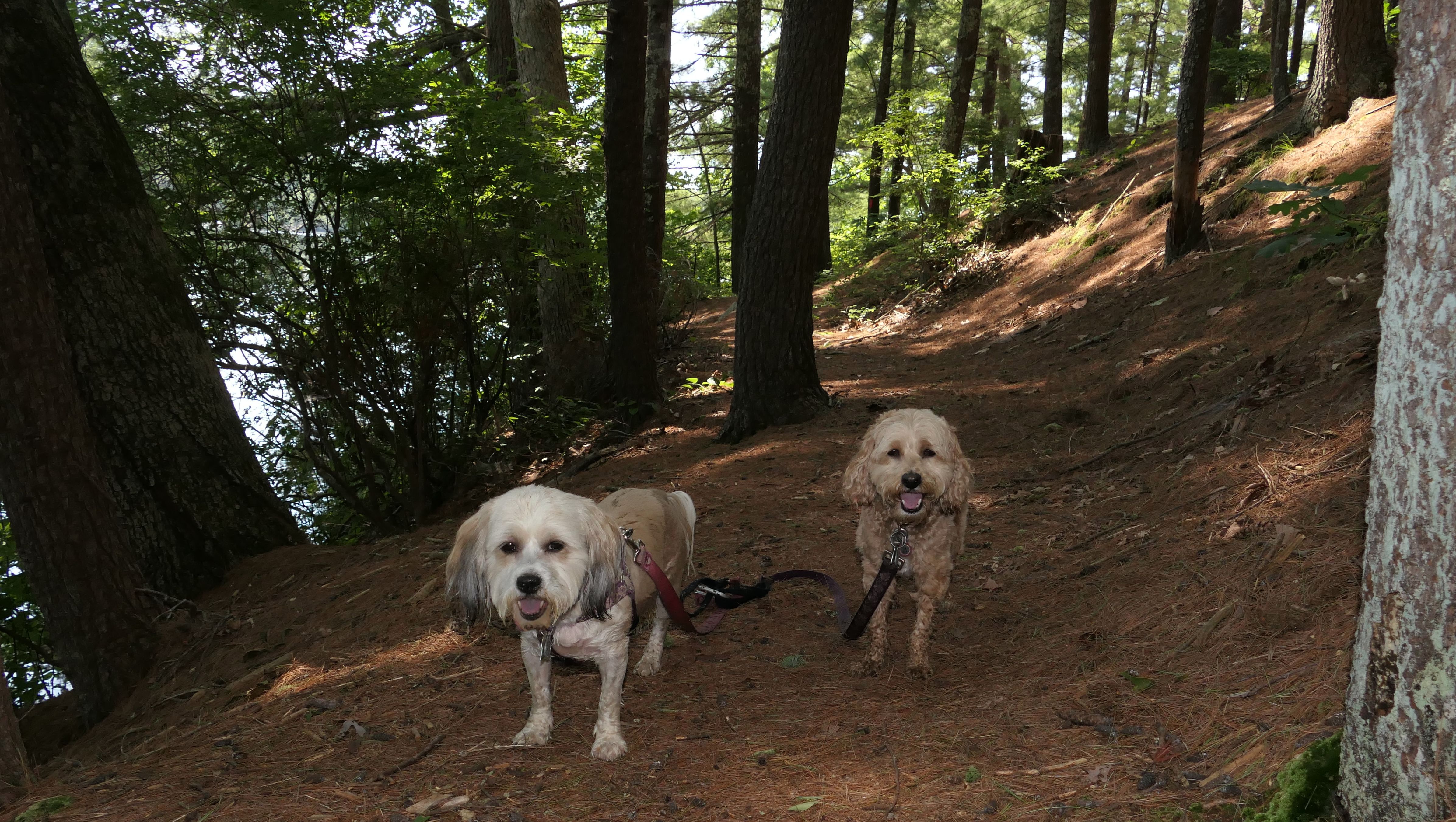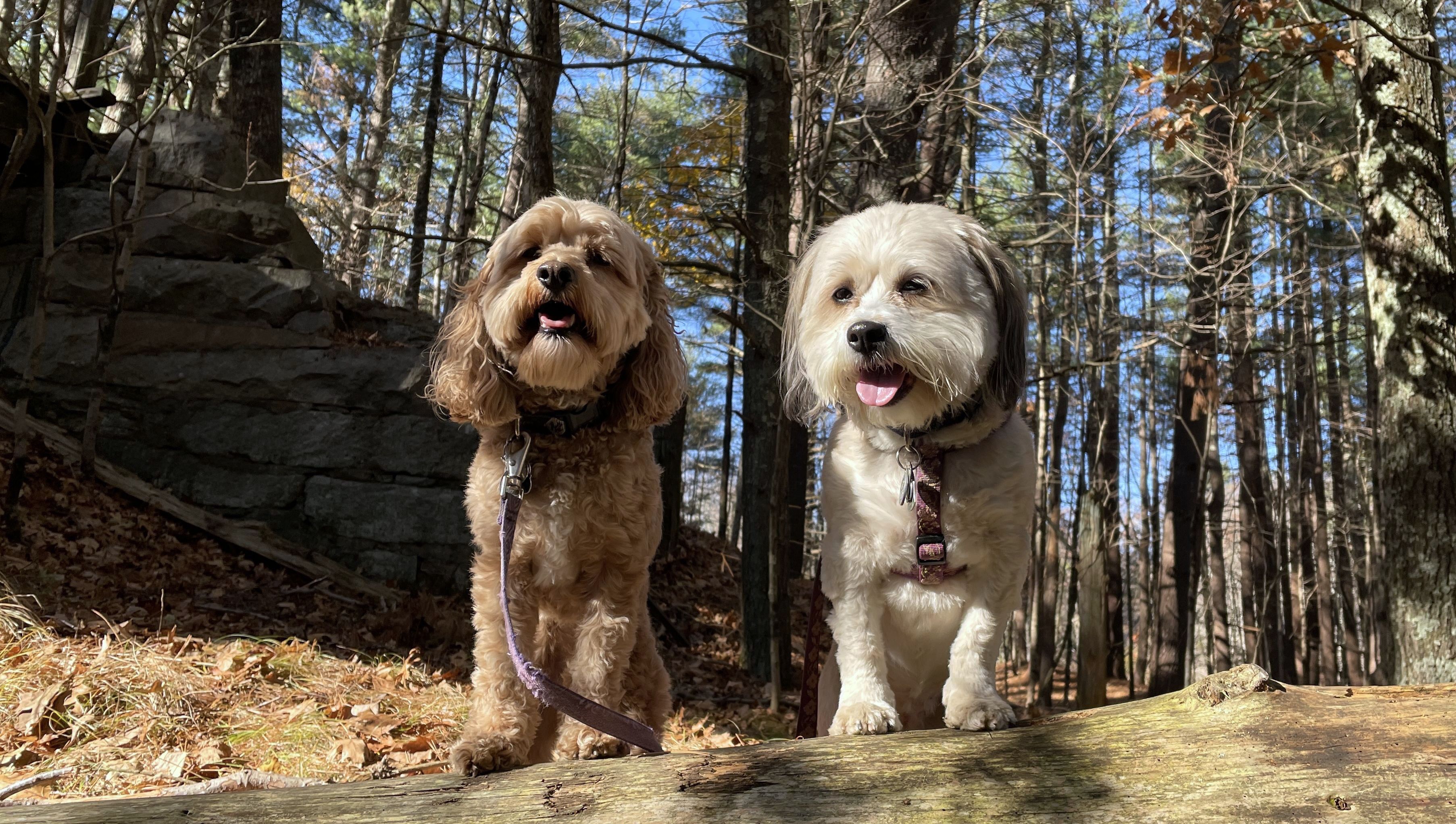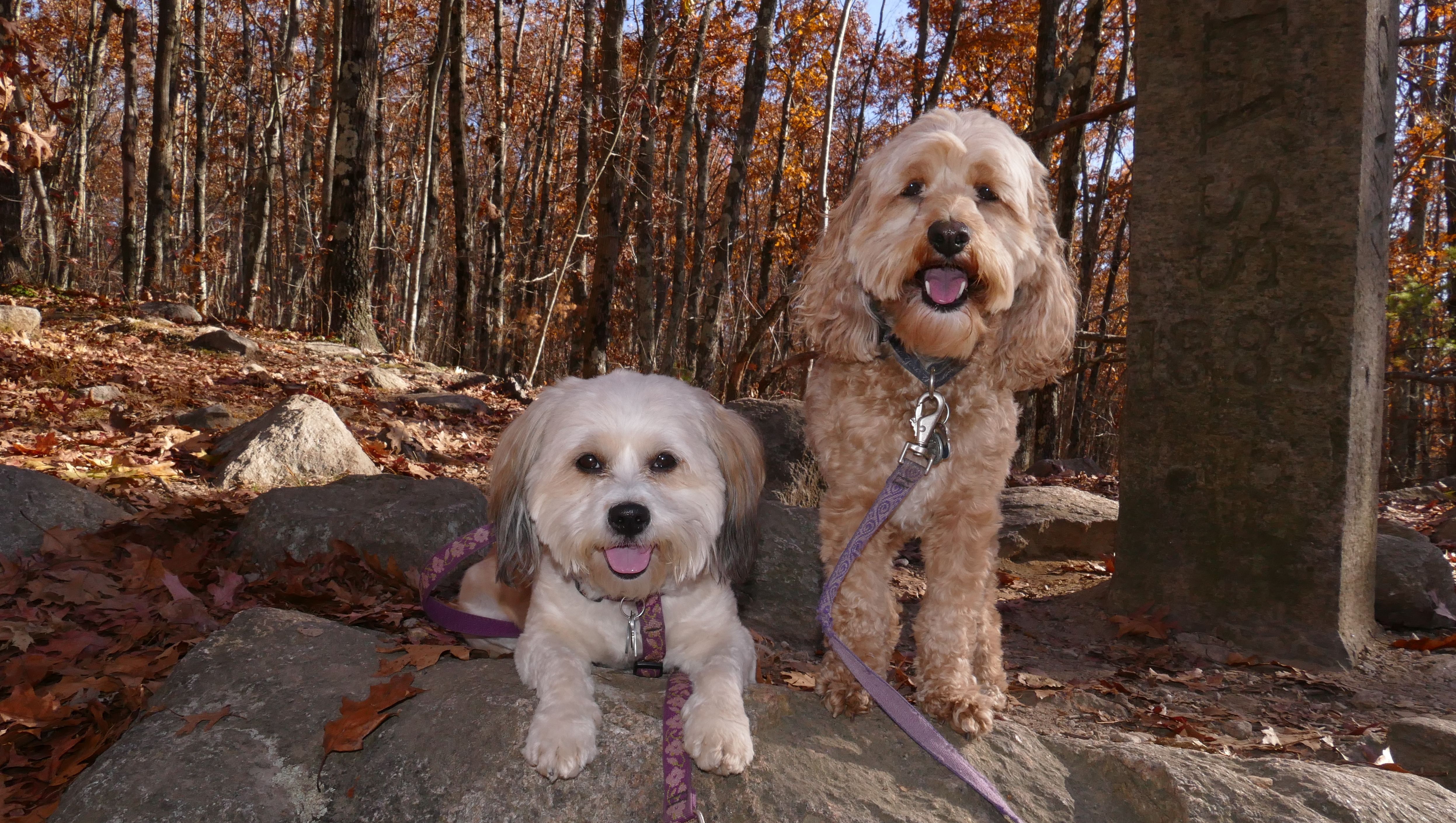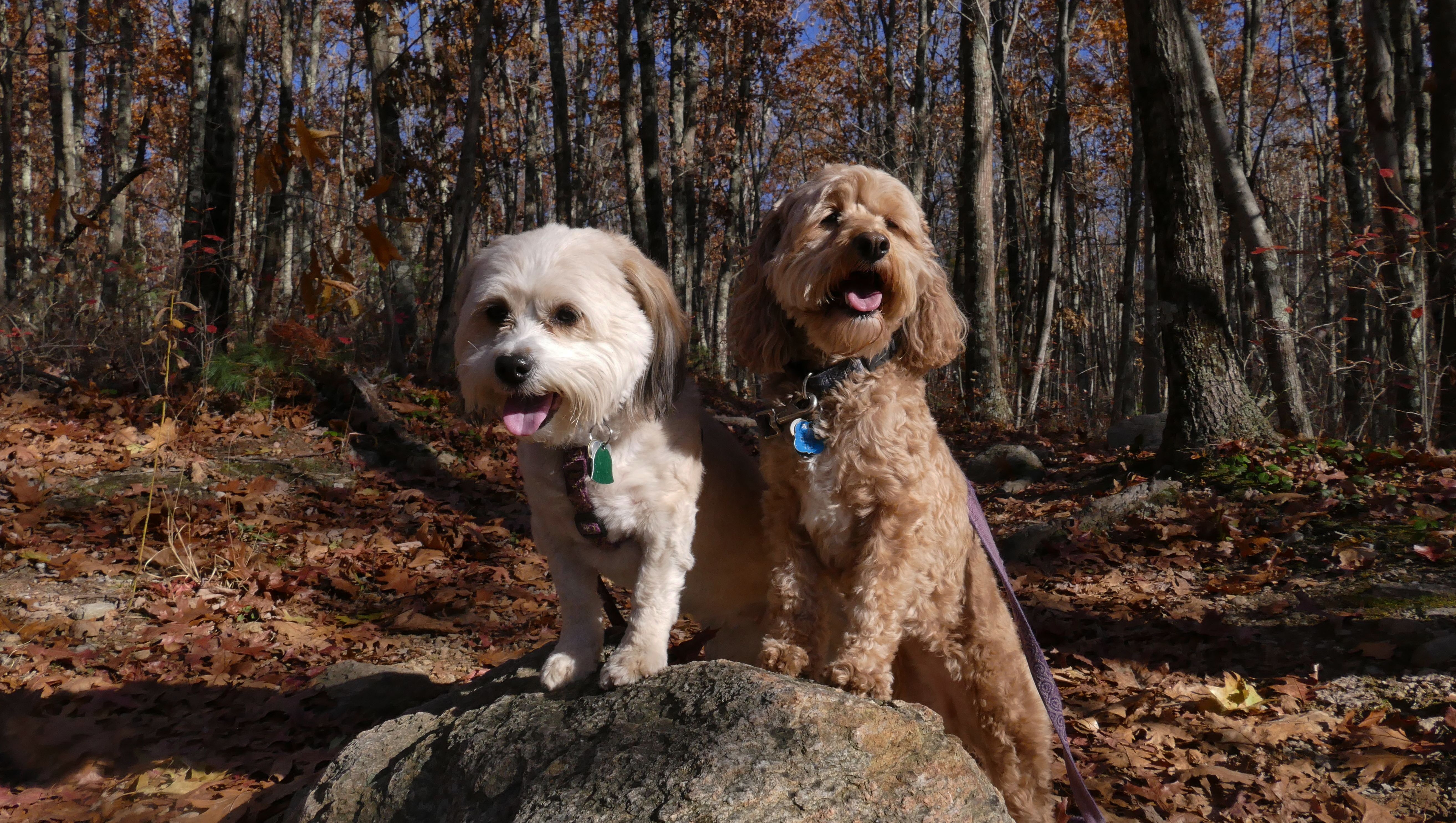This is a cool hike to the corner of where three states intersect. We start from the Air-Line trail, and then hike up a pretty steep hill. We arrive at the peak and there is a marker to indicate the borders of Connecticut, Massachusetts and Rhode Island I know it's really silly, but I kept posing the dogs so that one of them would be standing in one state, and the other one would be in another state, until I got every combination.