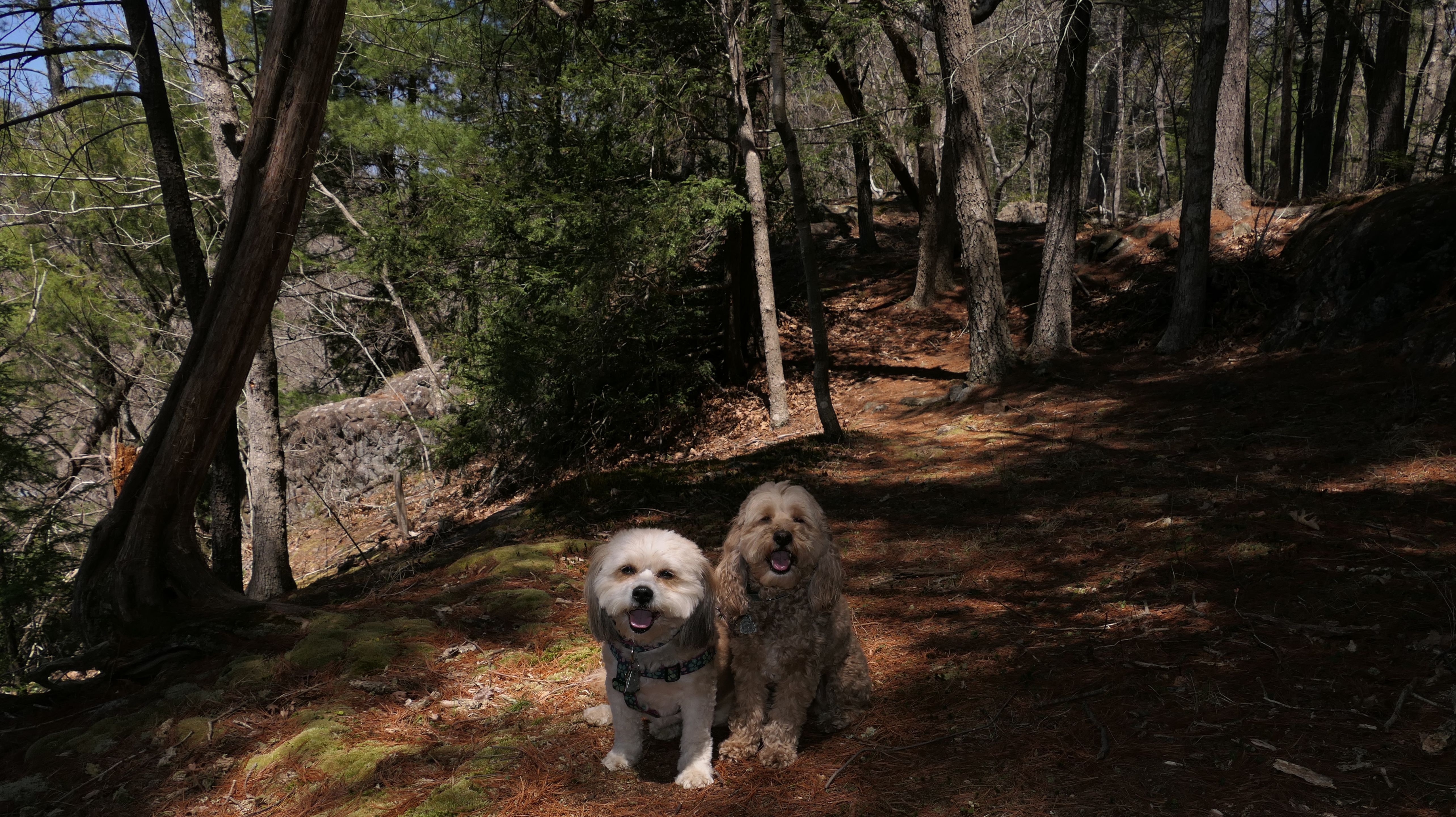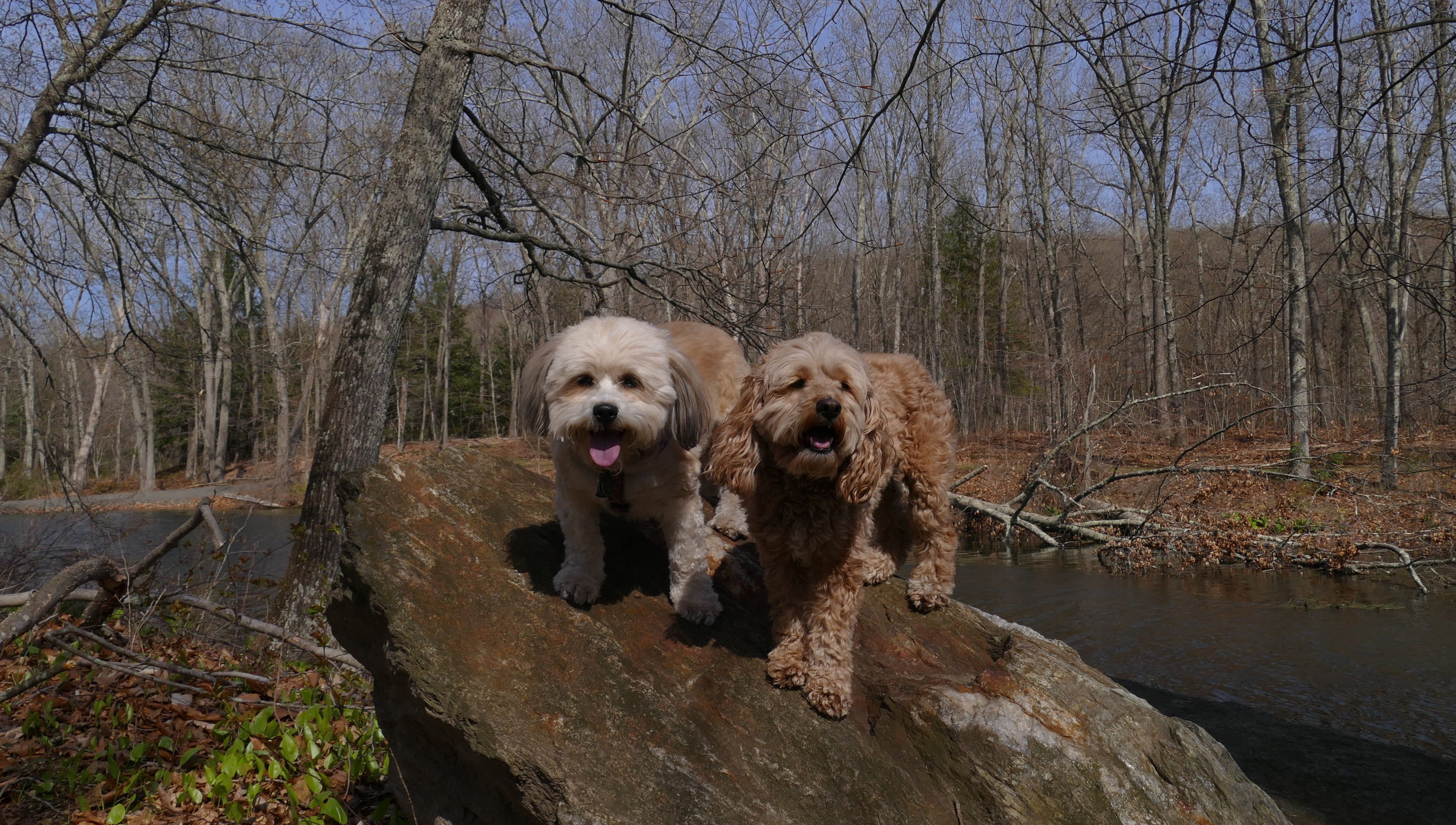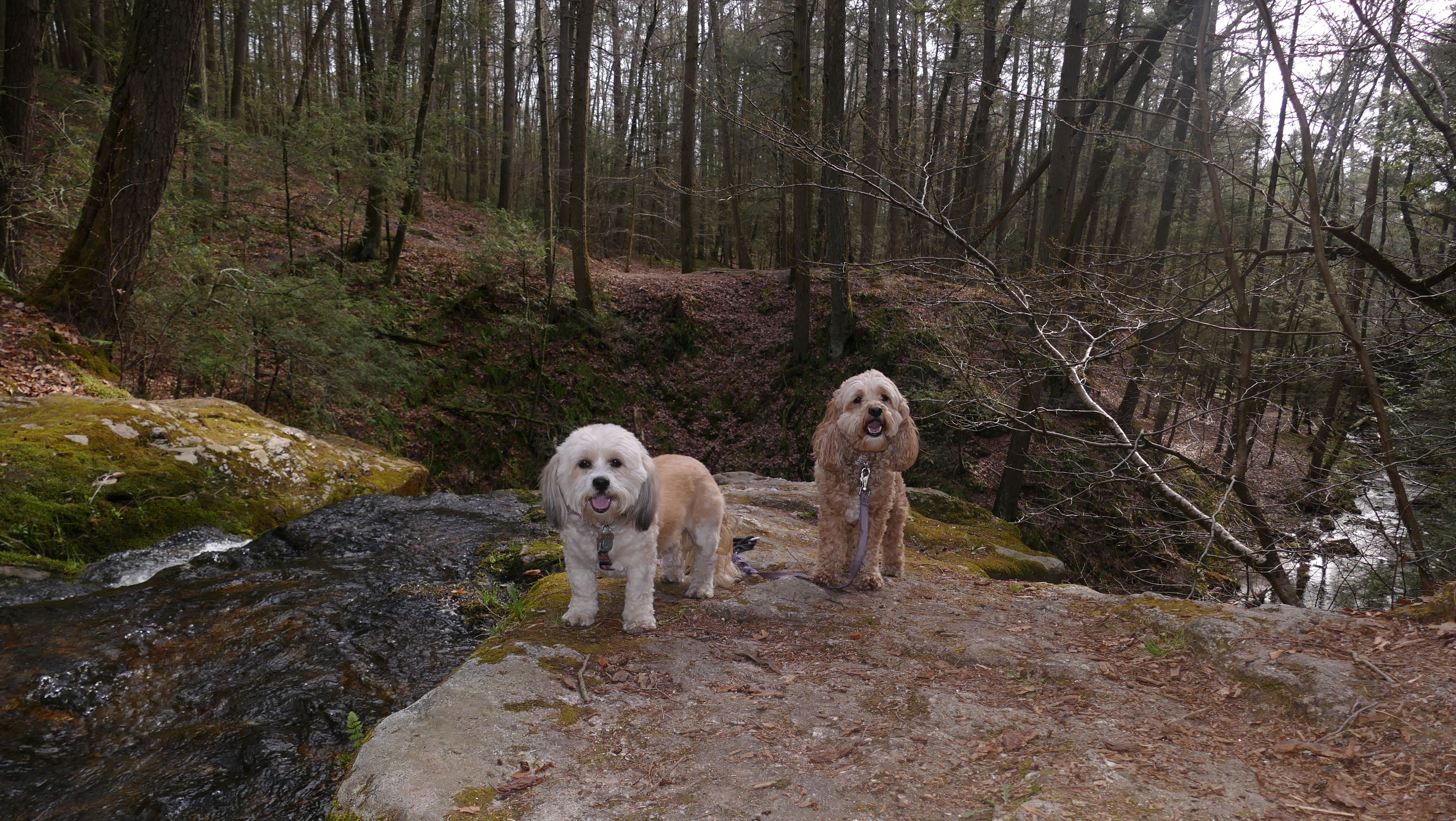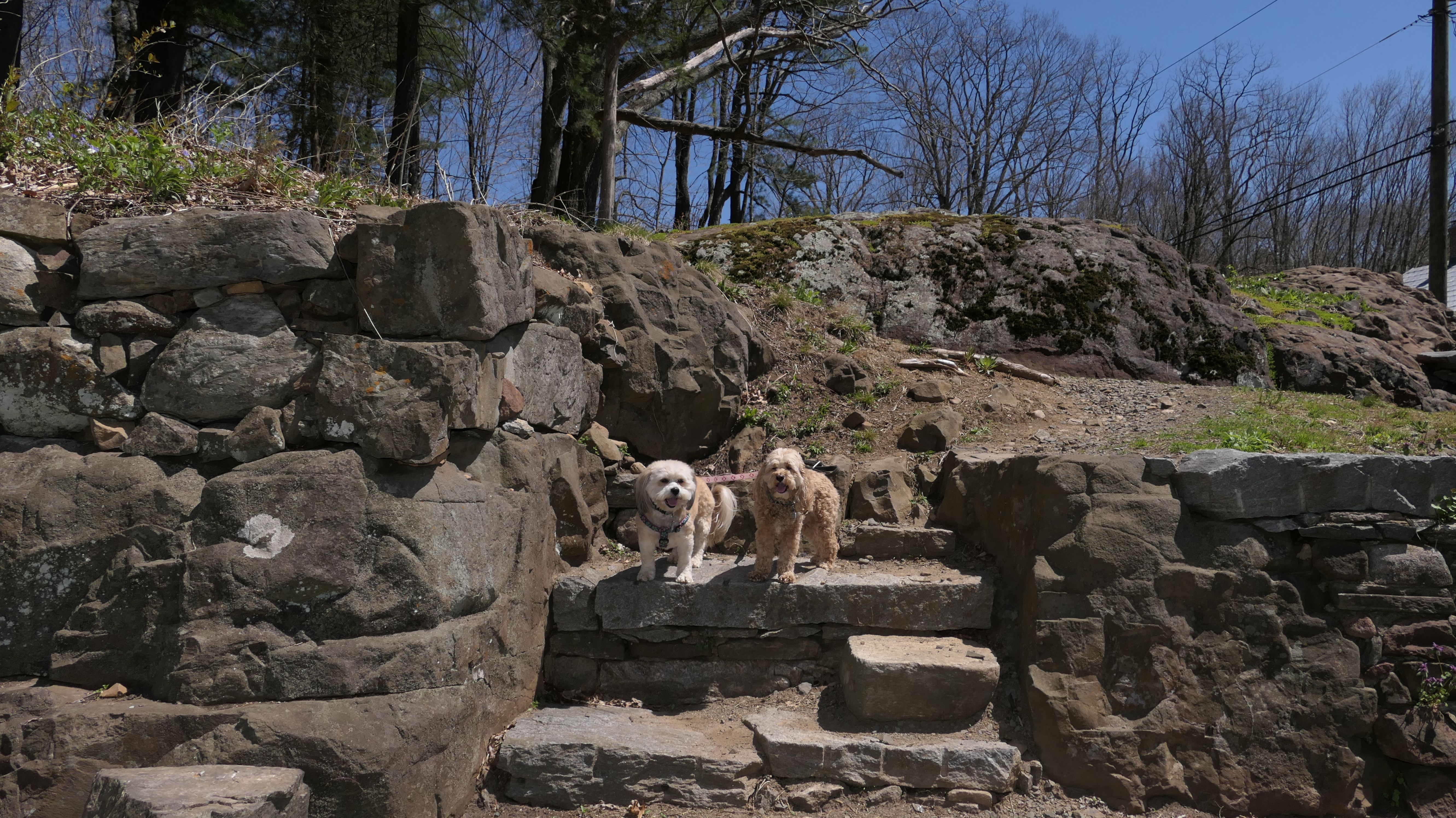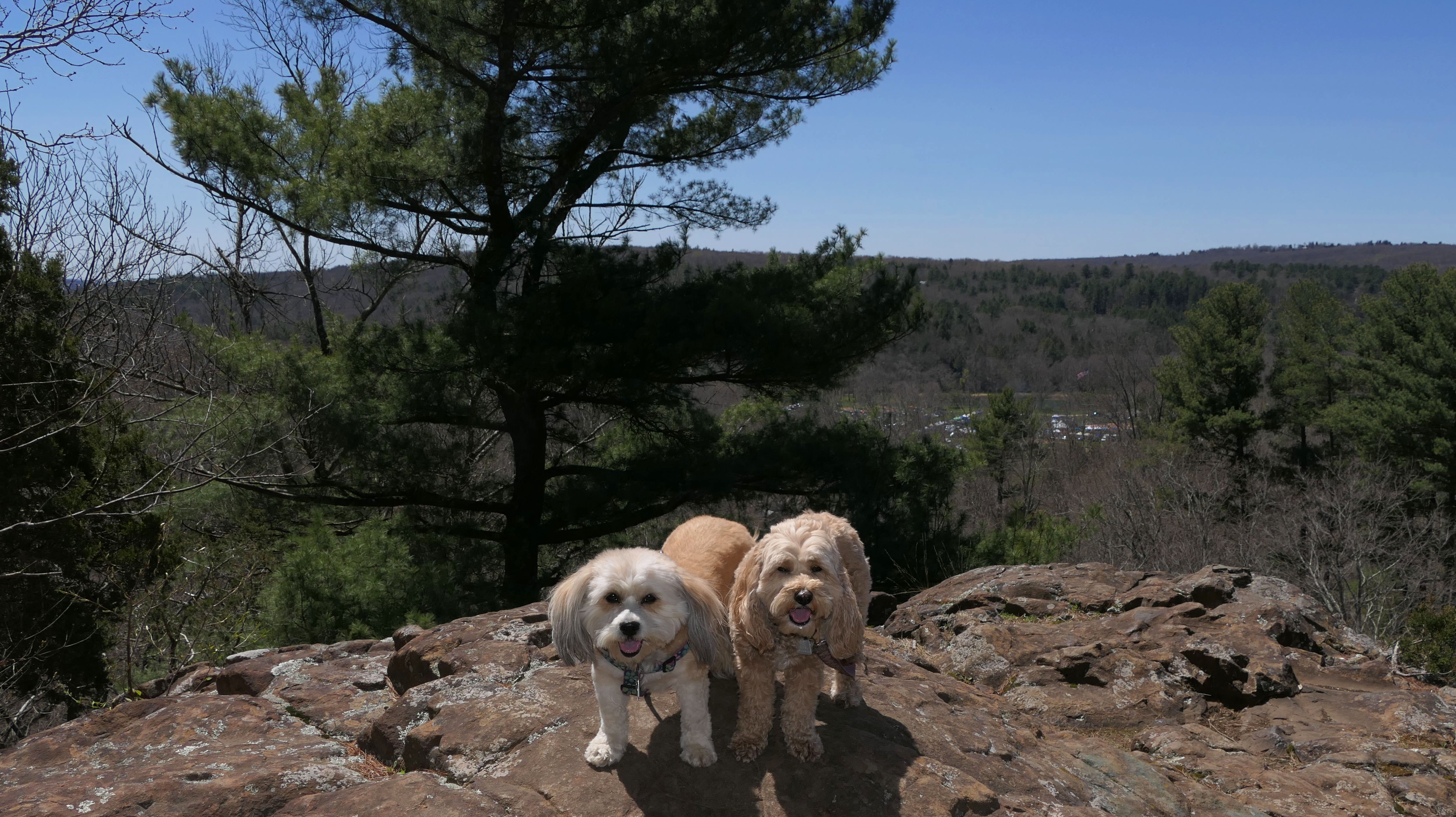 This was a fun hike up Orenaug Hill. There are side trails that go right up to the edge of large cliffs, that provide outstanding views. At one point, we could see the festival tents from the Earth Day Festival being held at nearby Hollow Park. At the top of the hill is a fire tower. The tower isn't blocked, you can climb the stairs to get to the top, but I wasn't going to try that with the dogs in tow.